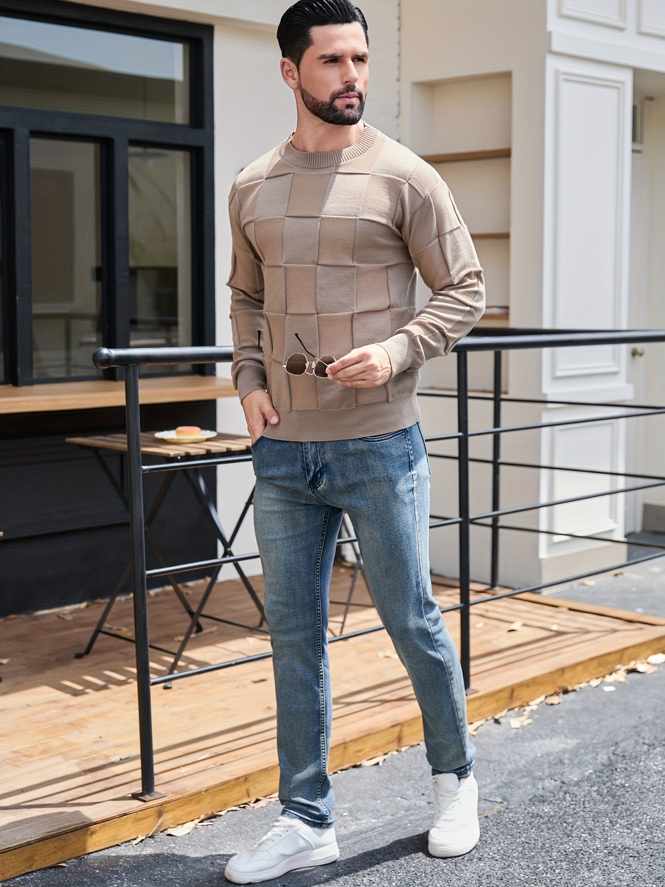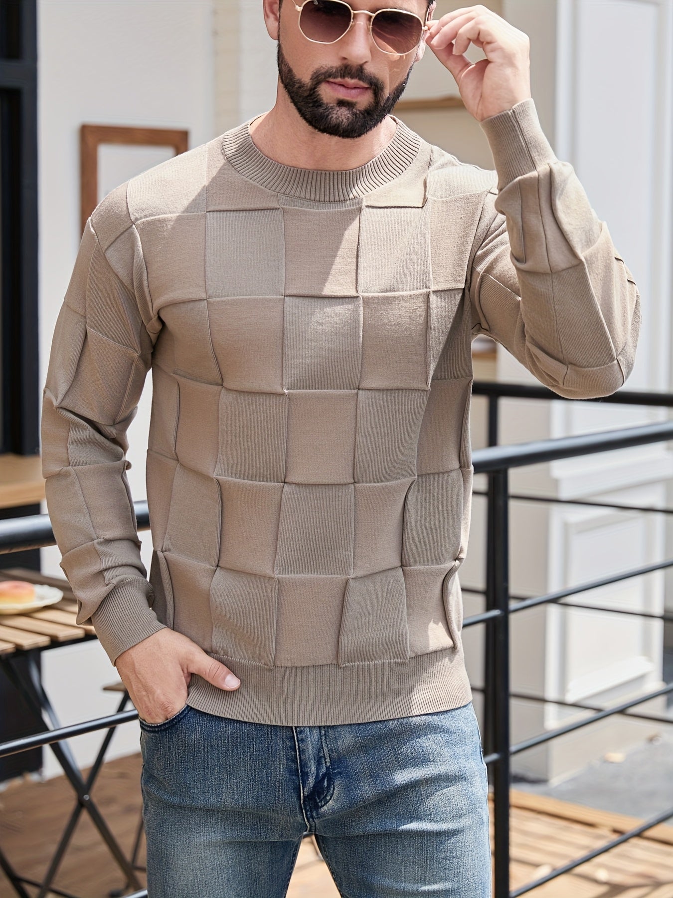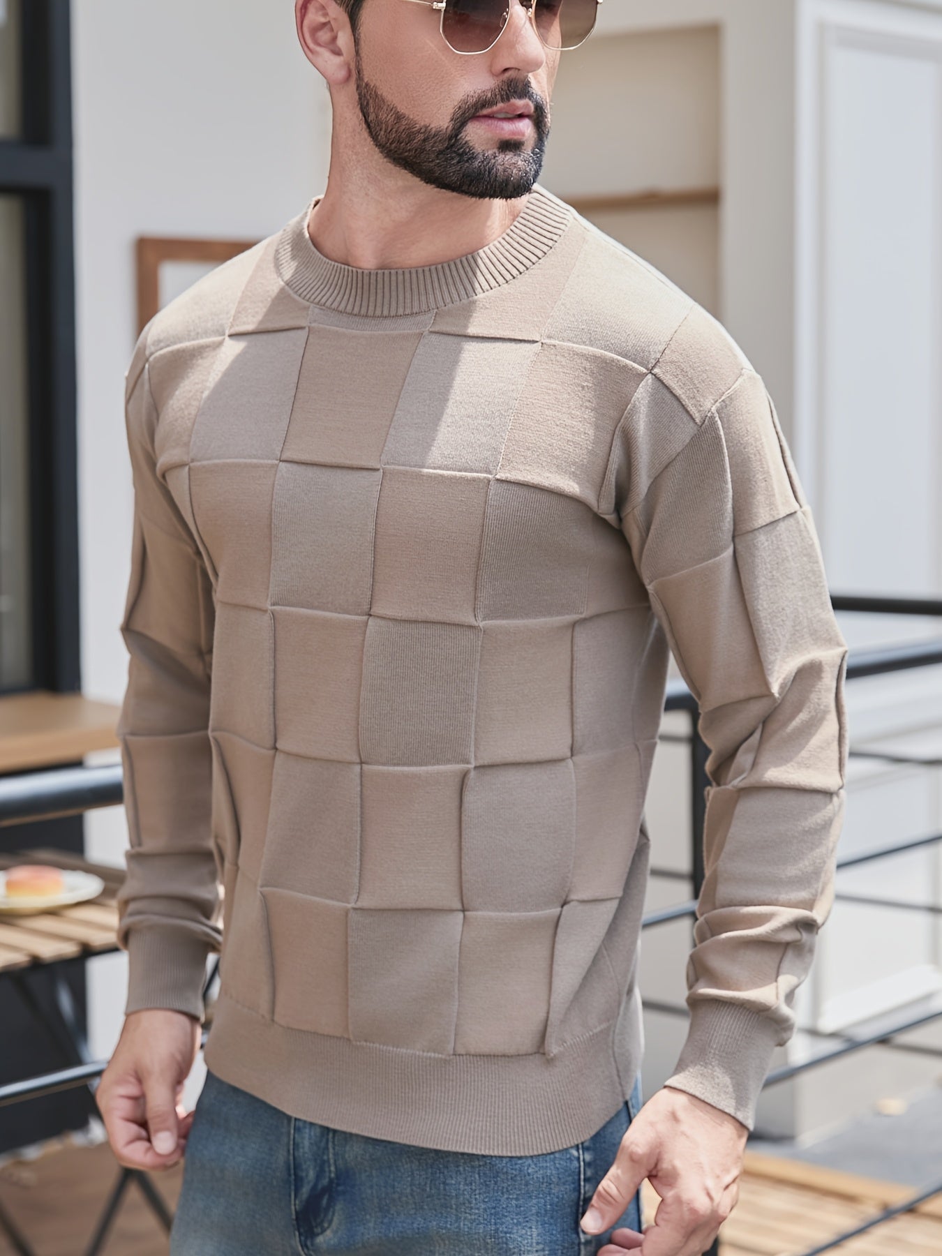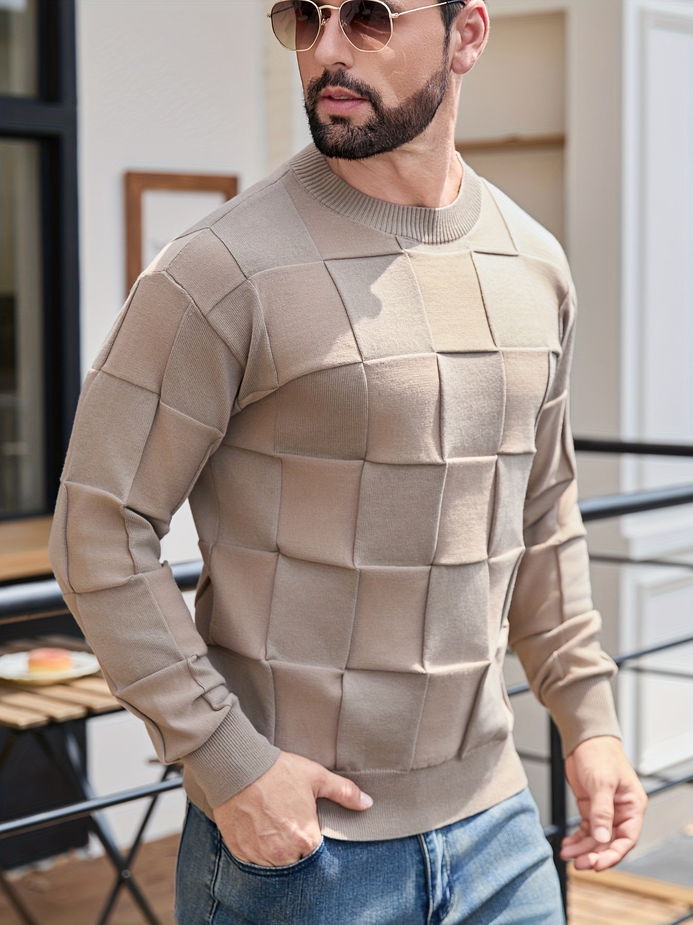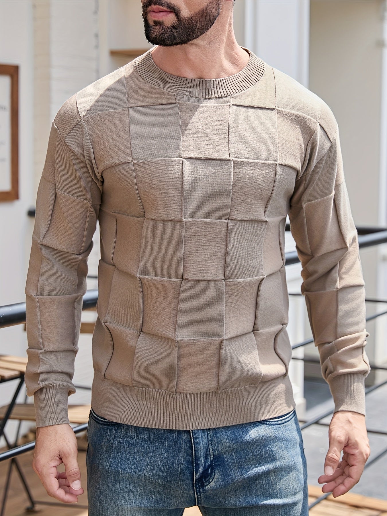 Տղամարդու կլոր վզնոցով, տեքստուրավորված երկրաչափական նախշերով, միագույն սվիտեր, աշնանային և ձմեռային նորաձև երկարաթև սվիտեր