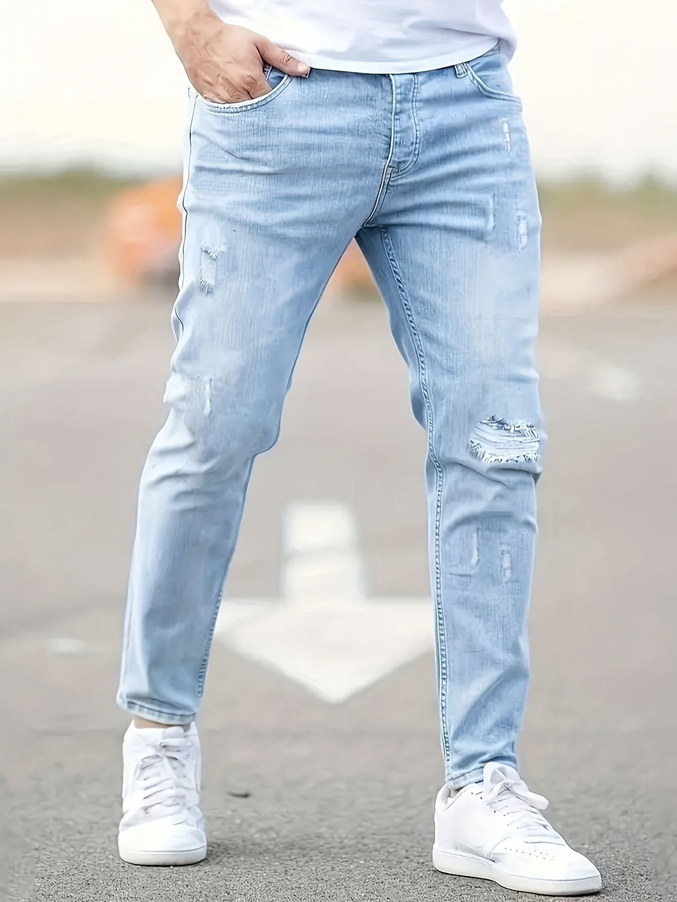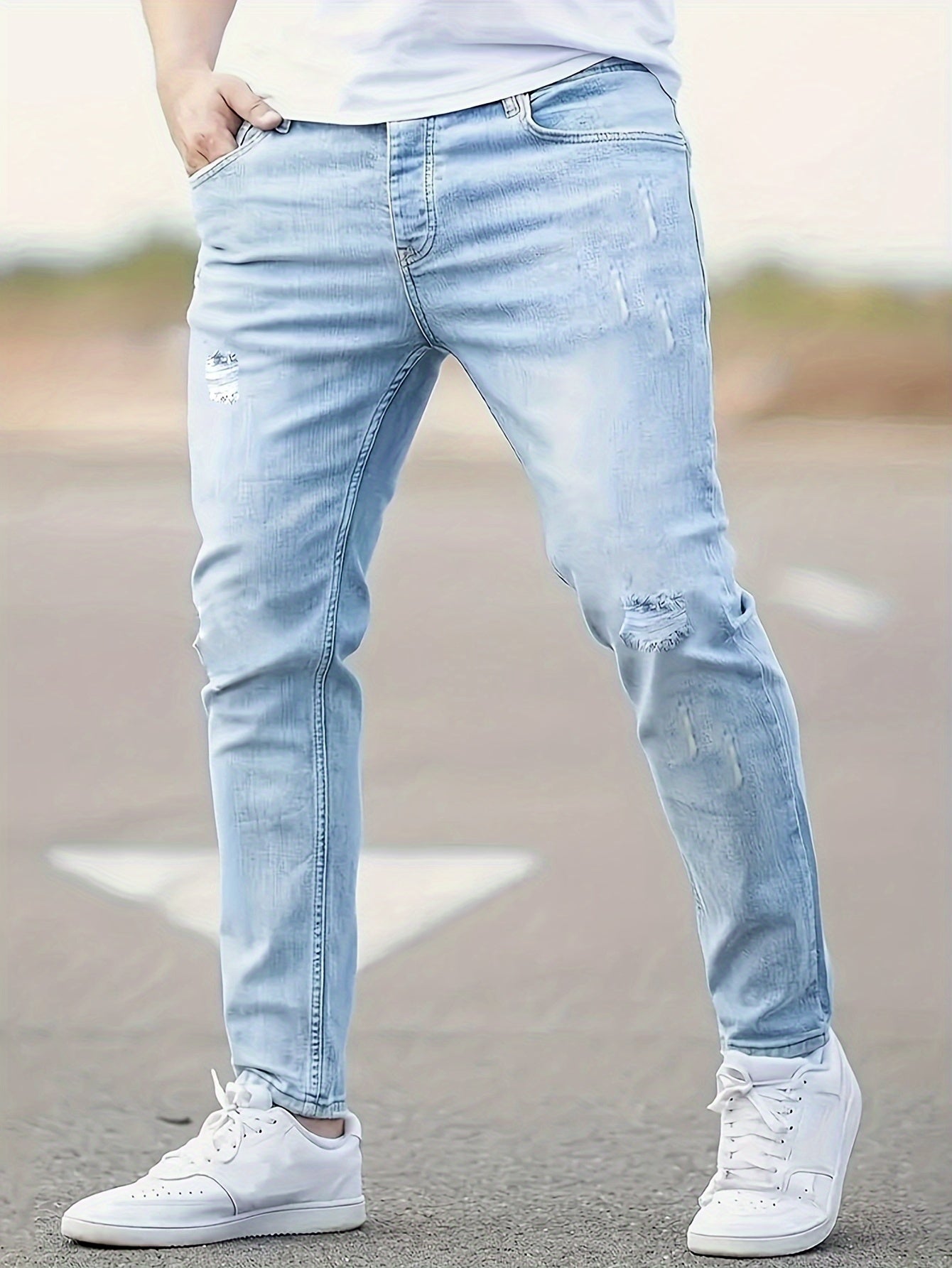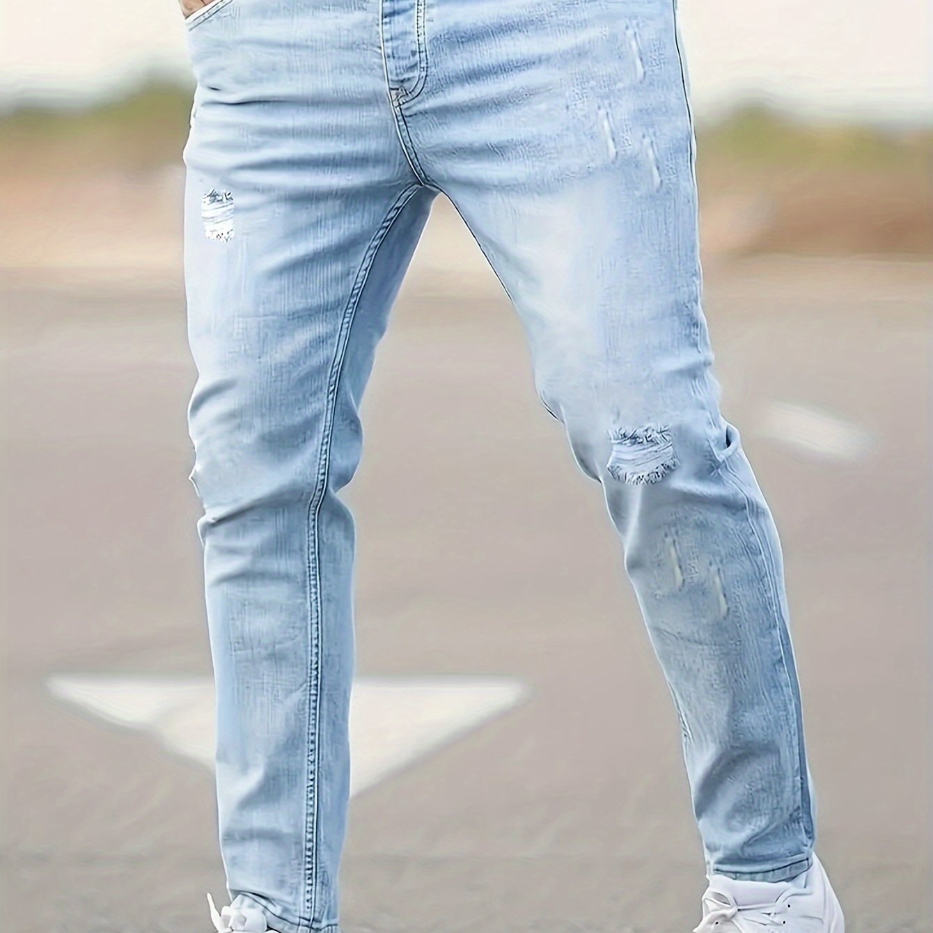 Տղամարդկանց բարակ ձգվող ջինսե ջինսեր - բաց կապույտ պատռված դիզայն, ամենօրյա փողոցային հագուստի ոճ, բամբակյա խառնուրդ, բոլոր սեզոնային հագուստ, ցածր վերարկու ջինսեր