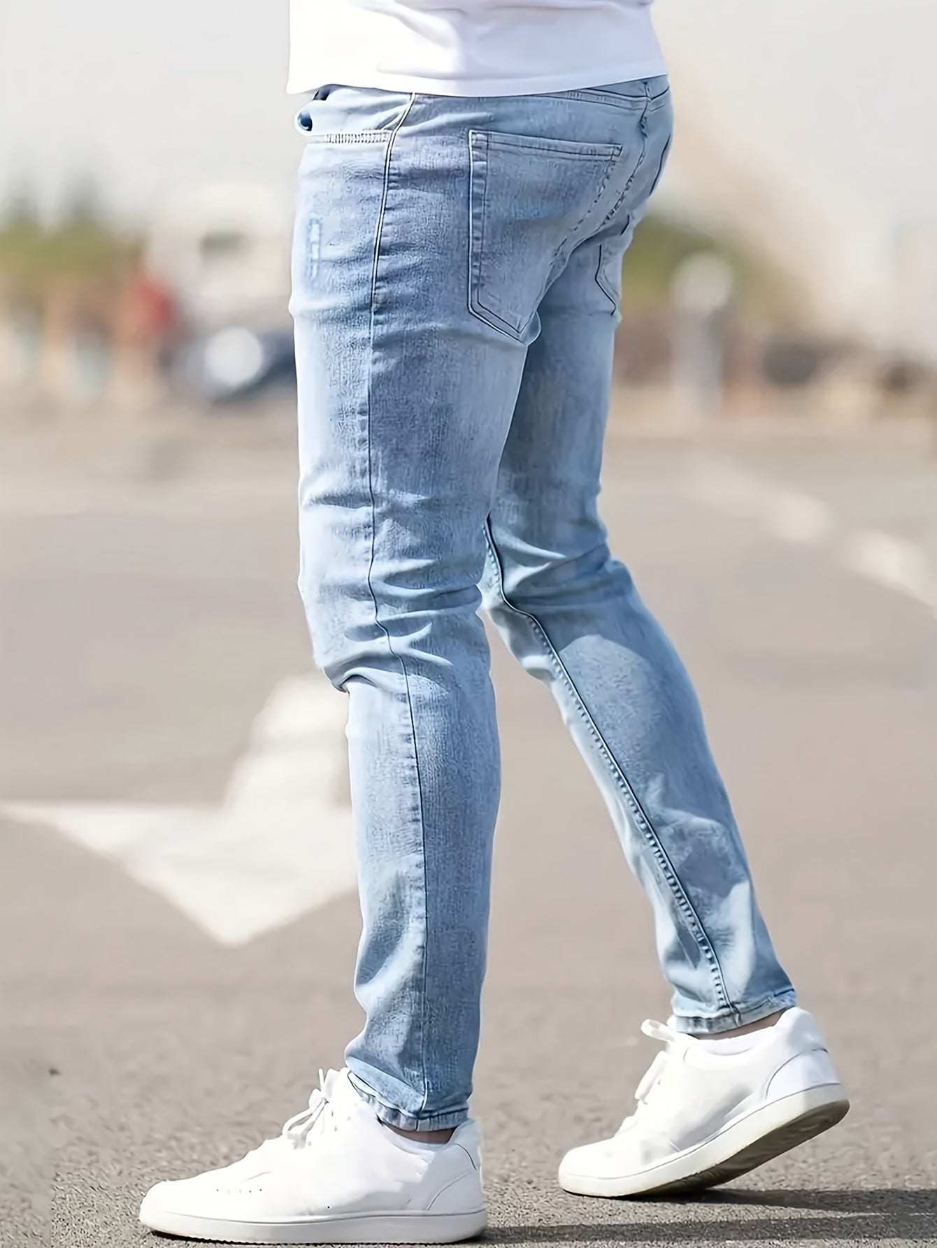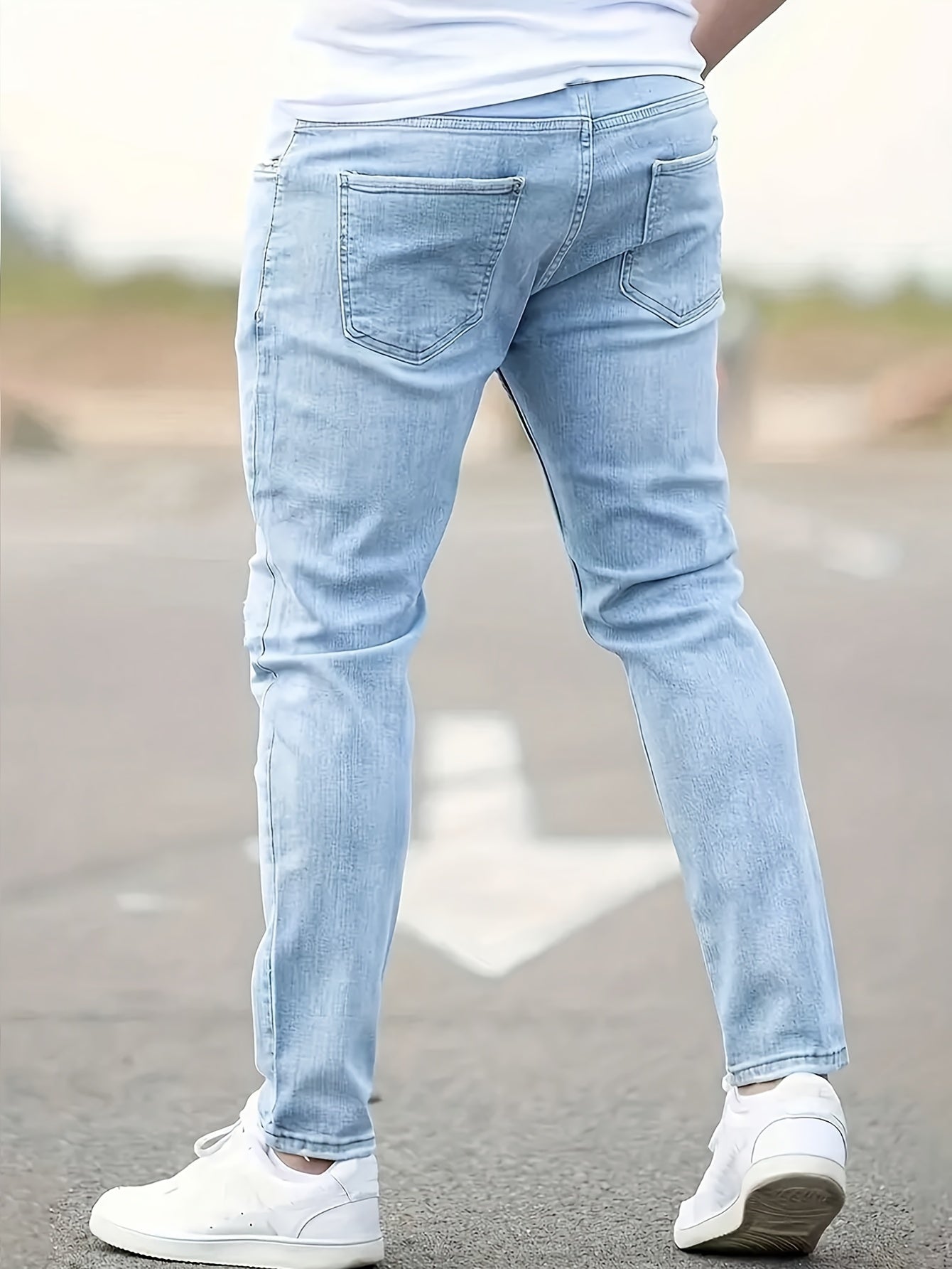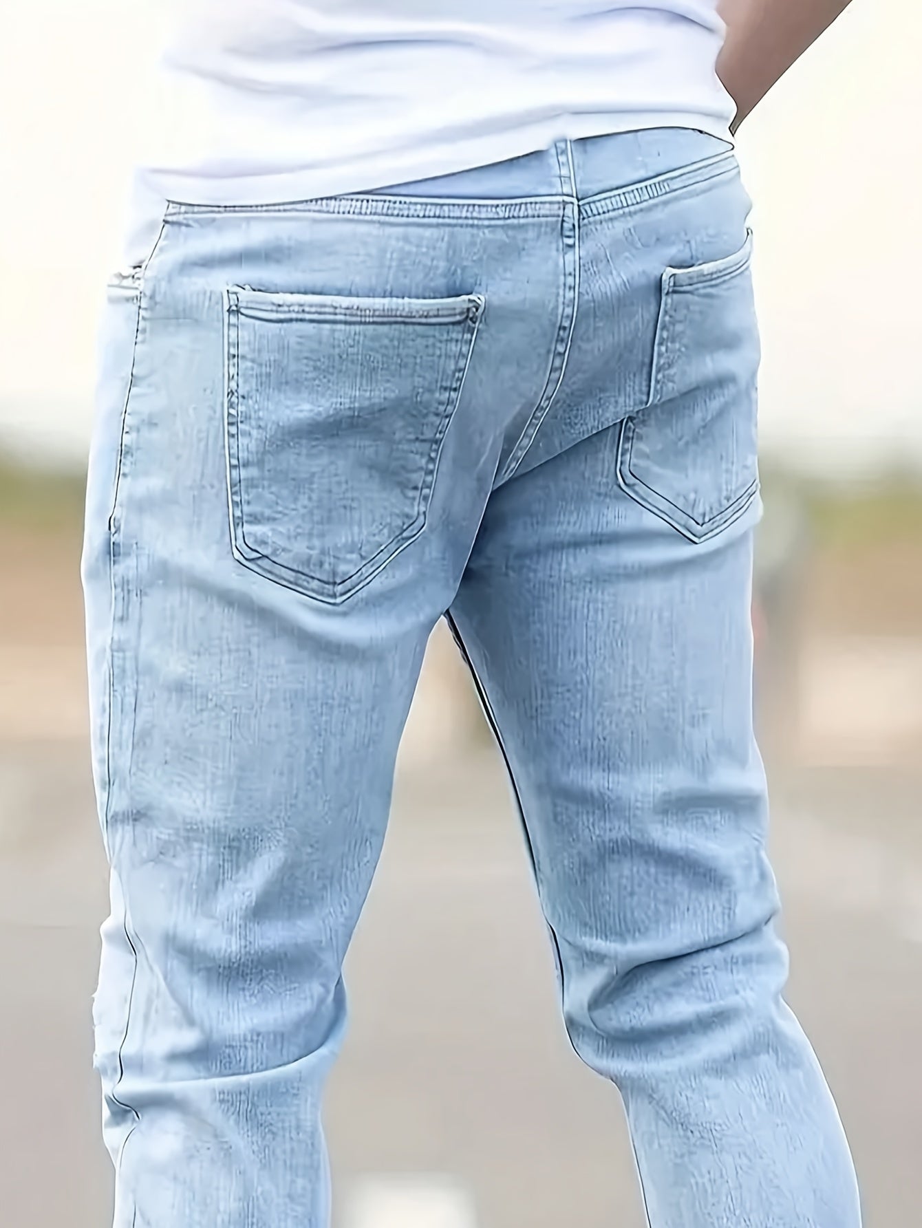 Տղամարդկանց բարակ ձգվող ջինսե ջինսեր - բաց կապույտ պատռված դիզայն, ամենօրյա փողոցային հագուստի ոճ, բամբակյա խառնուրդ, բոլոր սեզոնային հագուստ, ցածր վերարկու ջինսեր