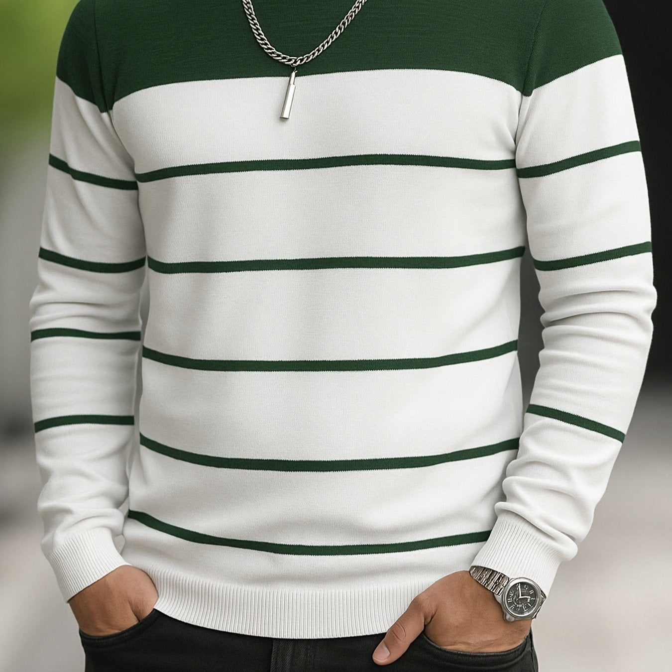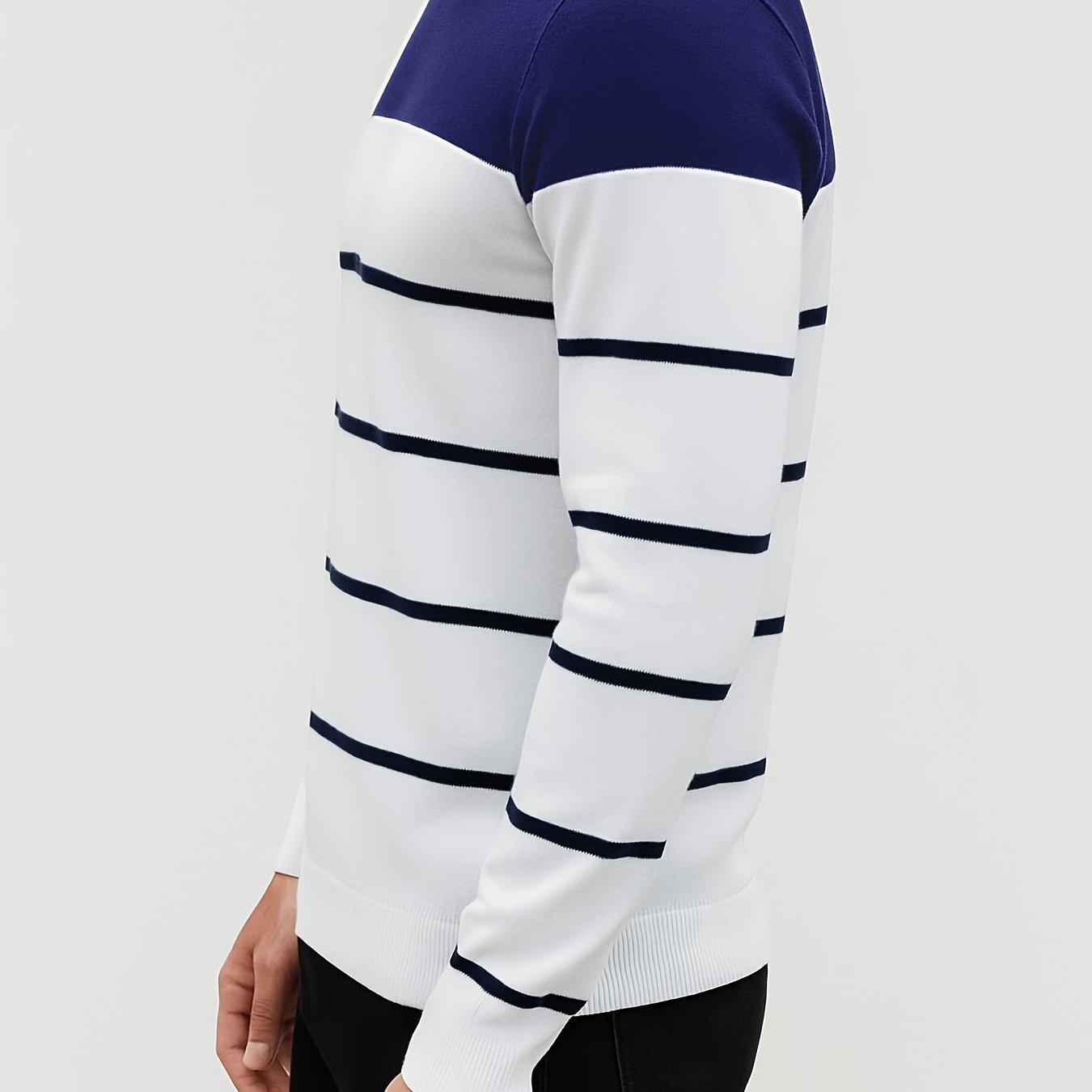 Men's Slim-Fit Striped Knit Sweater - All-Season Business Casual & Casual Attire, Navy Blue/White Horizontal Stripes with Contrast Trim, Round Neck Long Sleeve Pullover, Multi-Color Options (Black/Beige/Light Brown/Navy) - Co