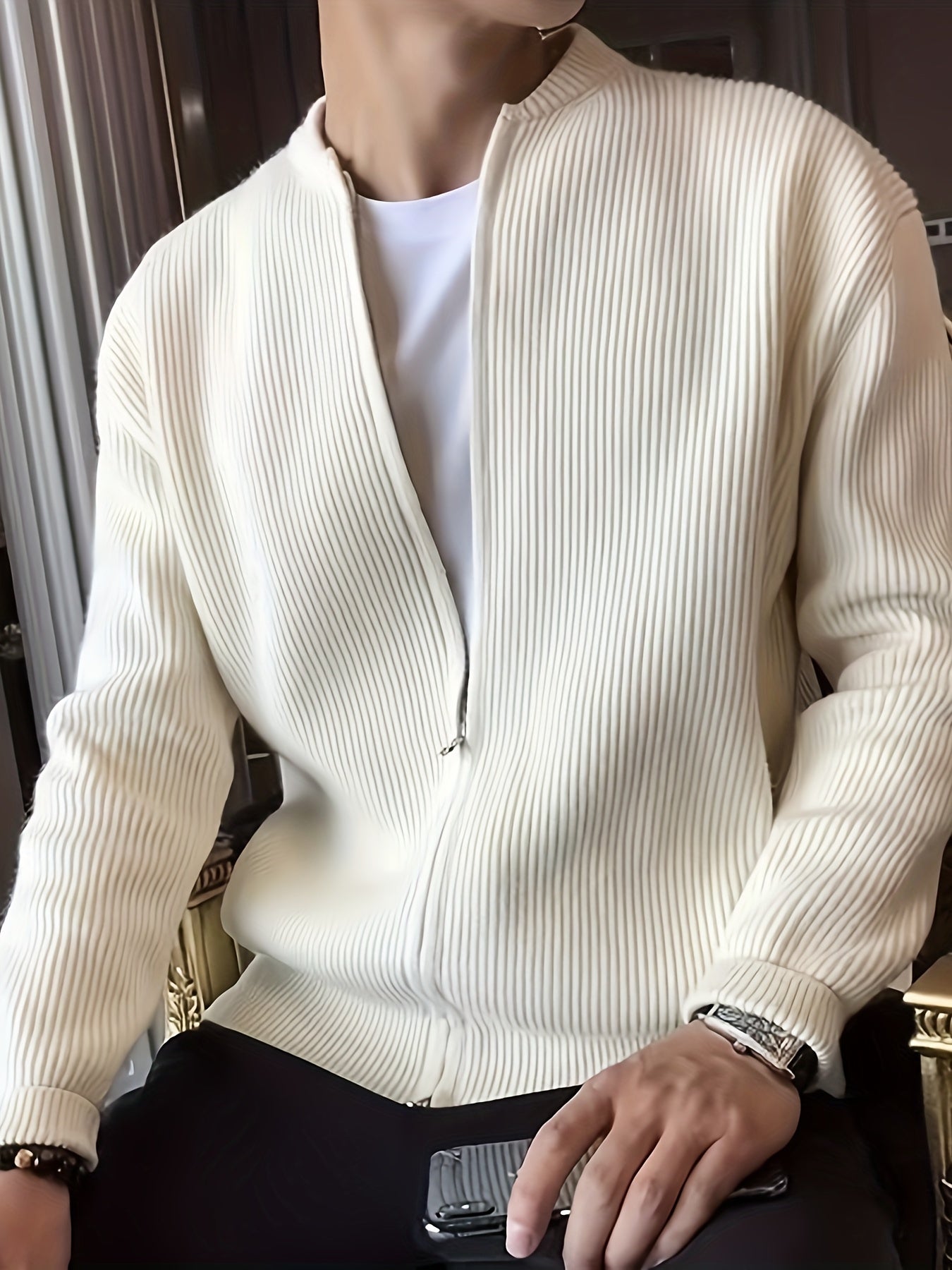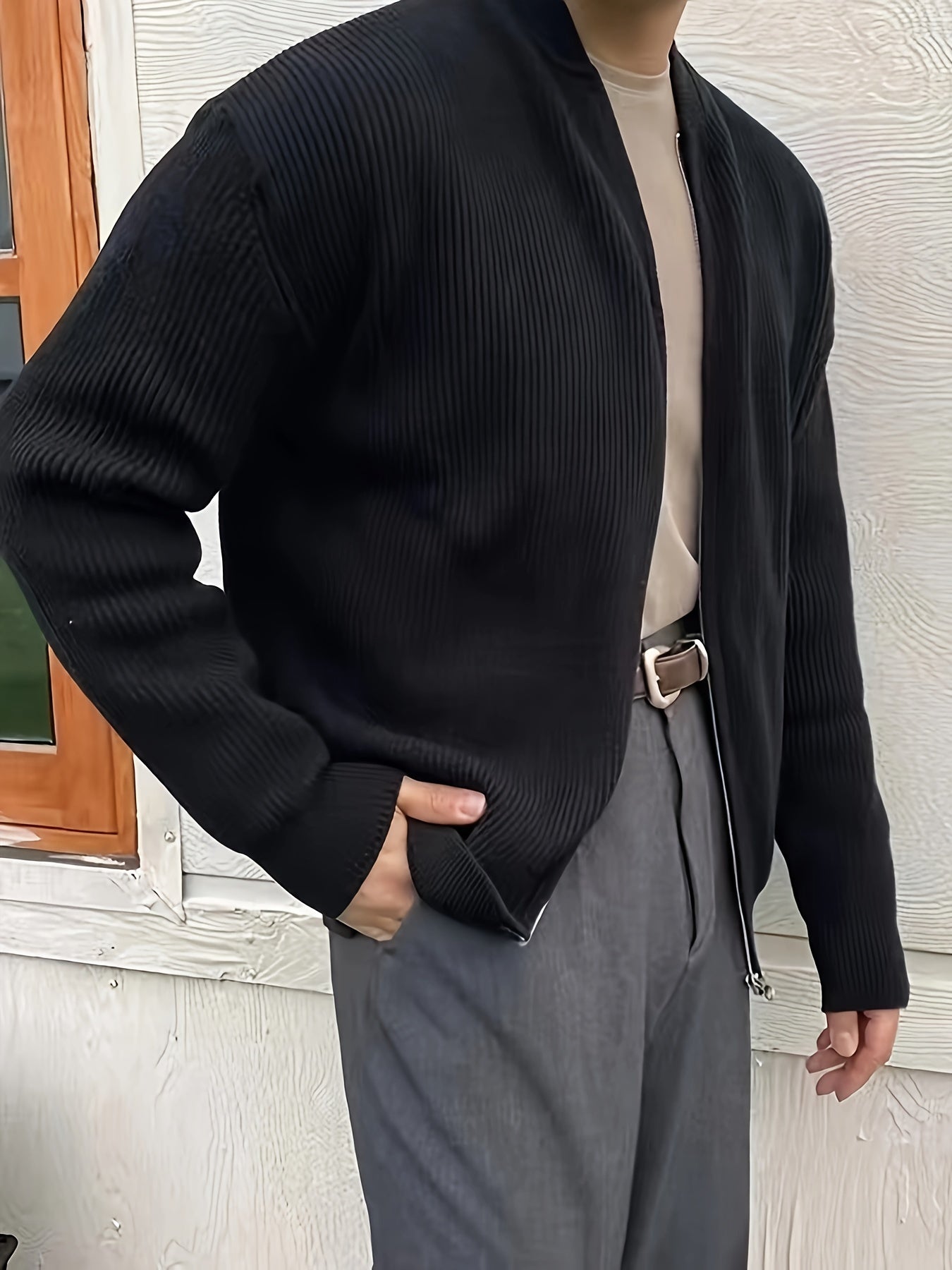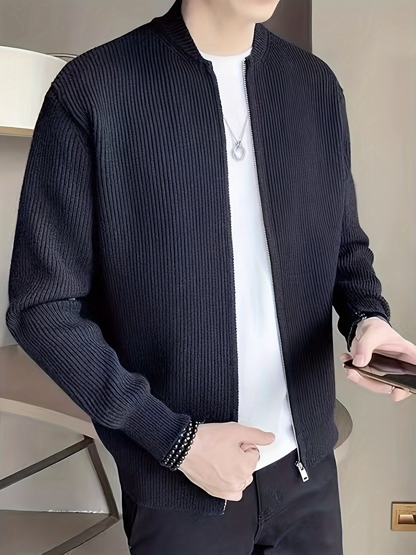 Տղամարդկանց պինդ գծավոր տրիկոտաժե ժակետ, պատահական երկարաթև վզով սվիտեր գարնանային աշնանային բացօթյա գործունեության համար