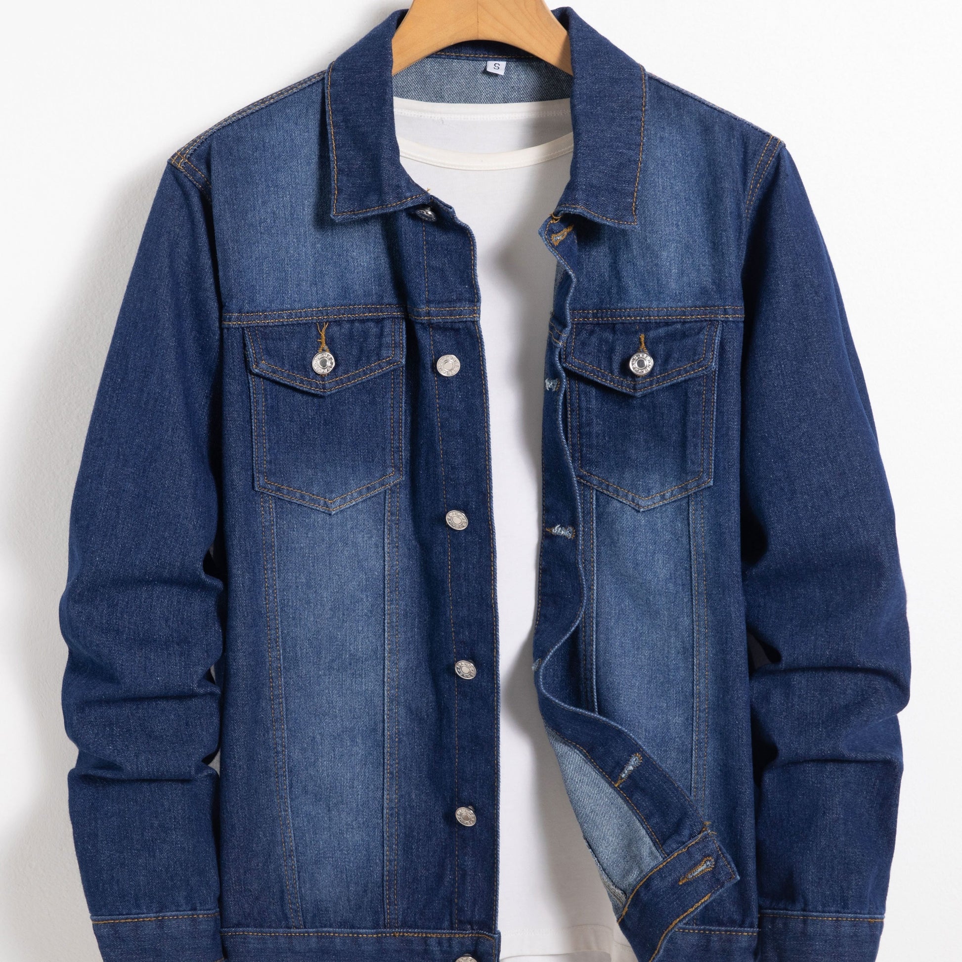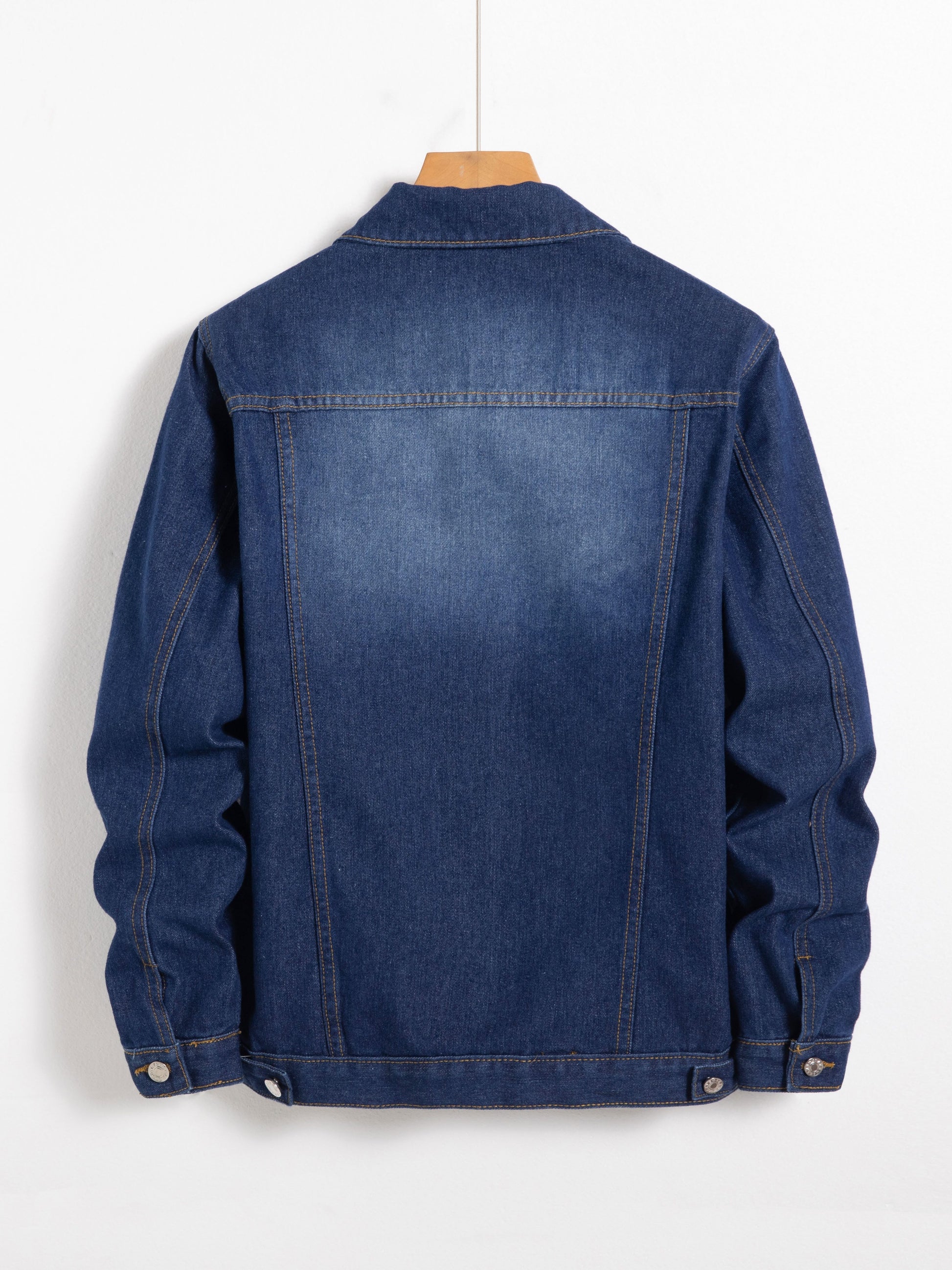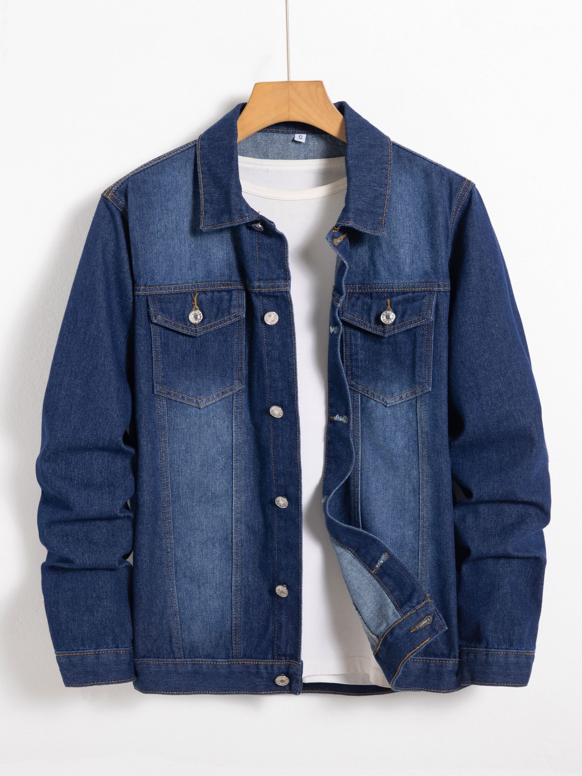 Տղամարդու գարնանային և աշնանային ջինսե բաճկոն կապույտ գույնով, որն ունի ոճային օձիք և բարձրակարգ աշխատանքային հագուստի դիզայն՝ կոճակներով: