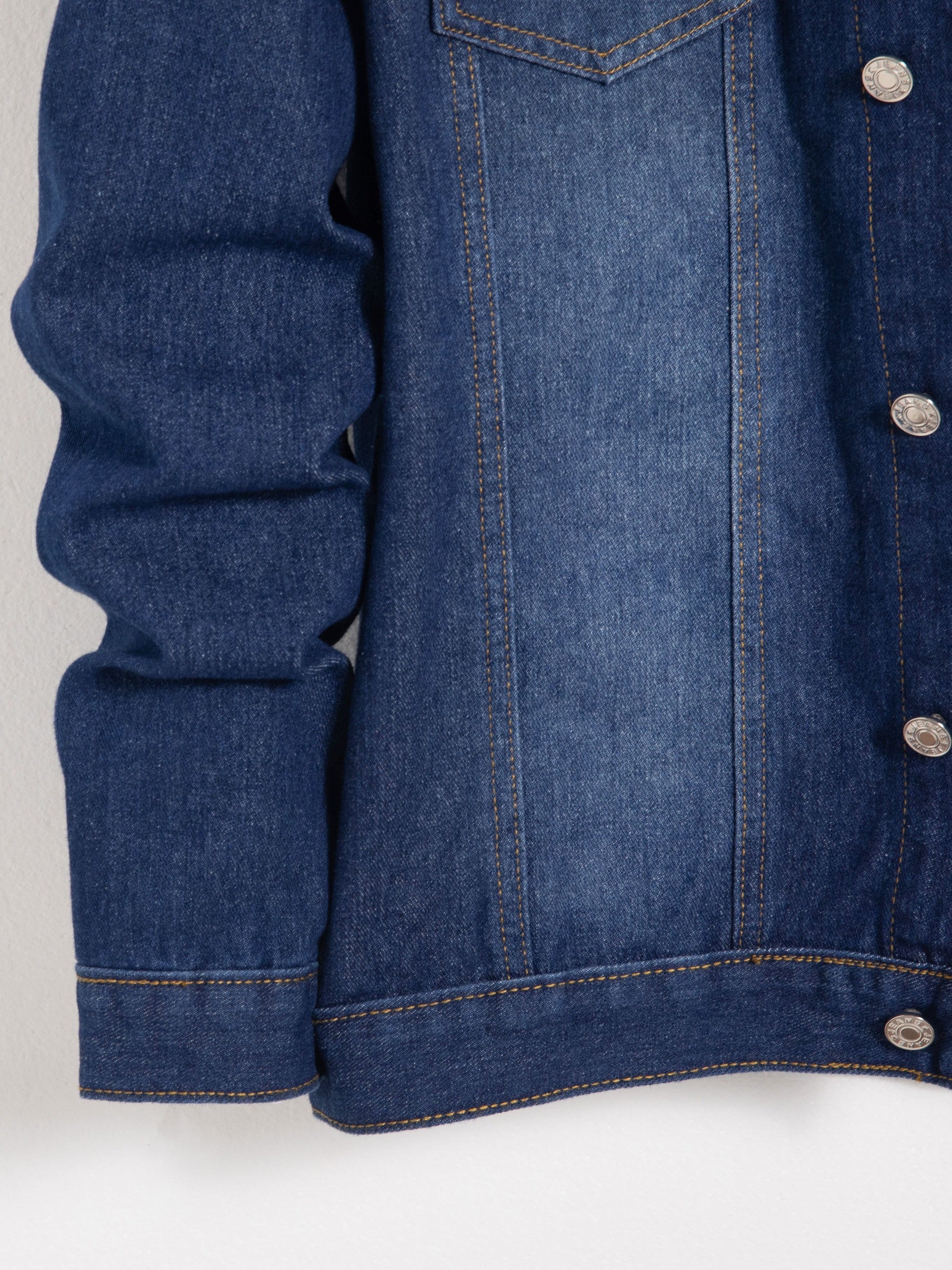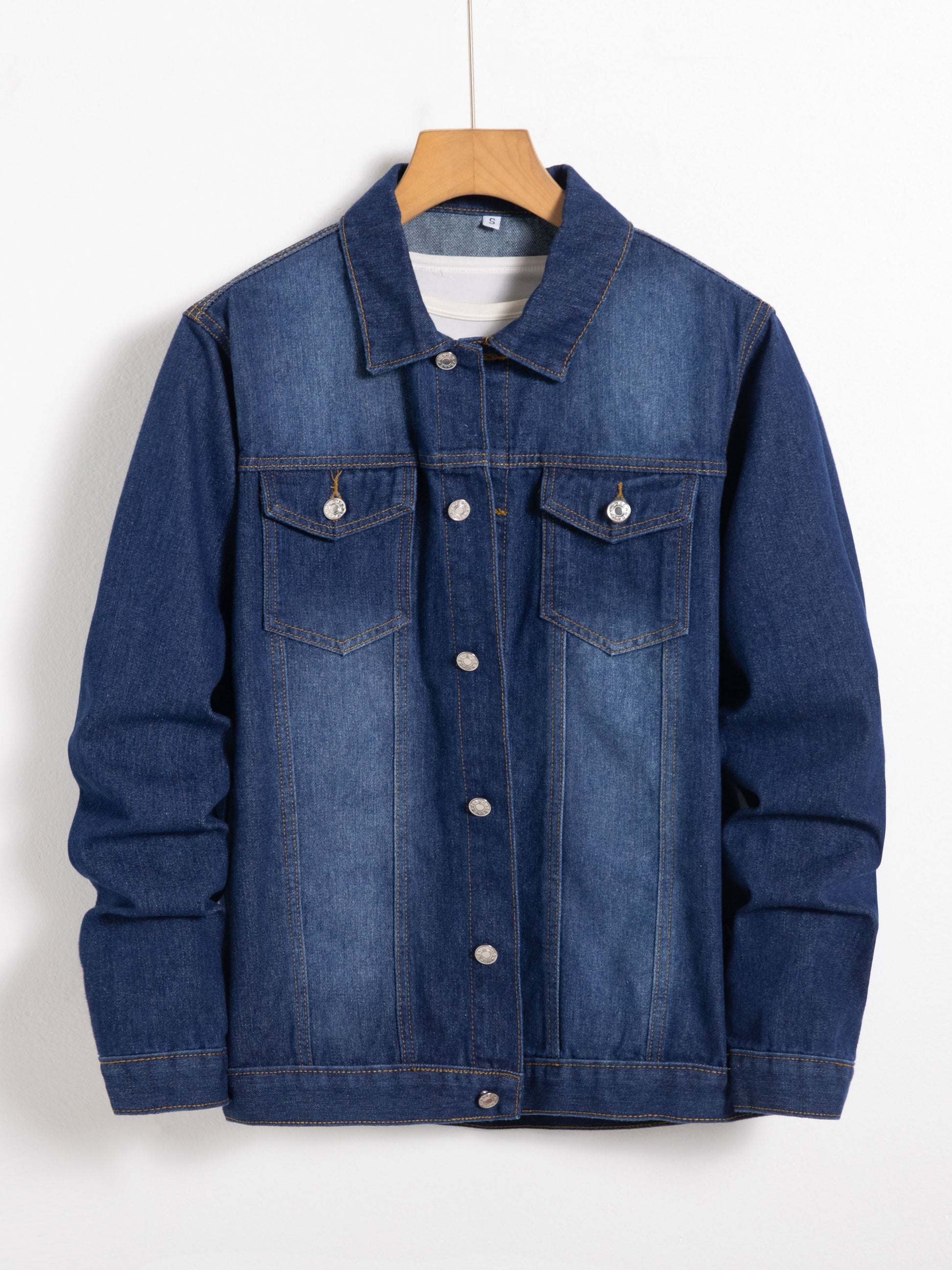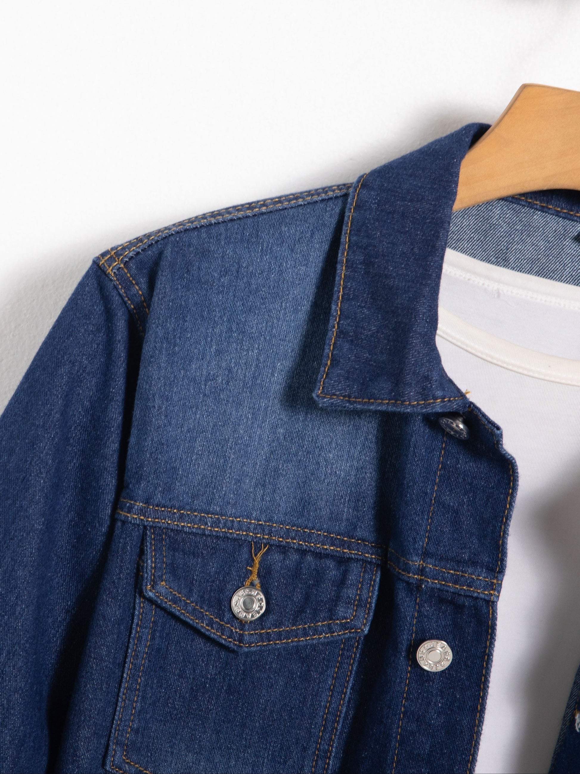 Տղամարդու գարնանային և աշնանային ջինսե բաճկոն կապույտ գույնով, որն ունի ոճային օձիք և բարձրակարգ աշխատանքային հագուստի դիզայն՝ կոճակներով:
