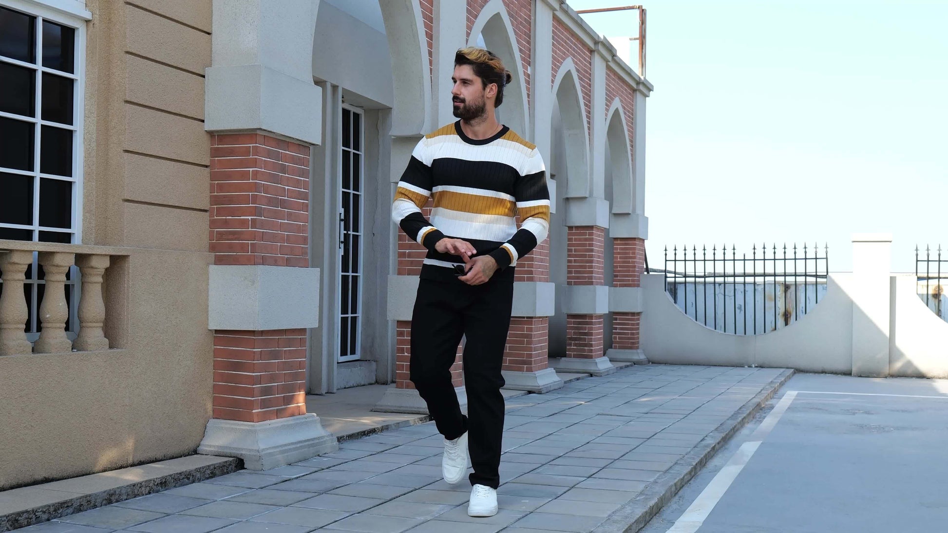 Men's Striped Color-Block Ribbed Knit Sweater - Long Sleeve Round Neck Pullover with Elastic Comfort Fit, Machine Washable Casual Fall Winter Top in Black/White/Green/Beige, Knit Sweater, Medium Elasticity
