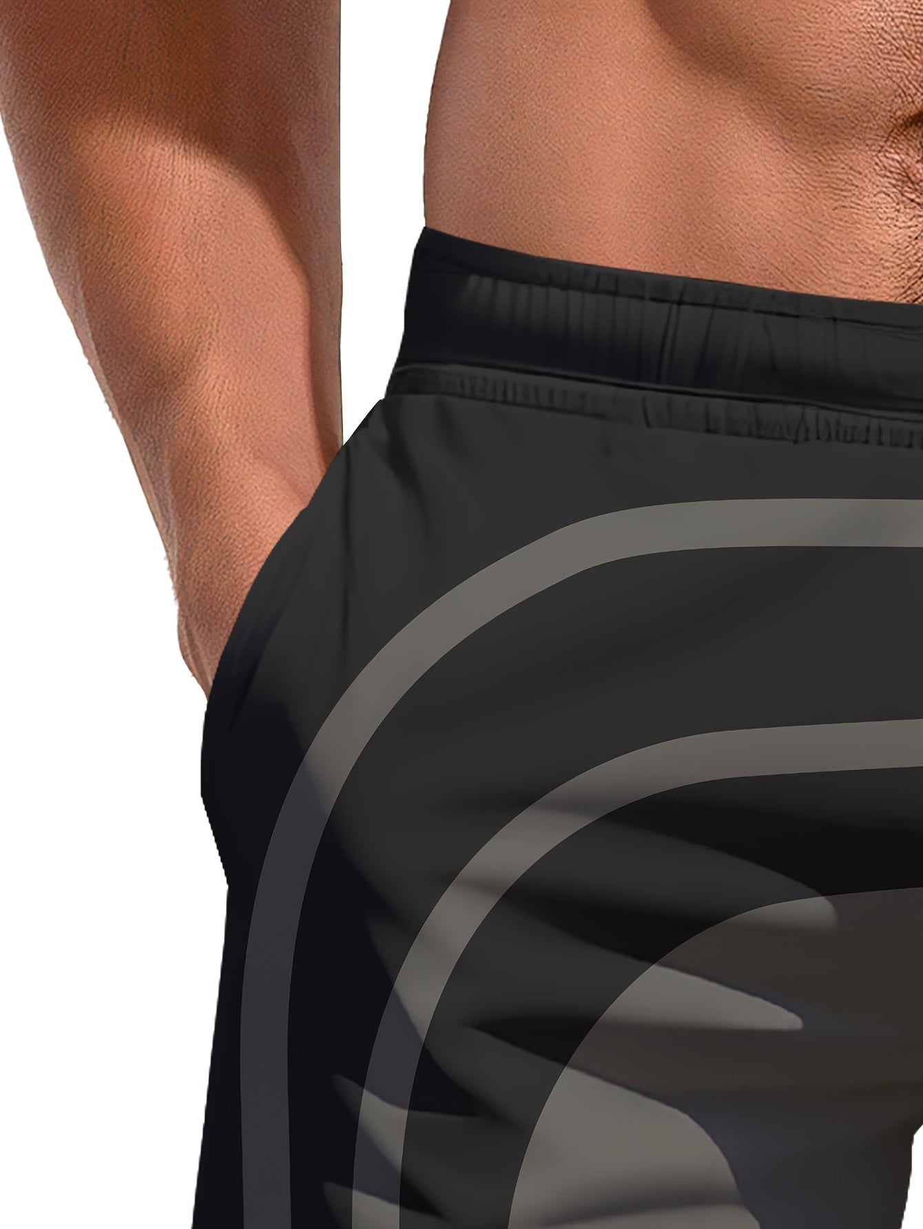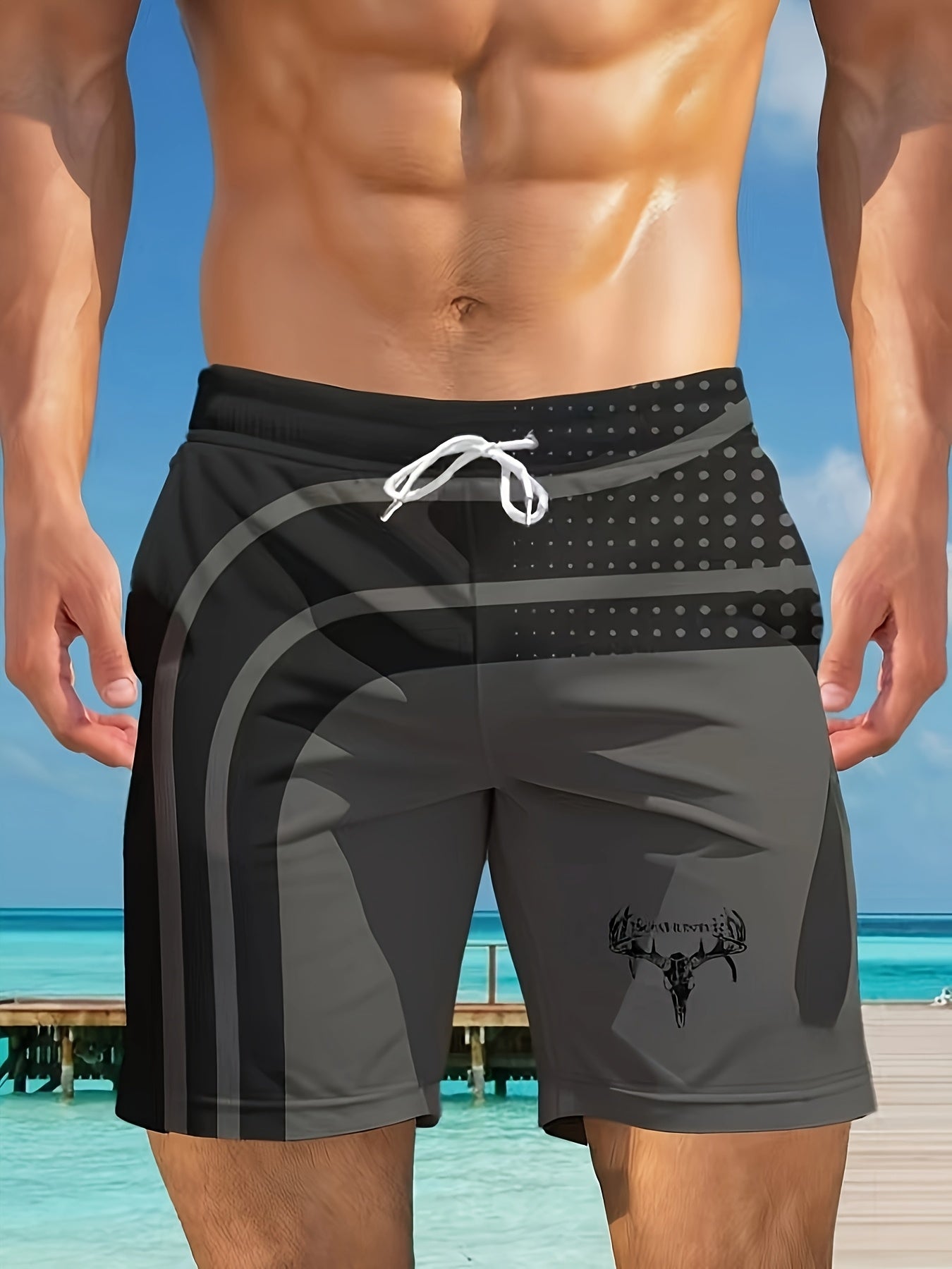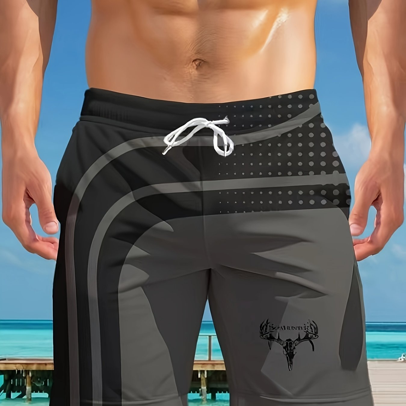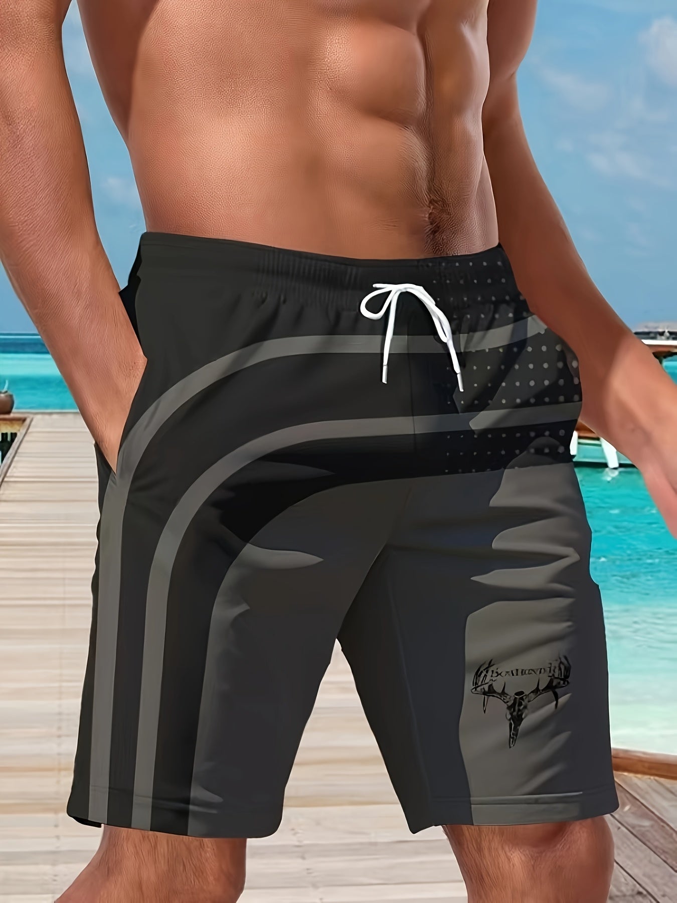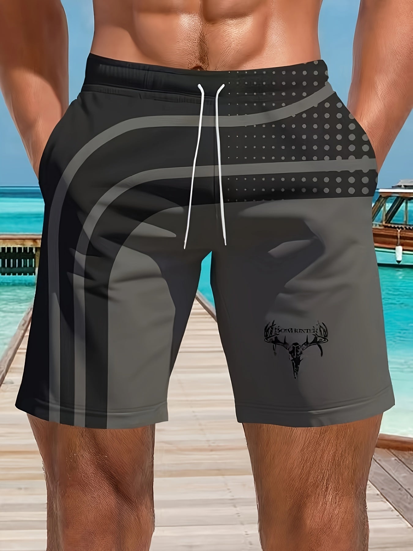 Տղամարդկանց նորաոճ երկրաչափական տպագրությամբ լողազգեստներ գրպաններով, շնչող պարանով գոտկատեղով, սև և մոխրագույն դիզայնով, կատարյալ լողափի և բացօթյա գործունեության համար