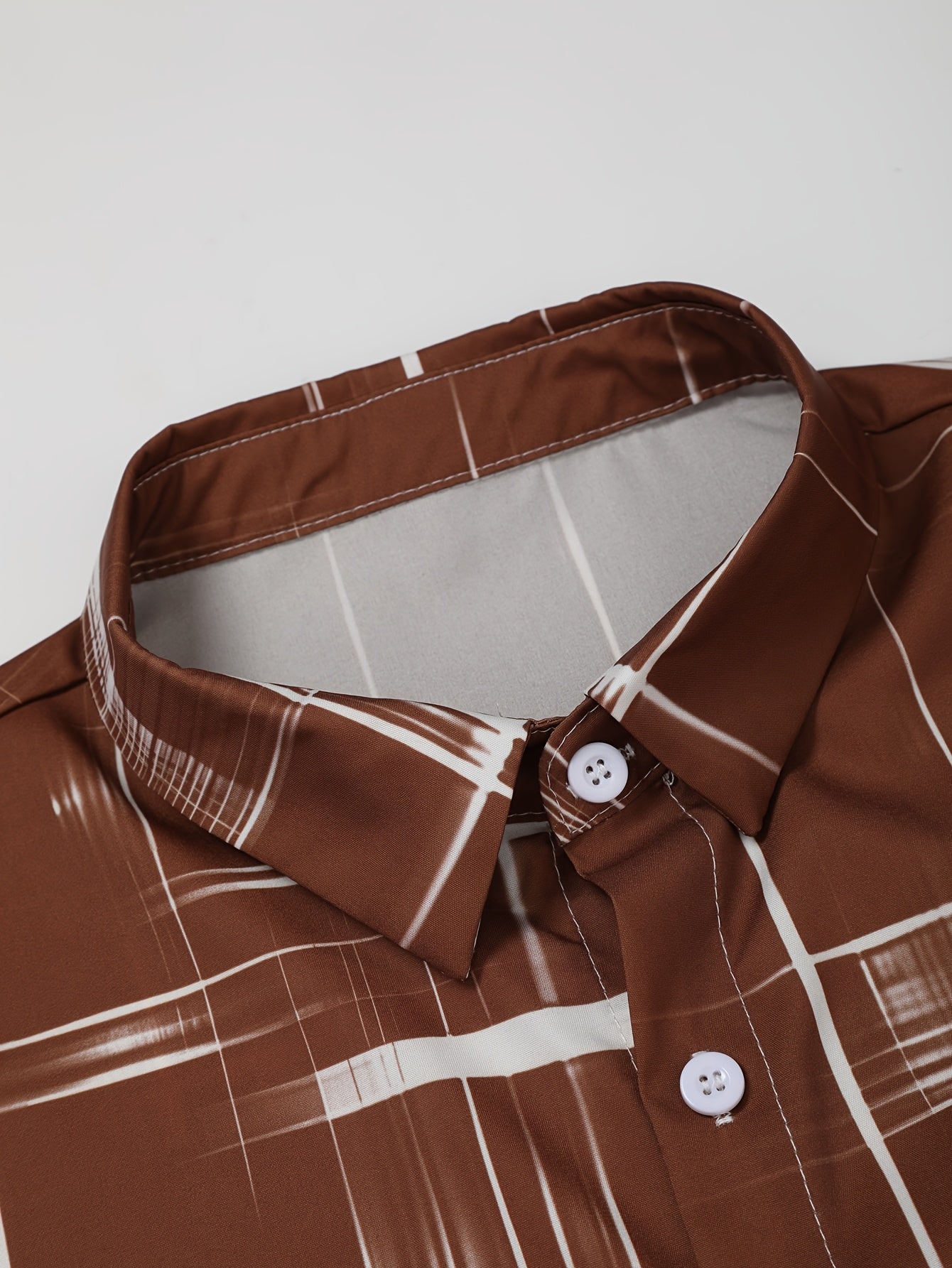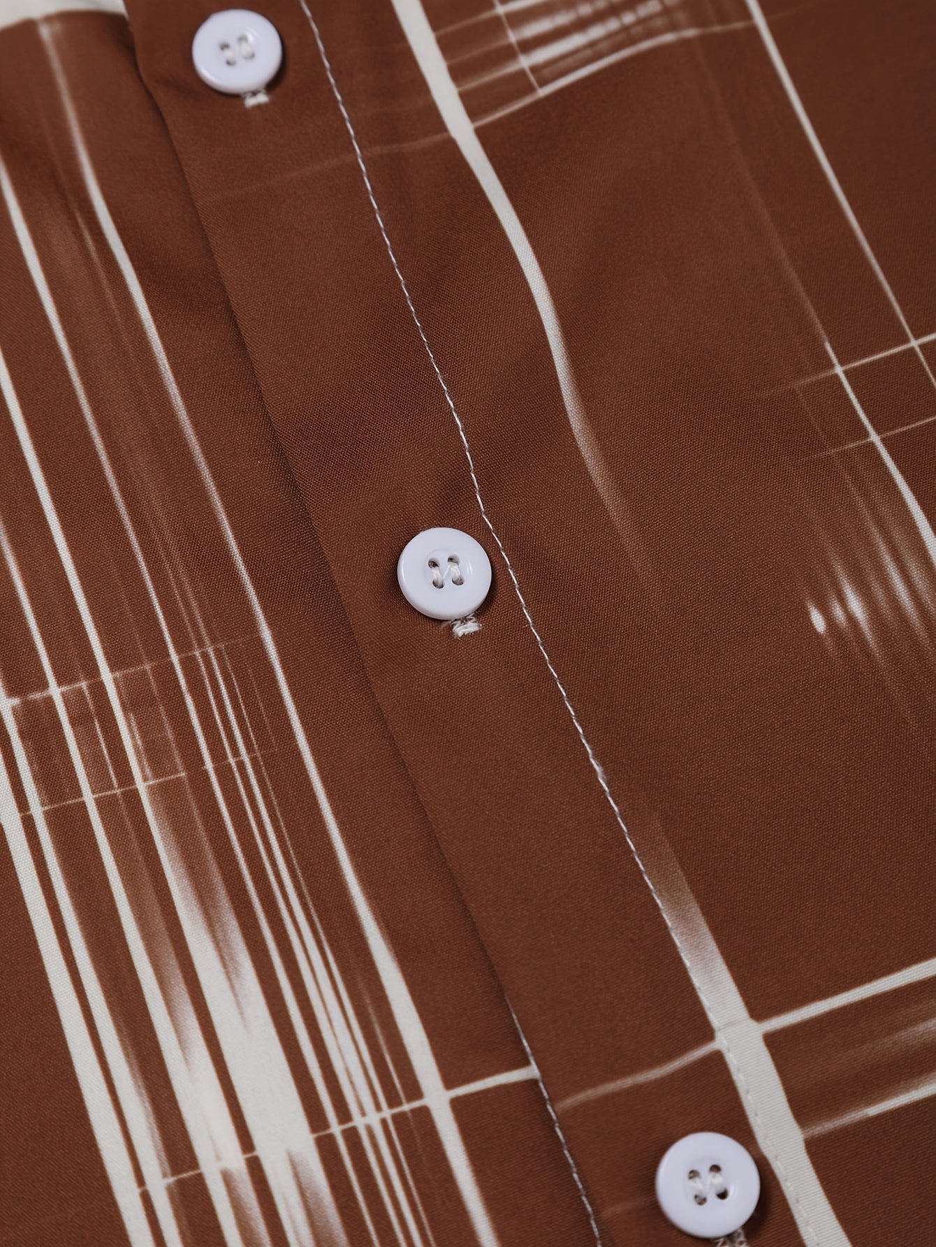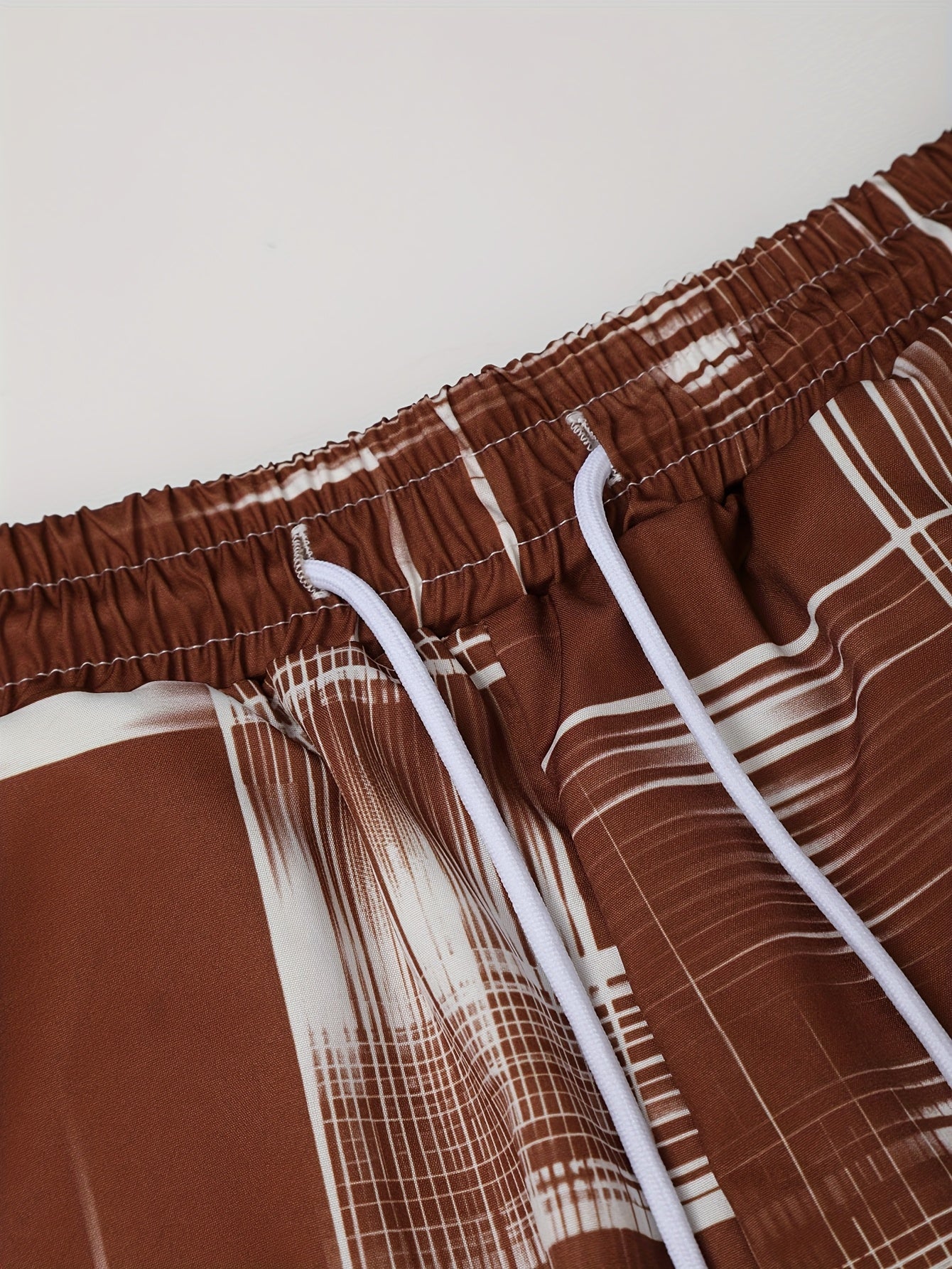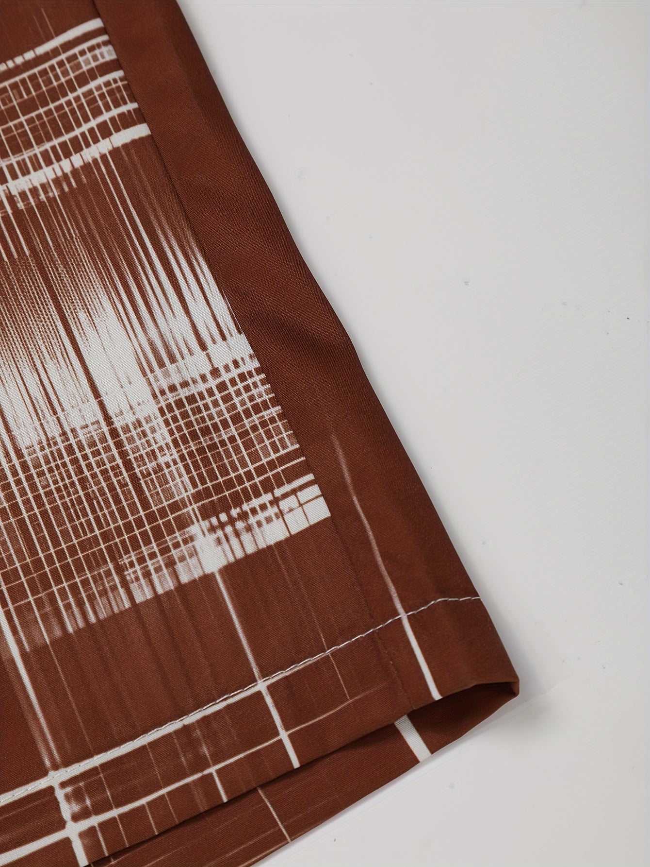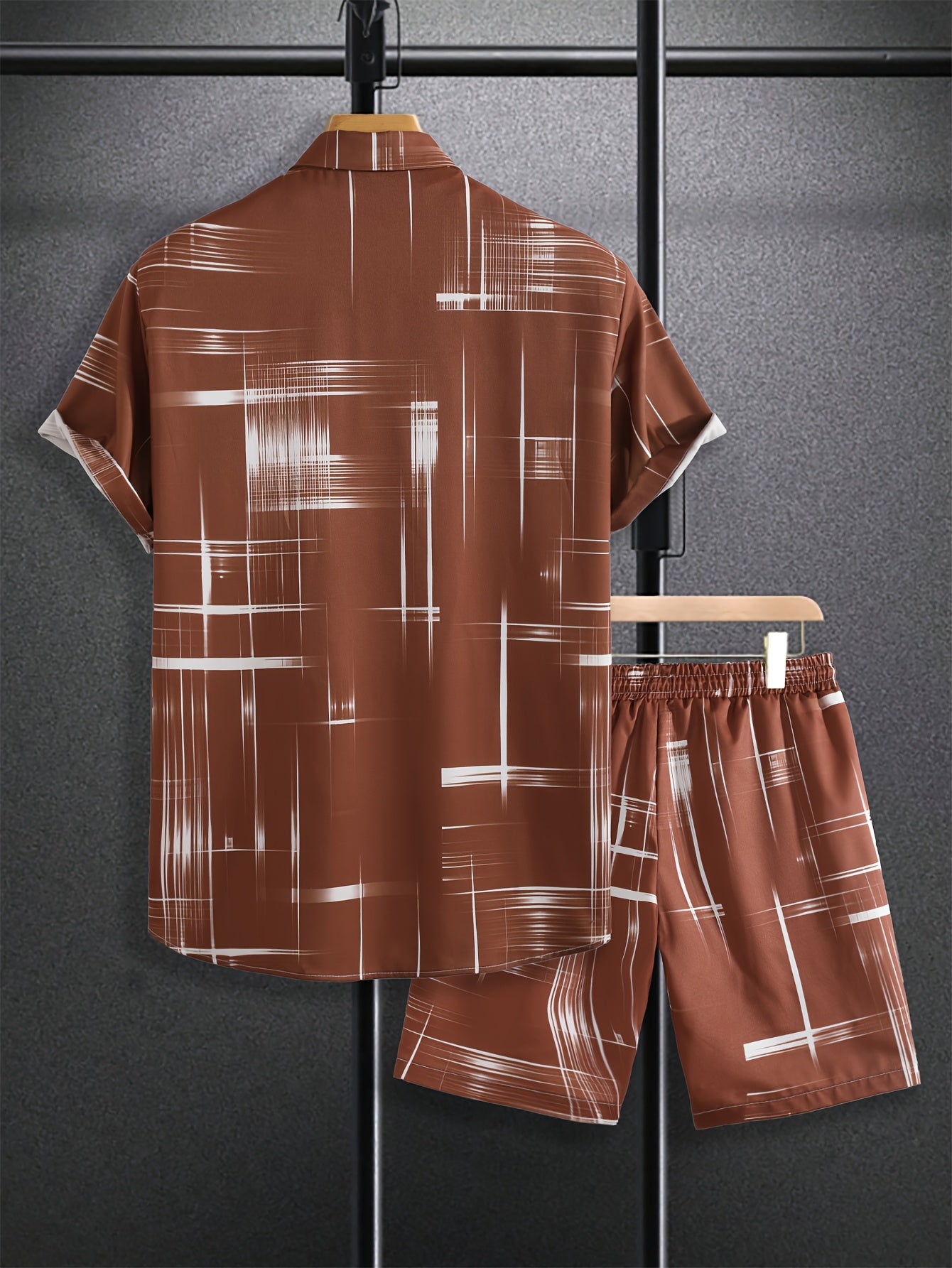 Men'S Stylish Gradient Shirt Set - Brown & White Geometric Pattern, Short Sleeve with Pocket, Loose Fit Shorts, Perfect for Beach, Camping, Fishing & Outdoor Activities, Casual Attire|Geometric Pattern Shirt|Woven Fabri