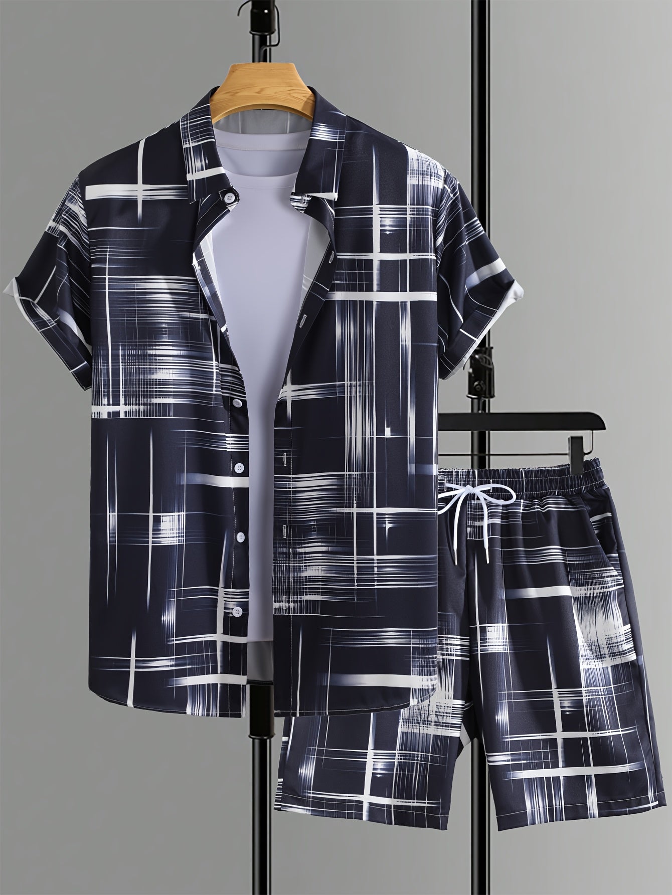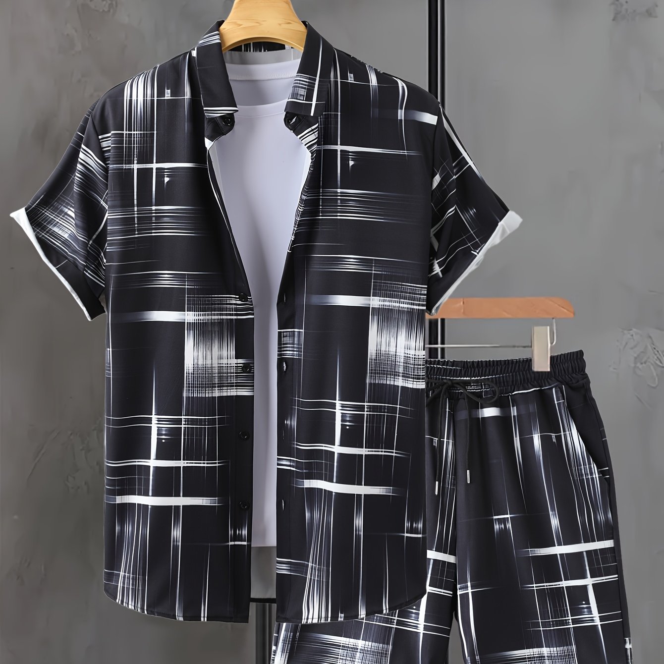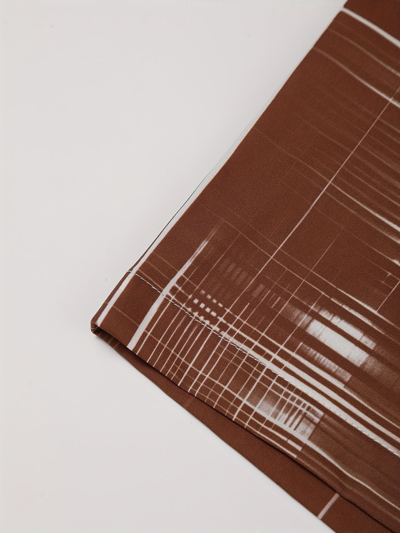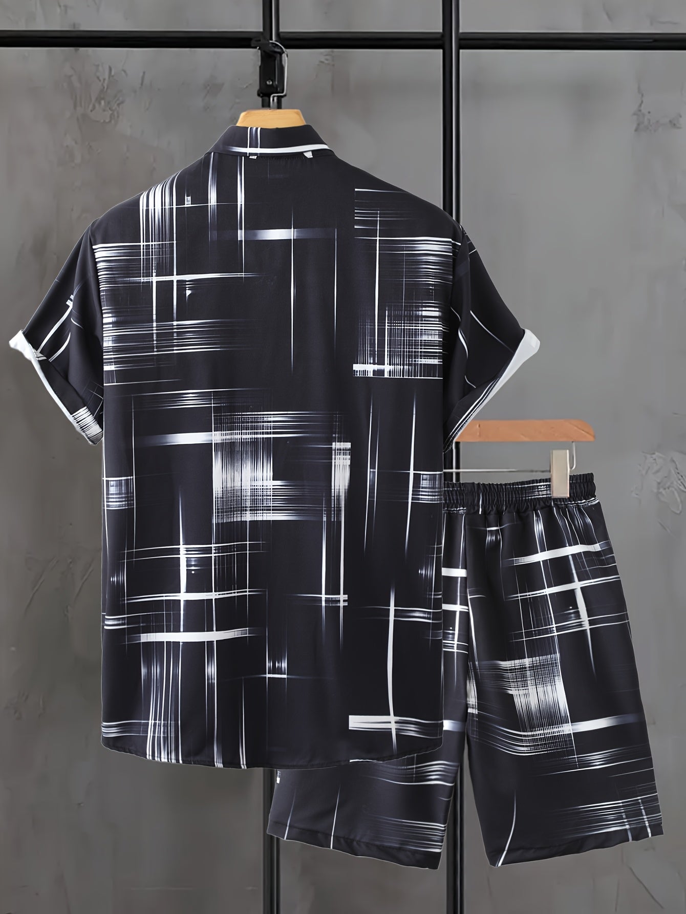 Men'S Stylish Gradient Shirt Set - Brown & White Geometric Pattern, Short Sleeve with Pocket, Loose Fit Shorts, Perfect for Beach, Camping, Fishing & Outdoor Activities, Casual Attire|Geometric Pattern Shirt|Woven Fabri