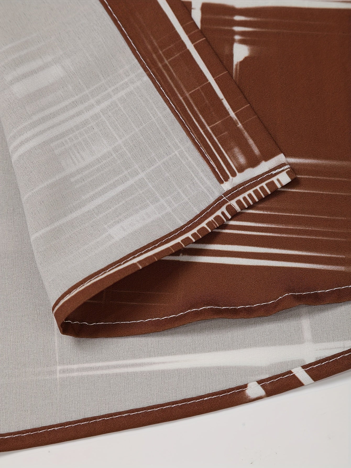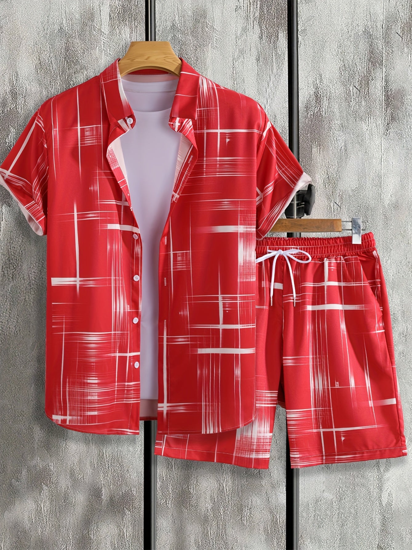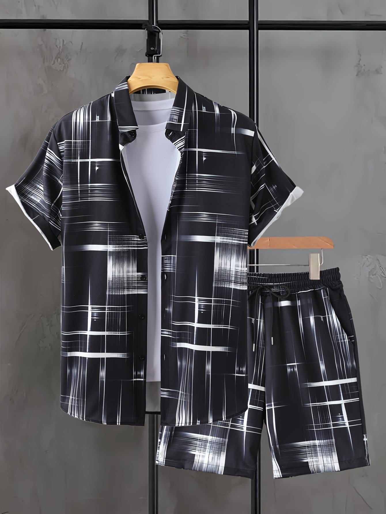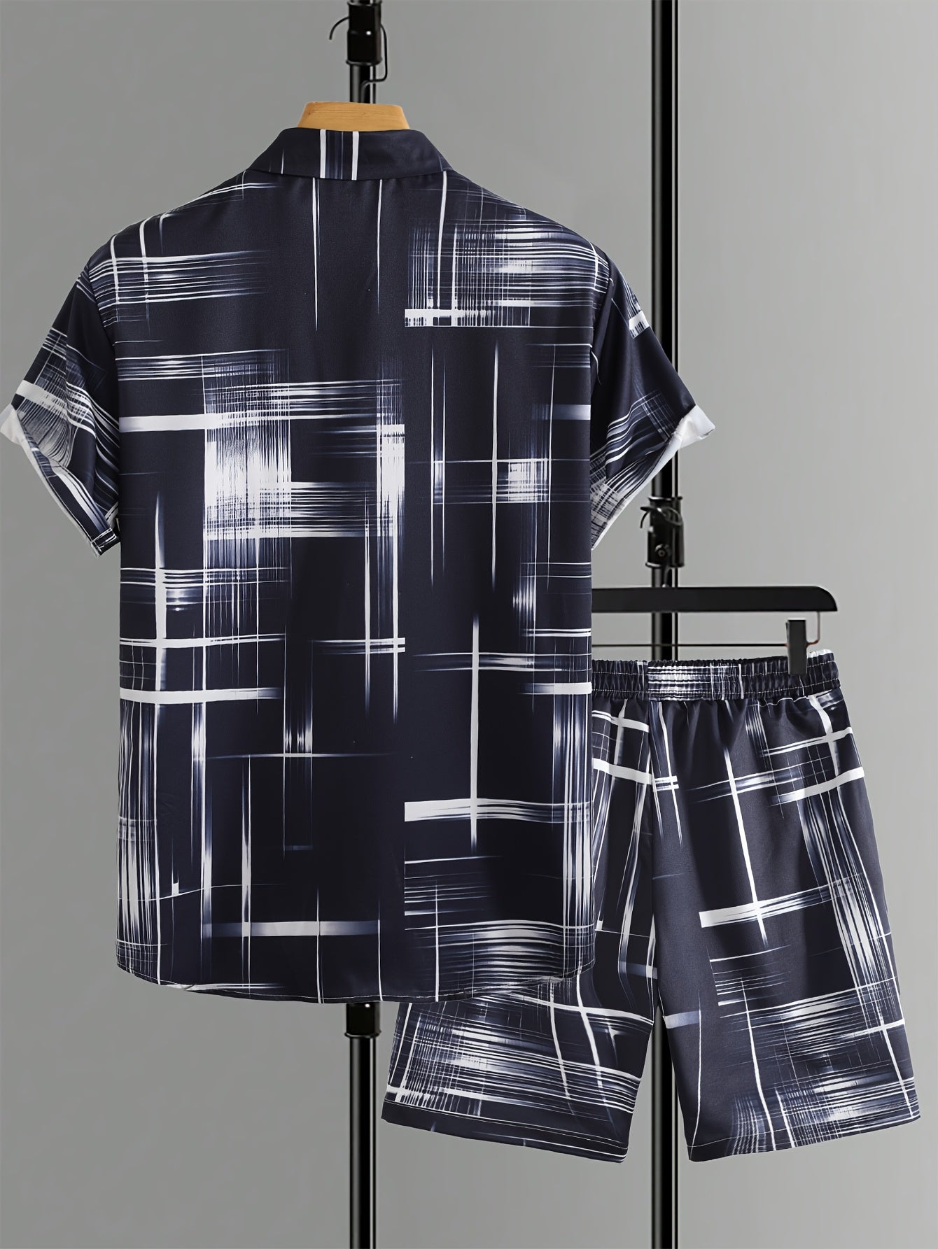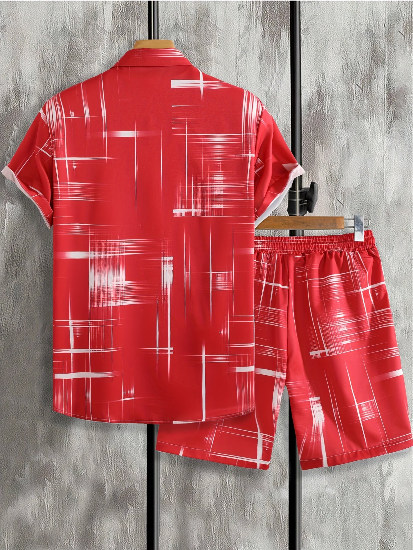 Men'S Stylish Gradient Shirt Set - Brown & White Geometric Pattern, Short Sleeve with Pocket, Loose Fit Shorts, Perfect for Beach, Camping, Fishing & Outdoor Activities, Casual Attire|Geometric Pattern Shirt|Woven Fabri