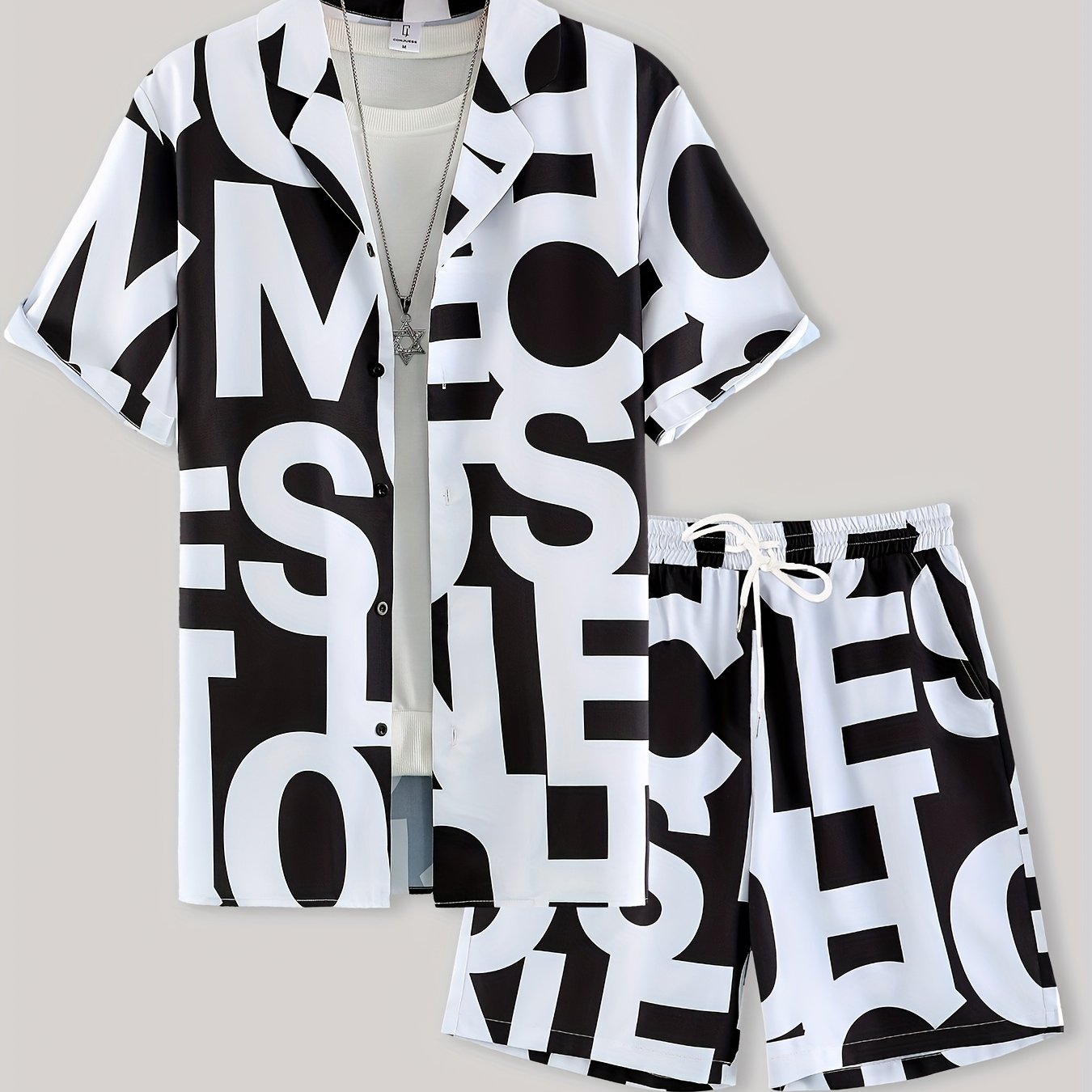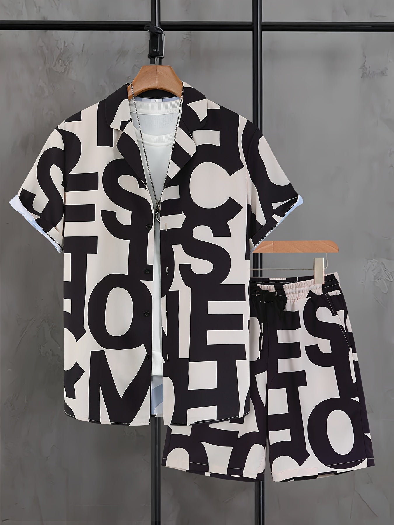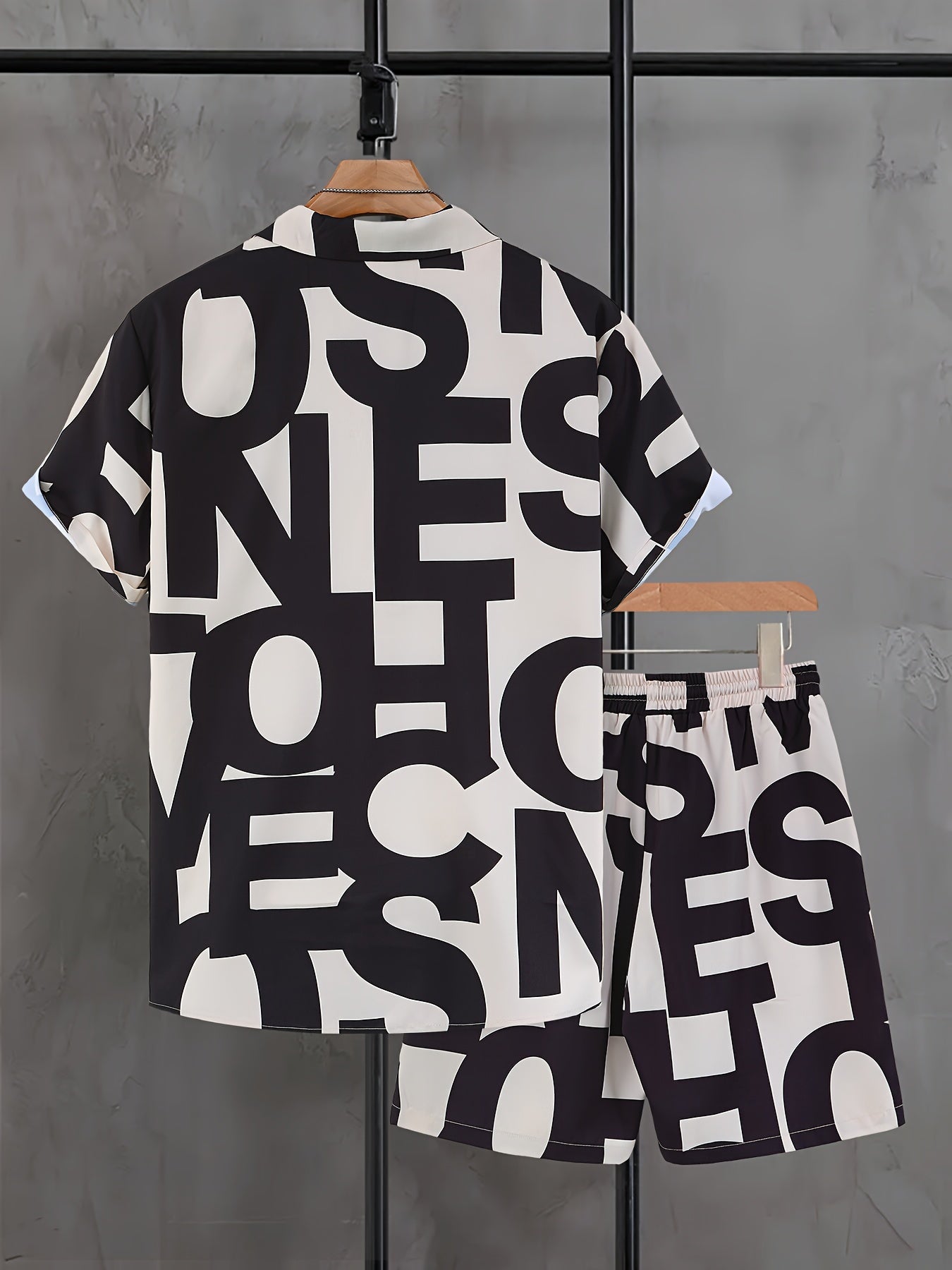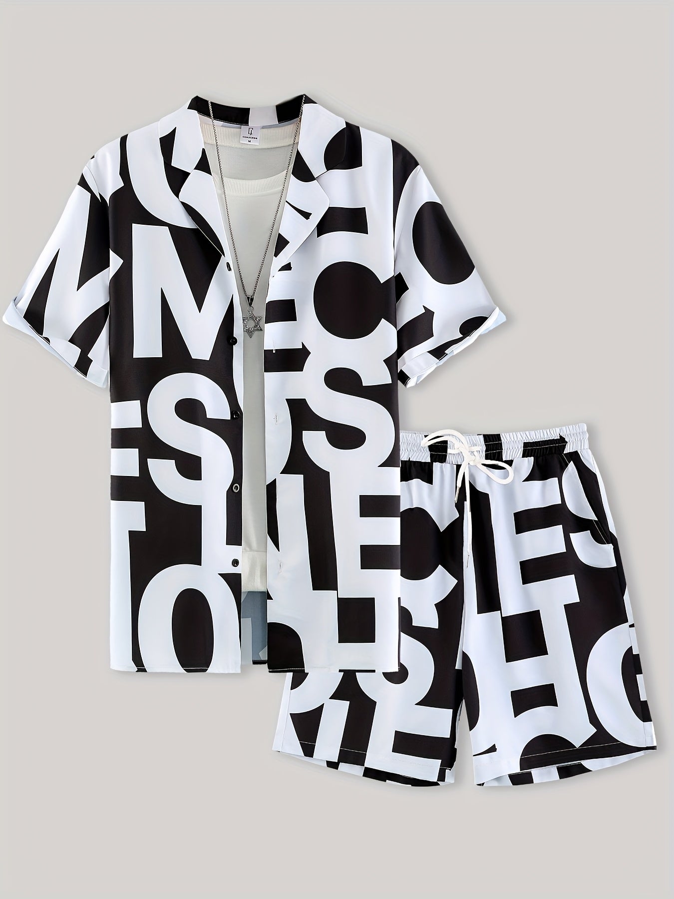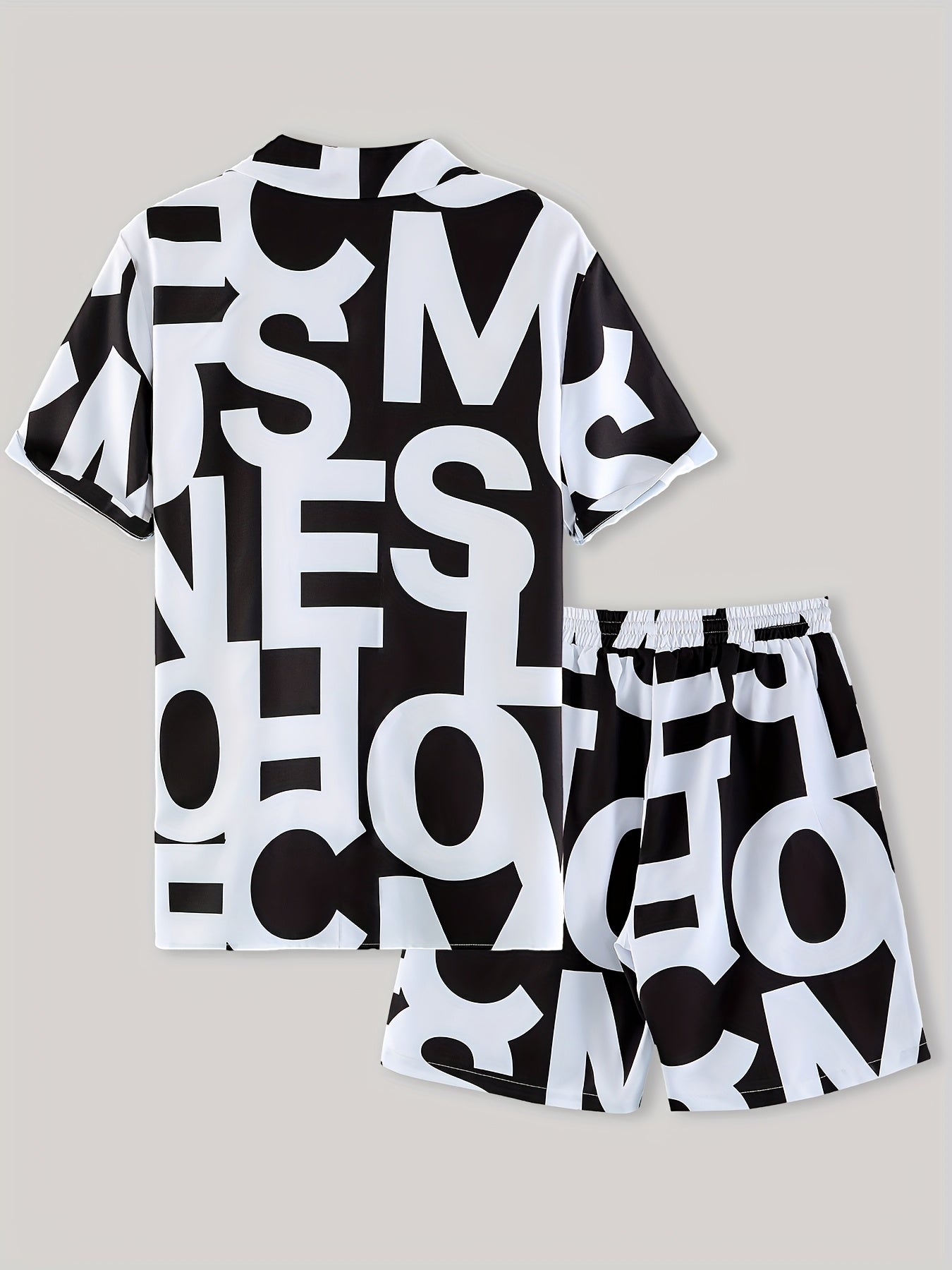 Տղամարդու կոստյում սև և սպիտակ տառերով նախշերով, կարճ թևքերով, բաց օձիքով վերնաշապիկով և շորտերով, առօրյա հավաքածու