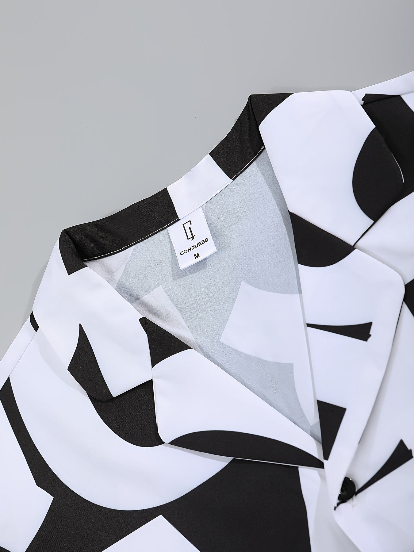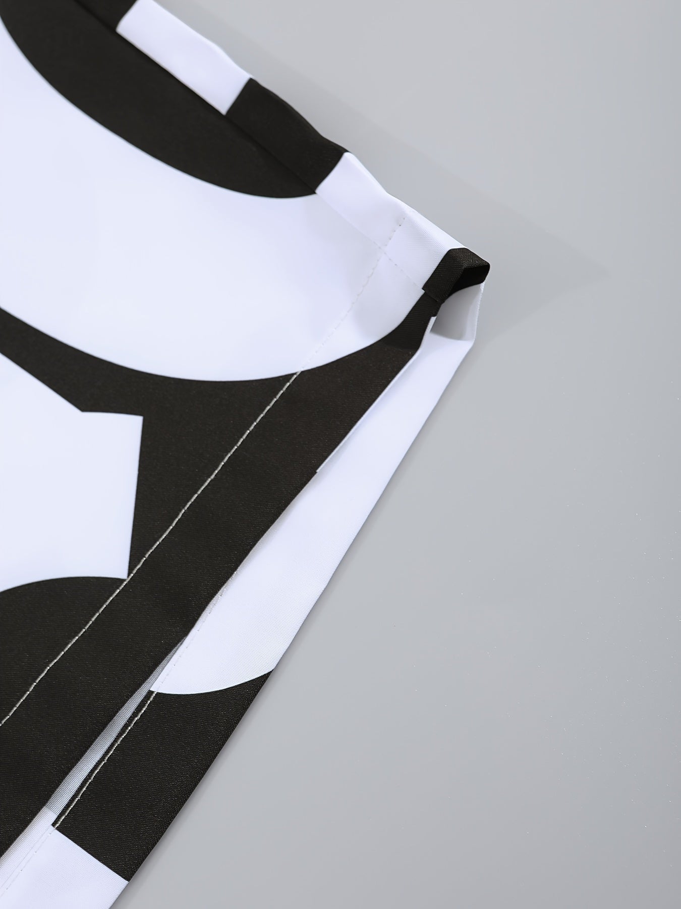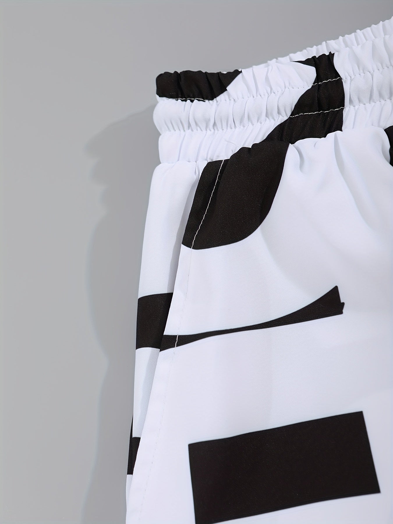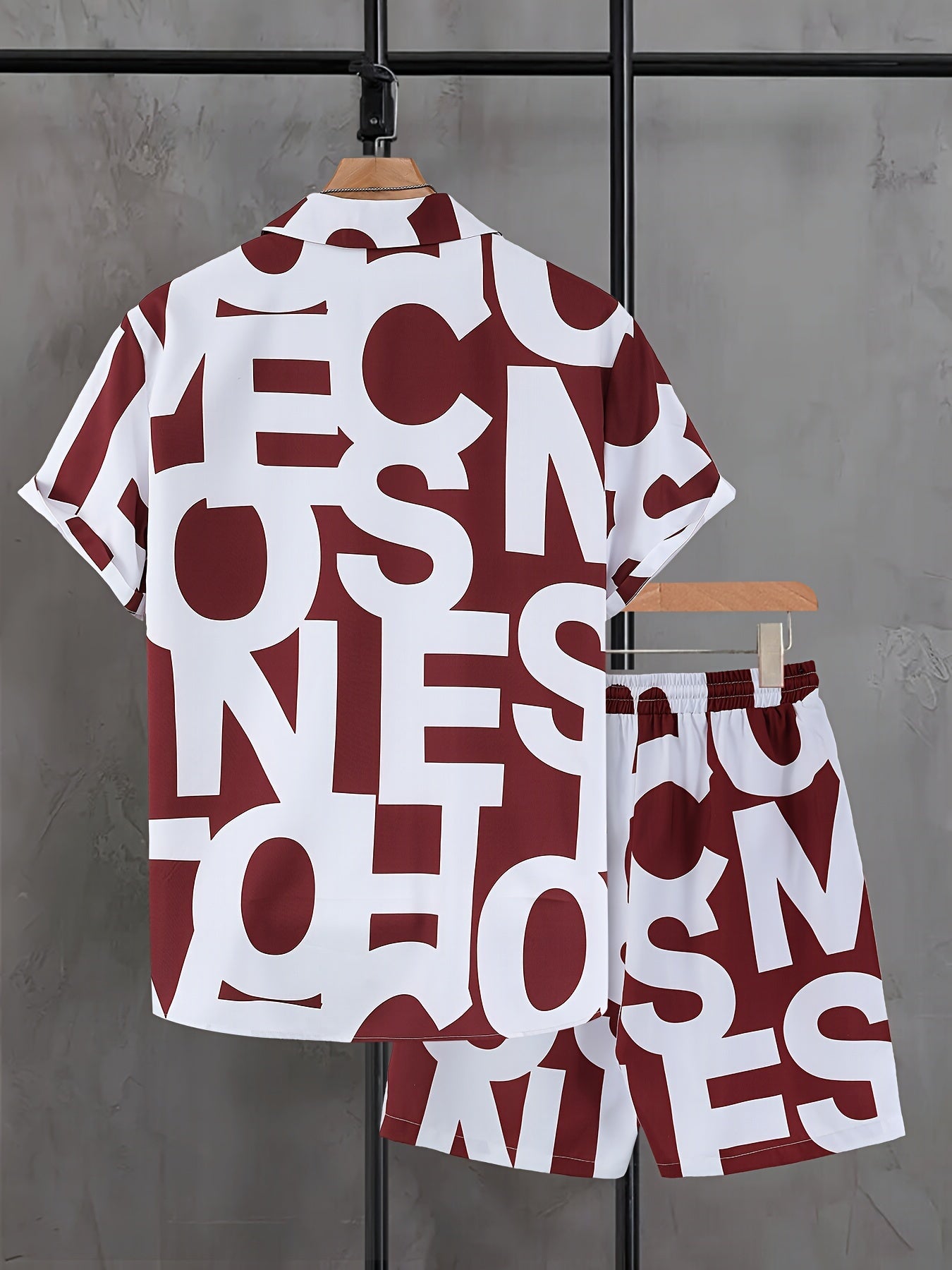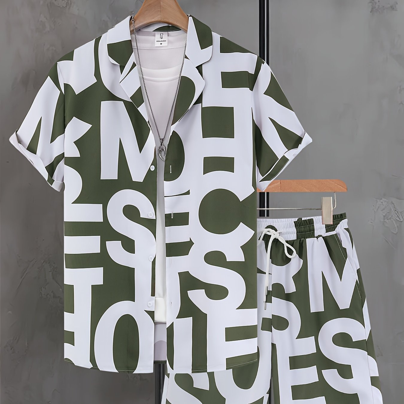 Տղամարդու կոստյում սև և սպիտակ տառերով նախշերով, կարճ թևքերով, բաց օձիքով վերնաշապիկով և շորտերով, առօրյա հավաքածու