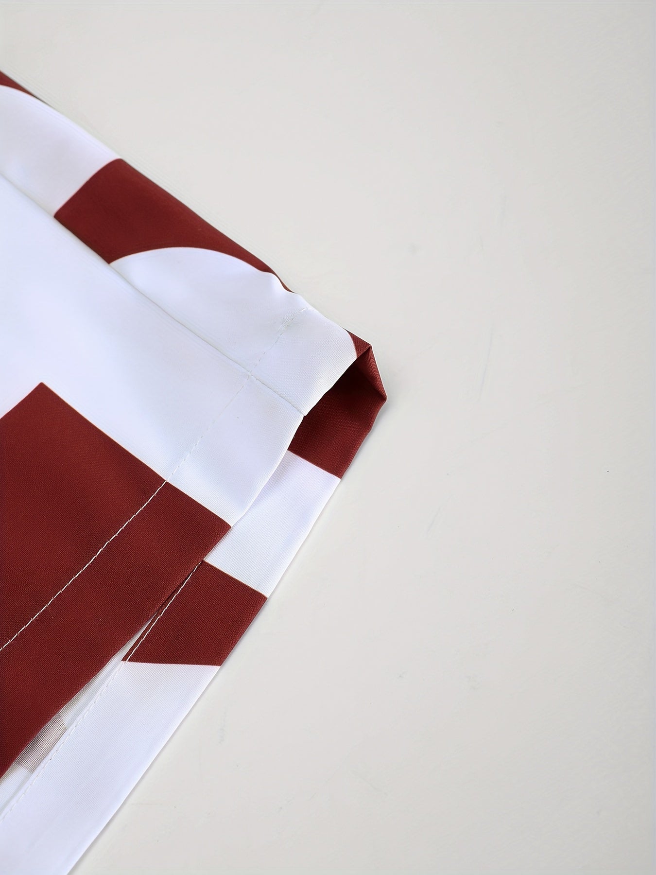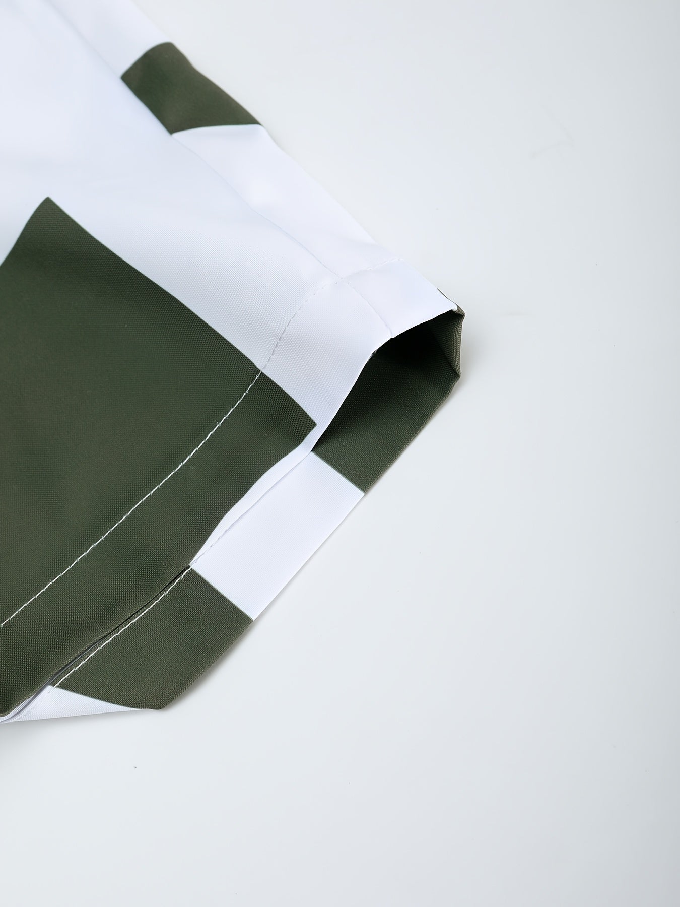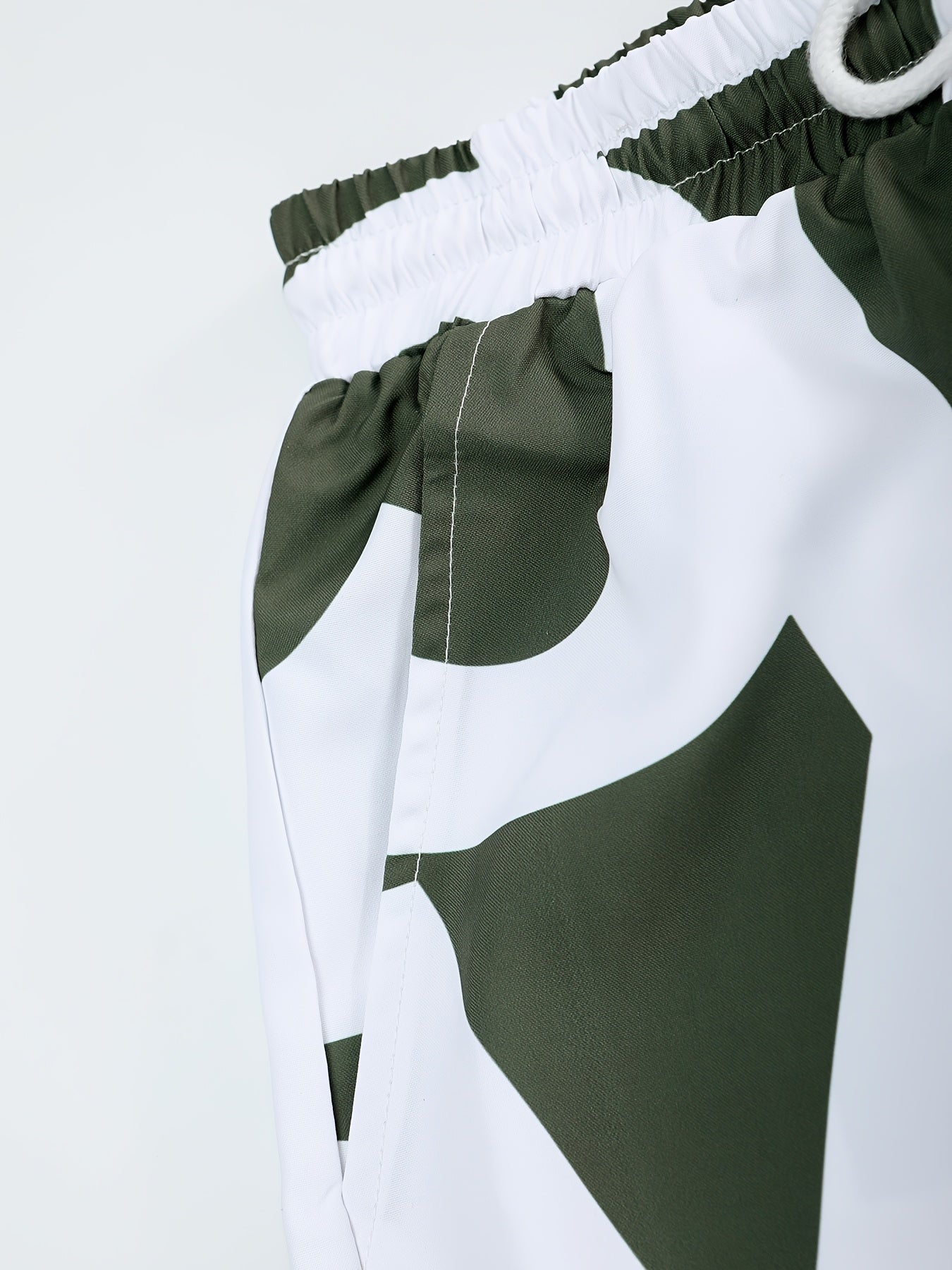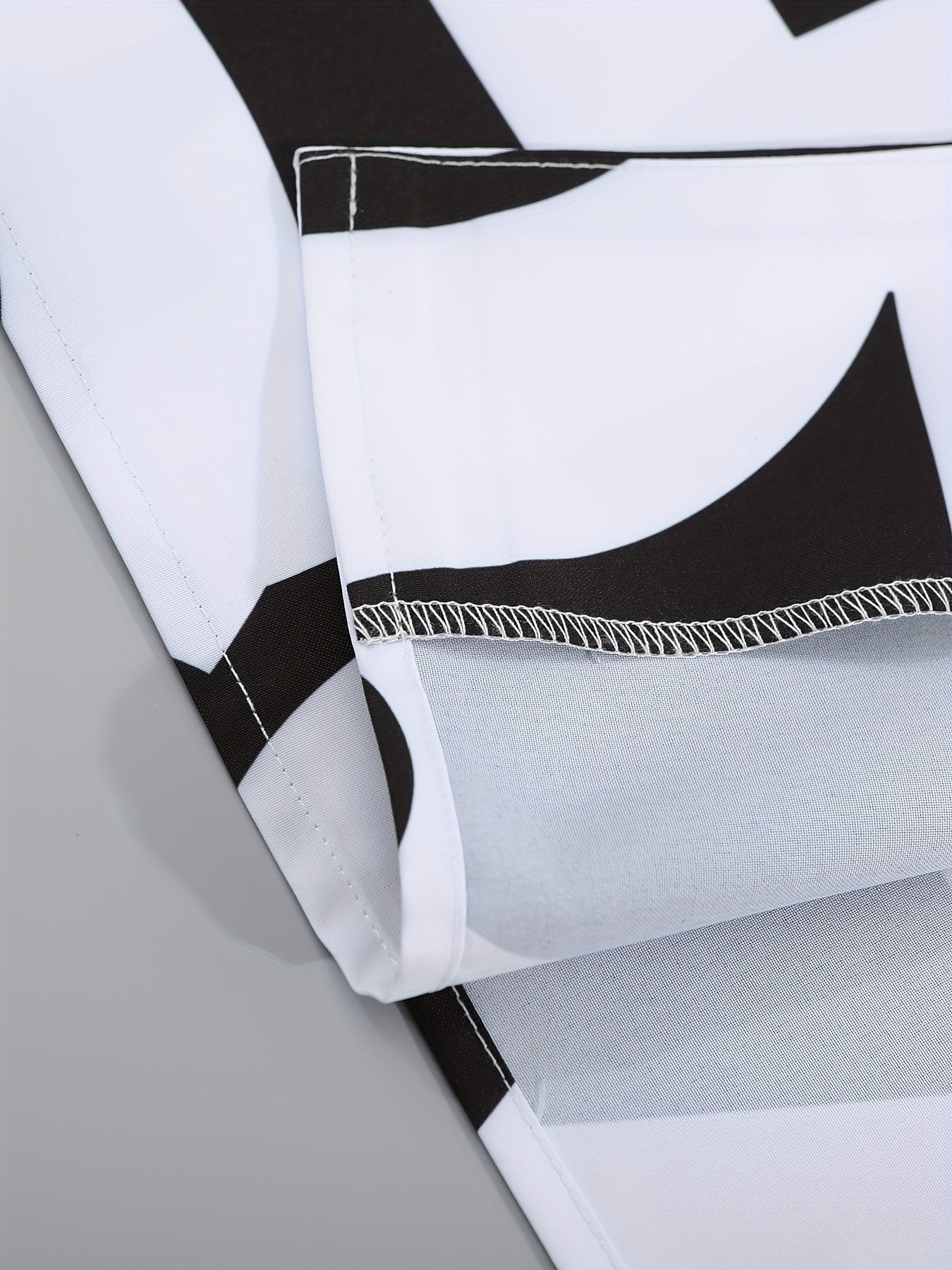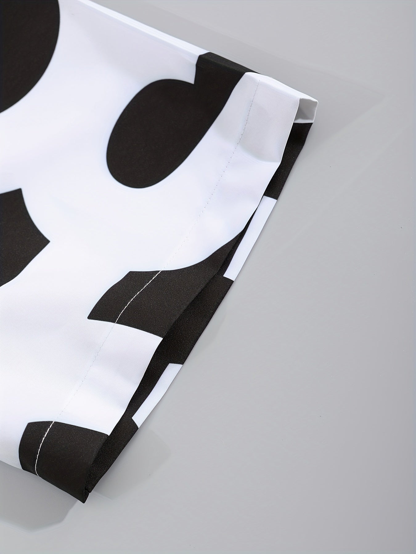 Տղամարդու կոստյում սև և սպիտակ տառերով նախշերով, կարճ թևքերով, բաց օձիքով վերնաշապիկով և շորտերով, առօրյա հավաքածու