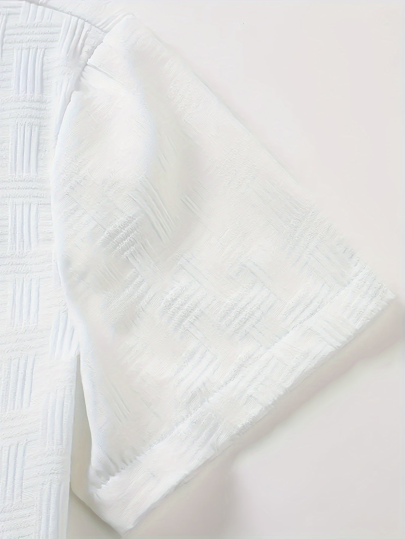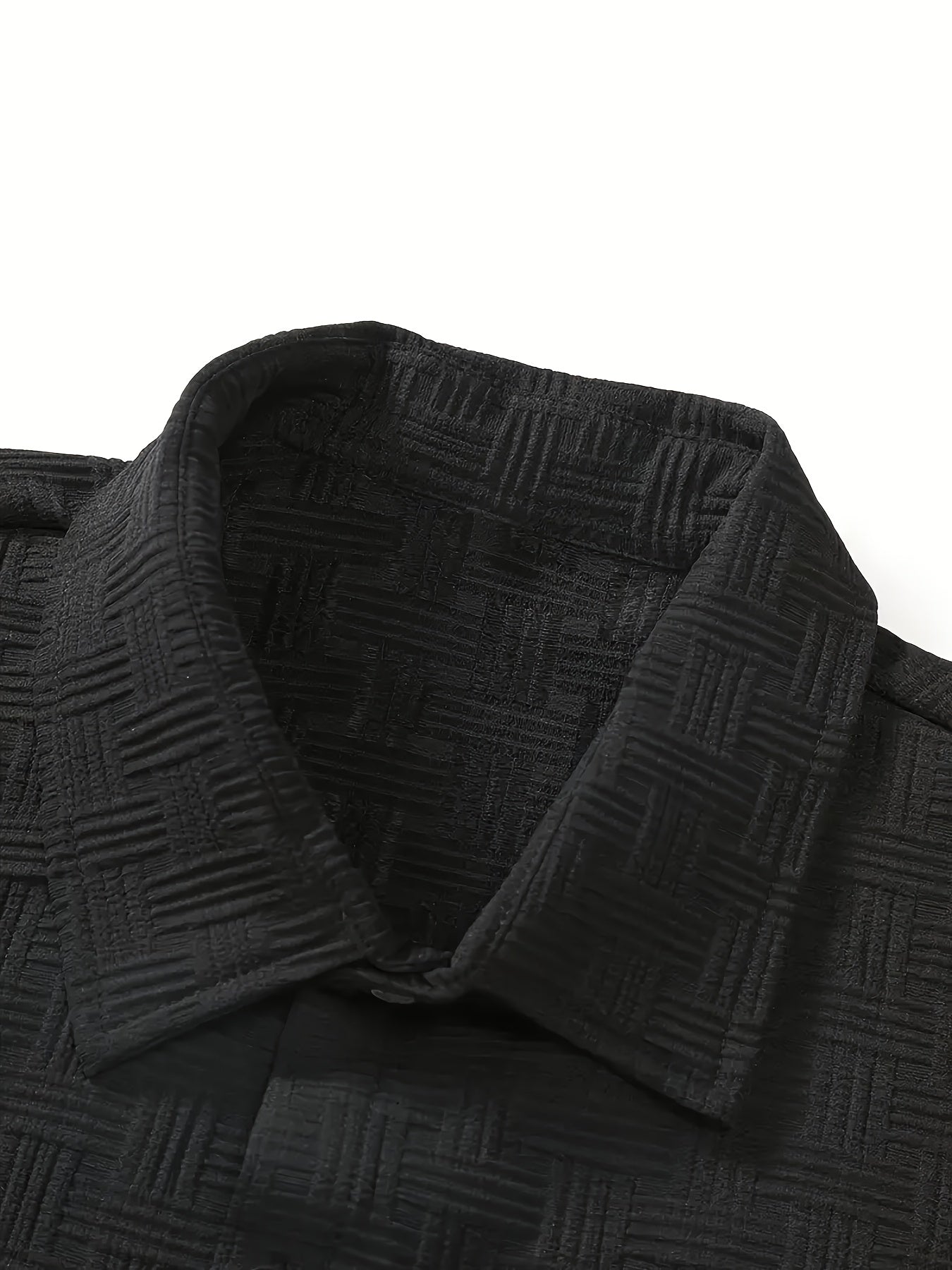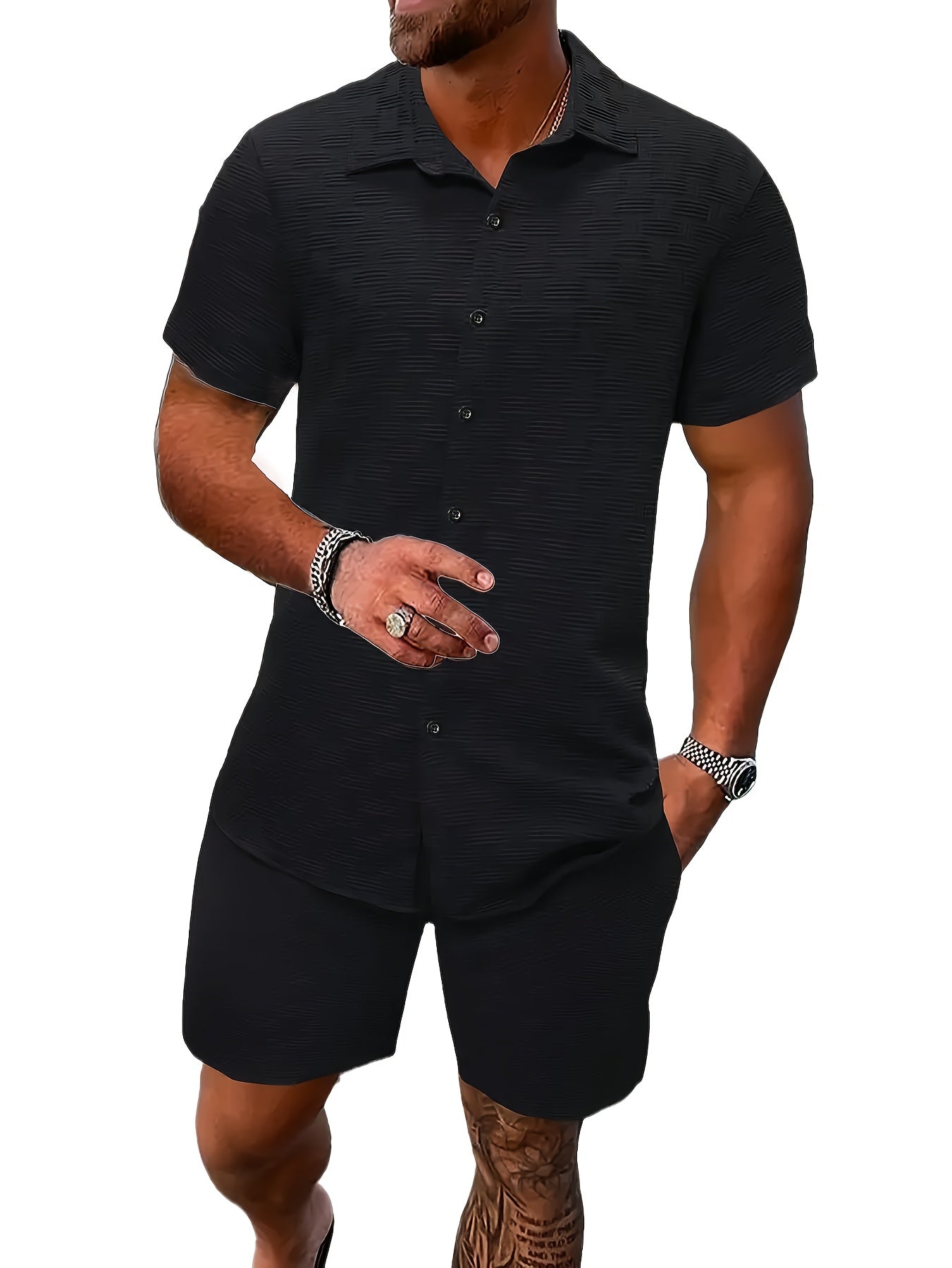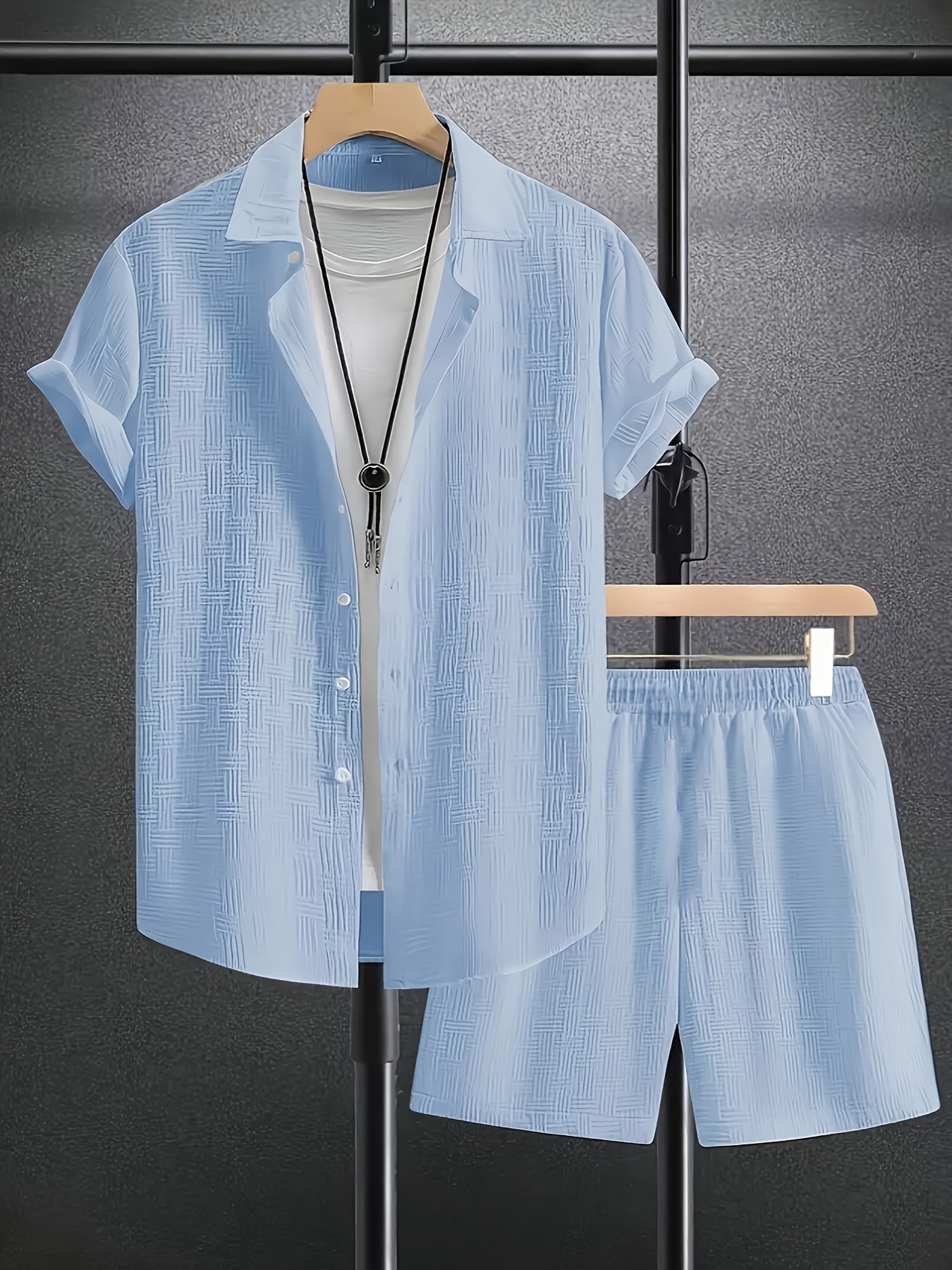 Տղամարդկանց ամառային առօրյա հագուստի 2 կտորից բաղկացած հավաքածու - պոլիեսթեր 100% նեղ, կարճ թևքով, կոճակներով վերնաշապիկ՝ օձիքով և համապատասխան շորտերով, սովորական երկարությամբ, հյուսված գործվածք, թեթևակի ձգվող, միագույն - Արտաքին գործունեության հագուստ