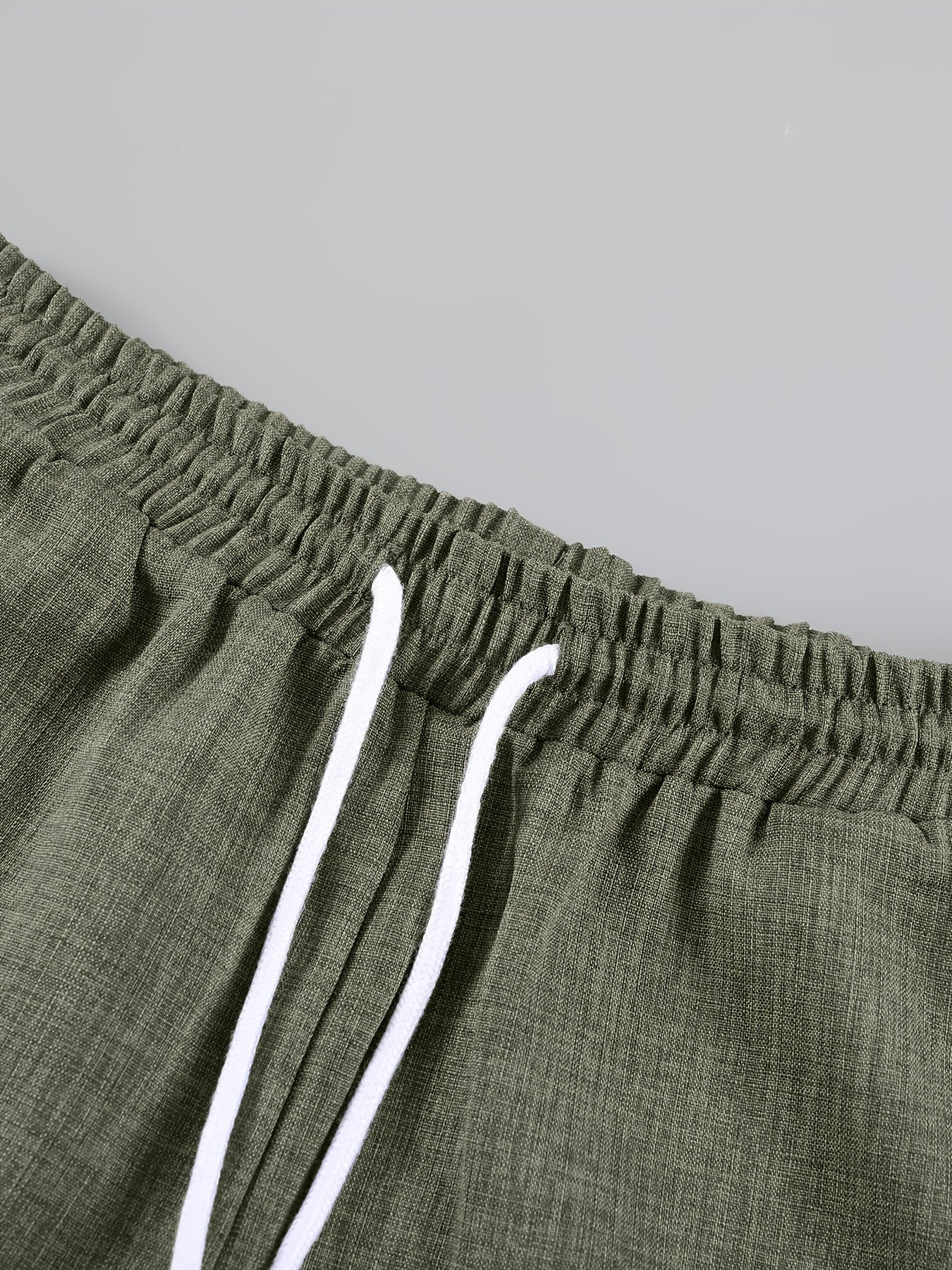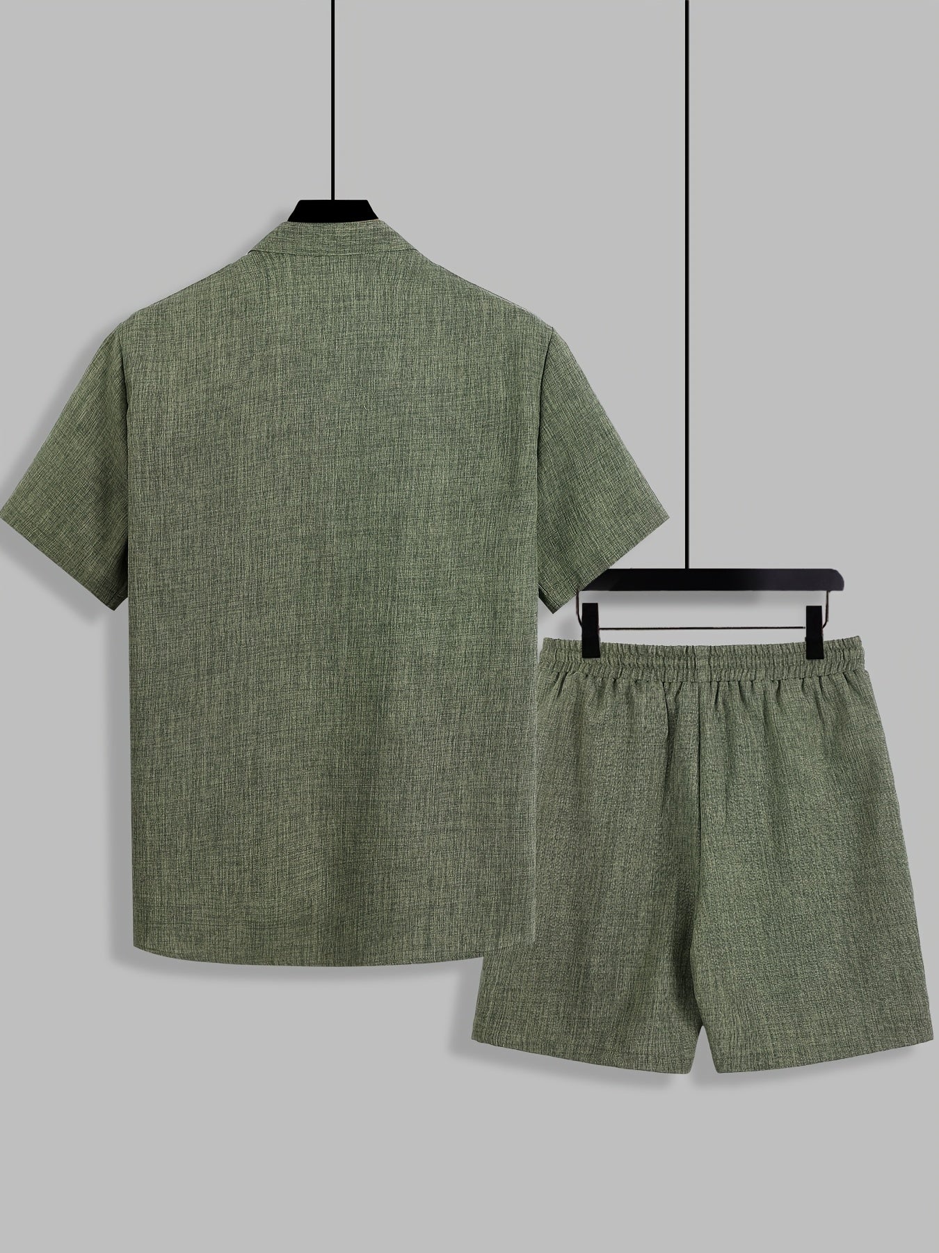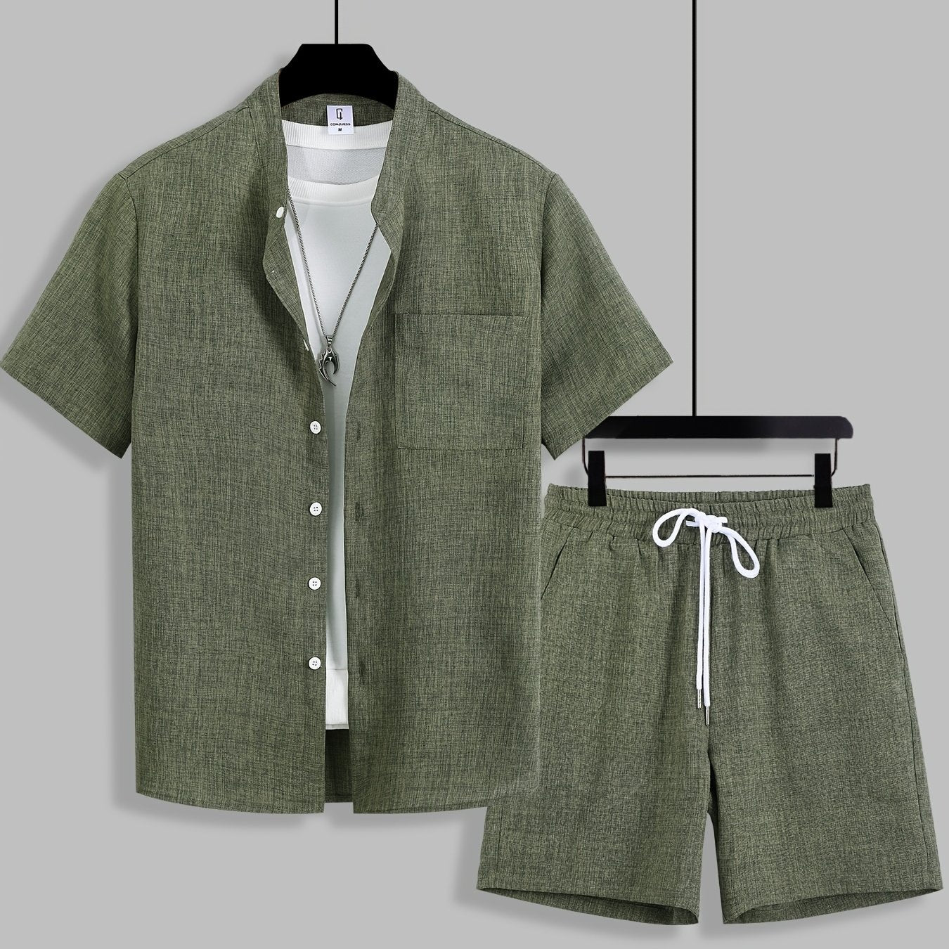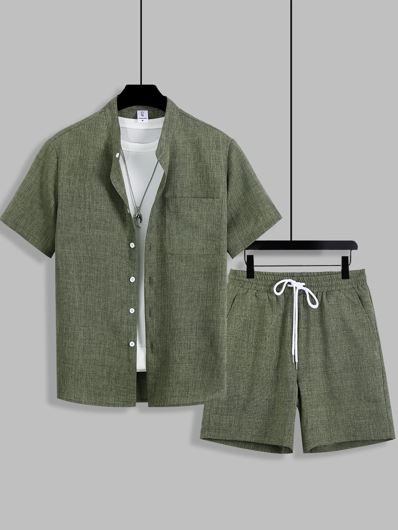 Տղամարդկանց ամառային հանդերձանք՝ միաձույլ գույնի կարճաթև կոճակով վերնաշապիկով, կանգառի օձիքով, կողային գրպաններով և սովորական շորտեր, կատարյալ տնային հագուստի համար: