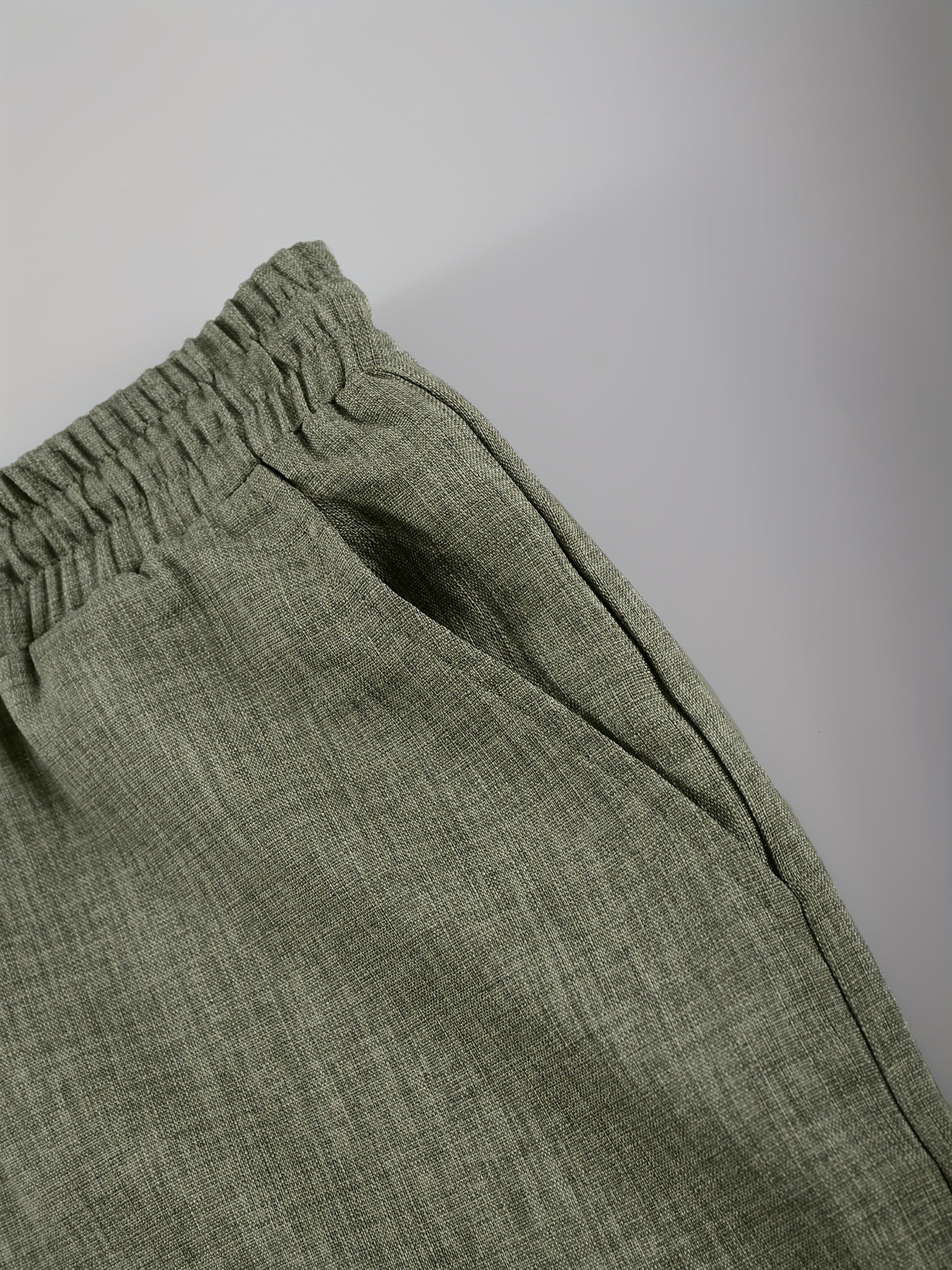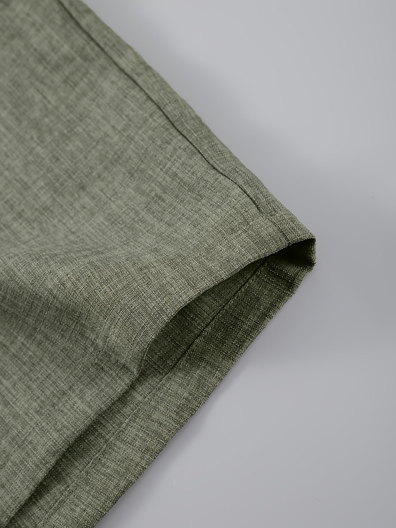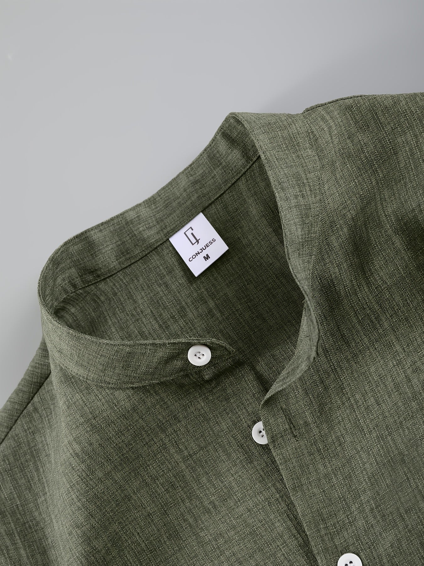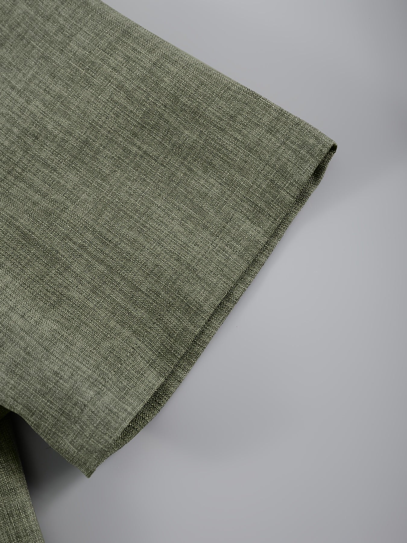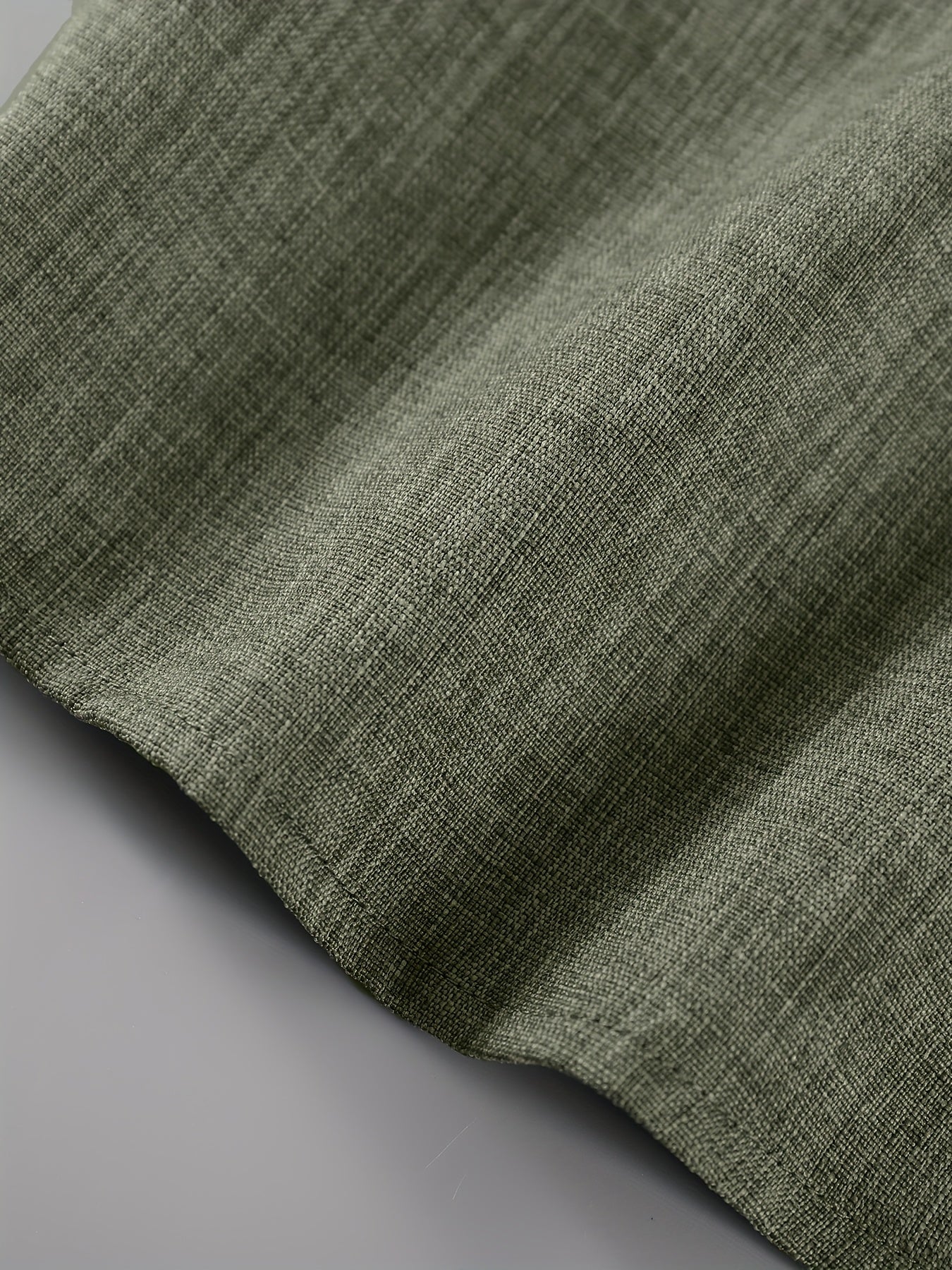 Տղամարդկանց ամառային հանդերձանք՝ միաձույլ գույնի կարճաթև կոճակով վերնաշապիկով, կանգառի օձիքով, կողային գրպաններով և սովորական շորտեր, կատարյալ տնային հագուստի համար: