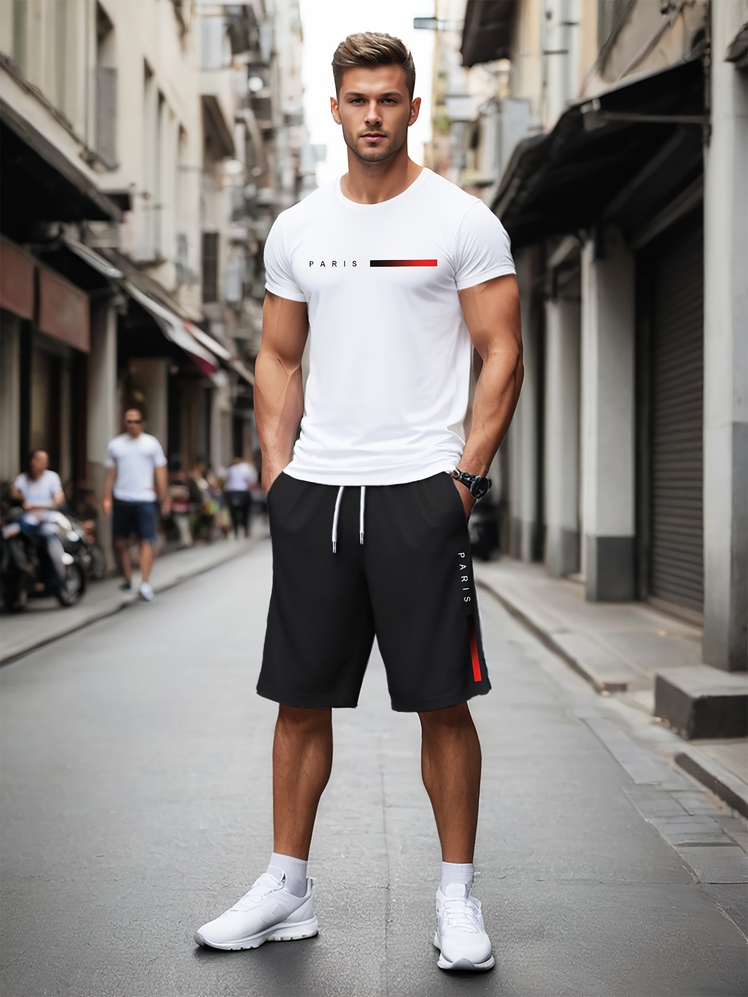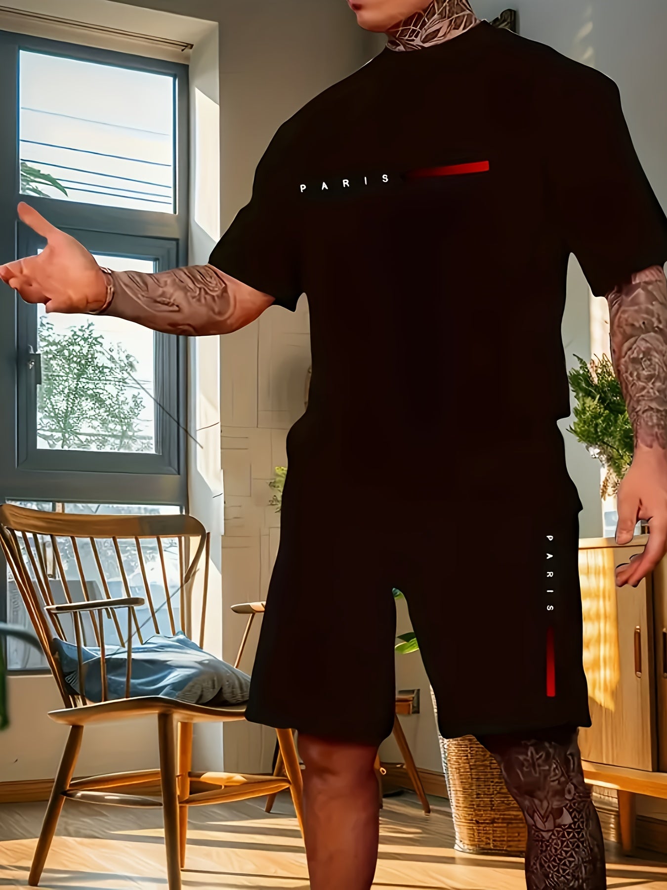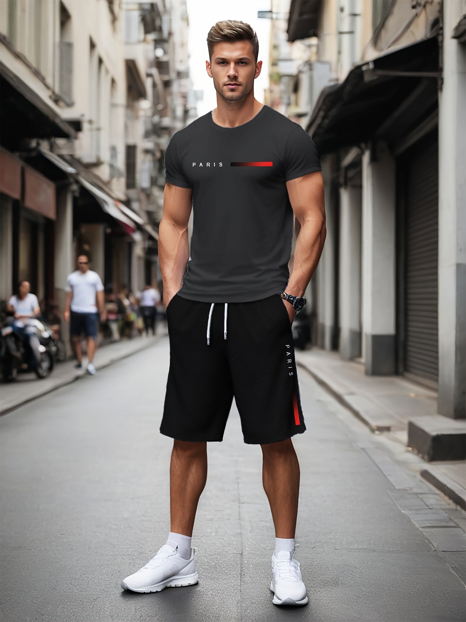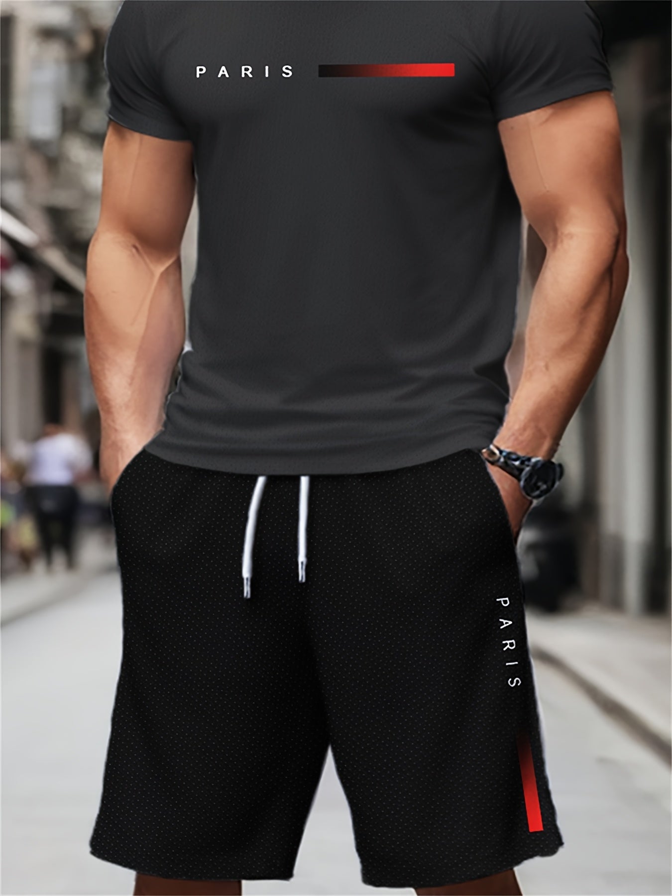Տղամարդկանց ամառային սպորտային մարզումների հավաքածու՝ կարճաթև շապիկ և շորտեր «PARIS» պրինտով, տրիկոտաժե գործվածք, թեթև ձգվող, պոլիեսթեր և սպանդեքս խառնուրդ, սովորական տեղավորմամբ: