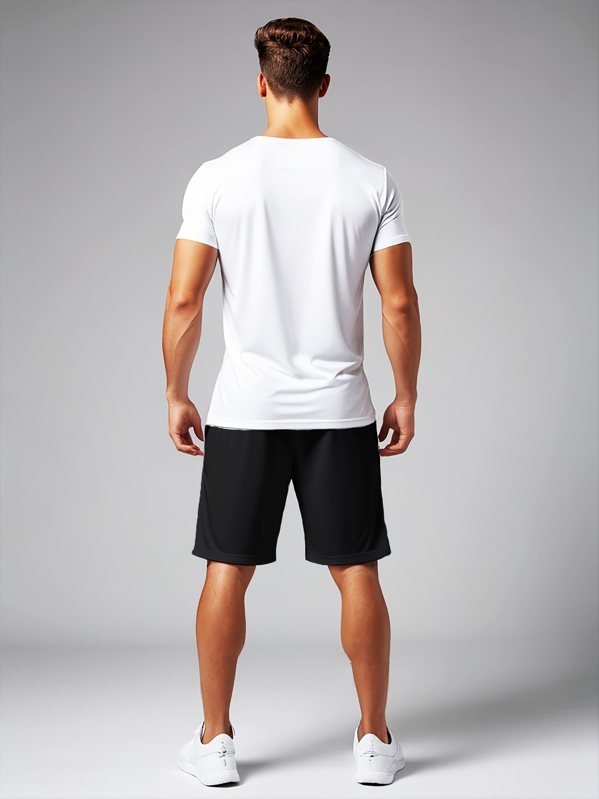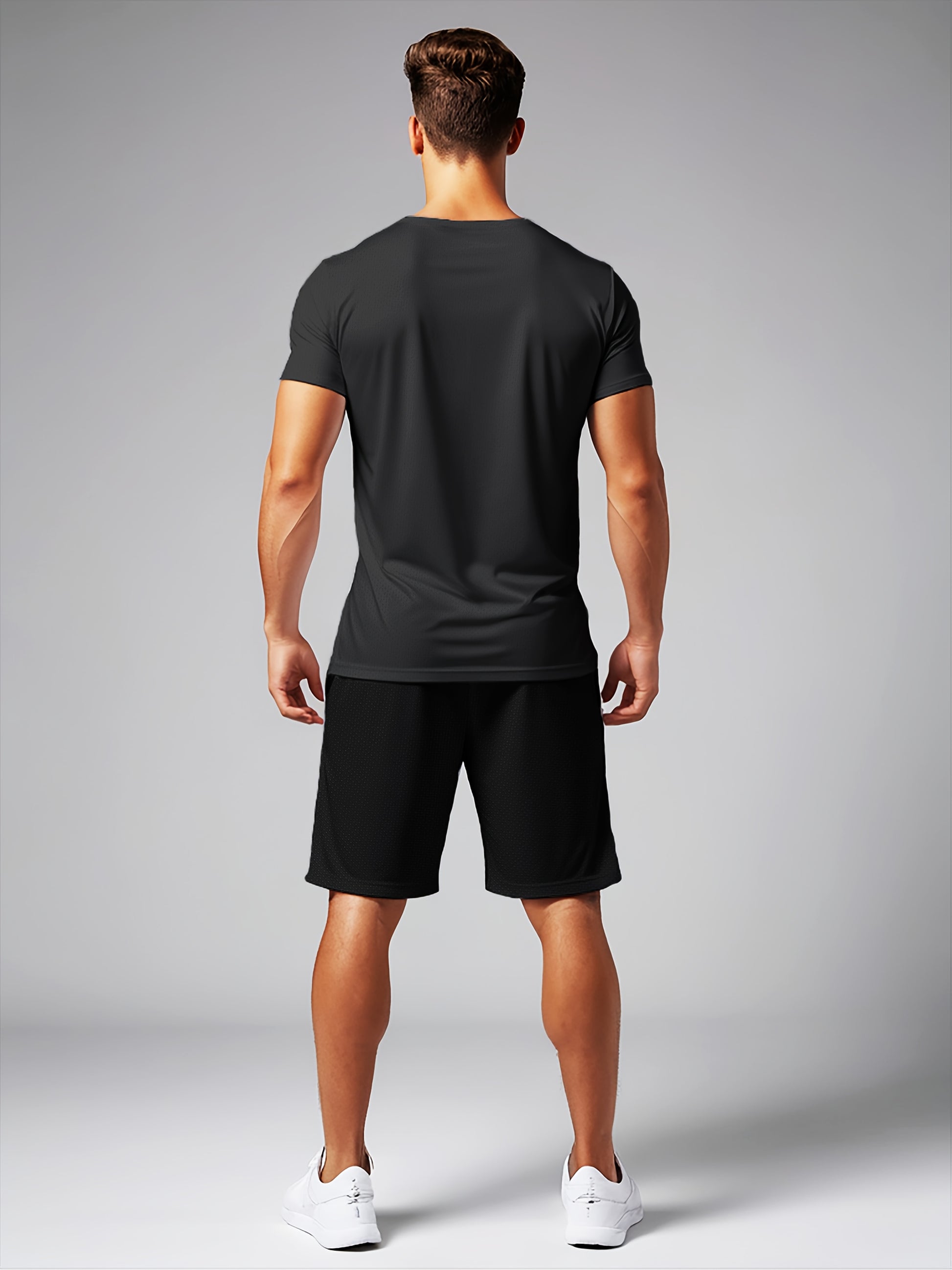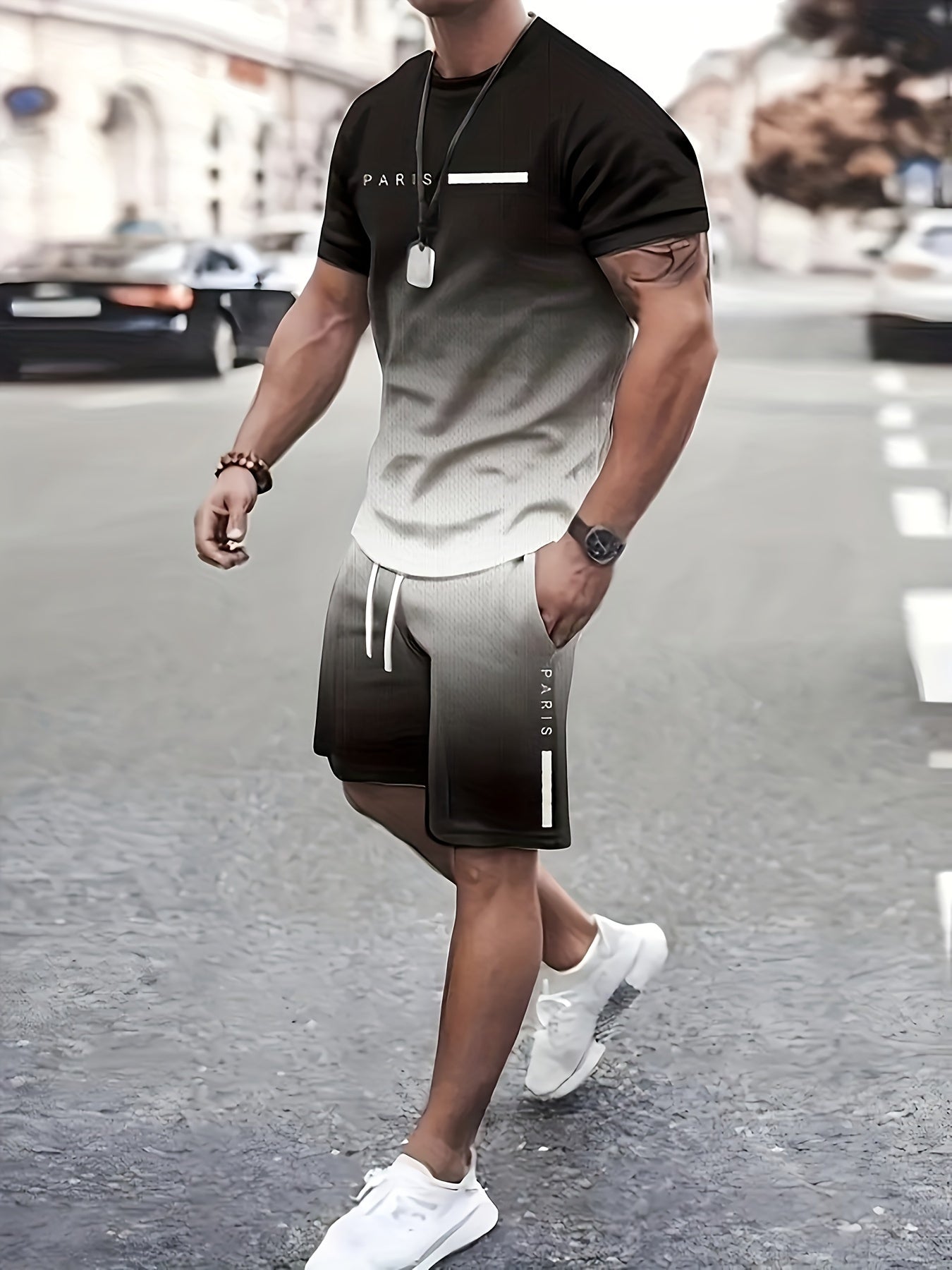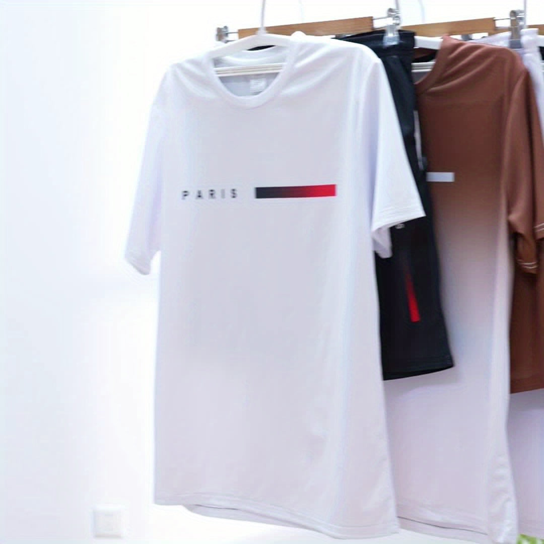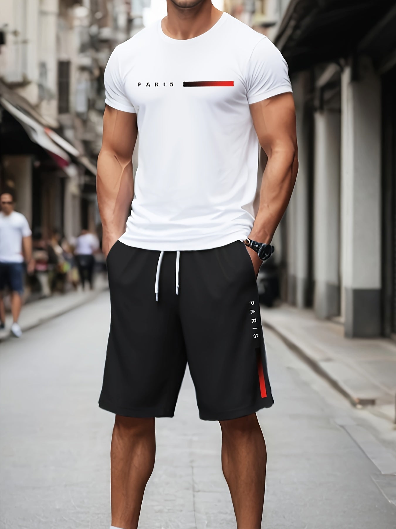 Տղամարդկանց ամառային սպորտային մարզումների հավաքածու՝ կարճաթև շապիկ և շորտեր «PARIS» պրինտով, տրիկոտաժե գործվածք, թեթև ձգվող, պոլիեսթեր և սպանդեքս խառնուրդ, սովորական տեղավորմամբ:
