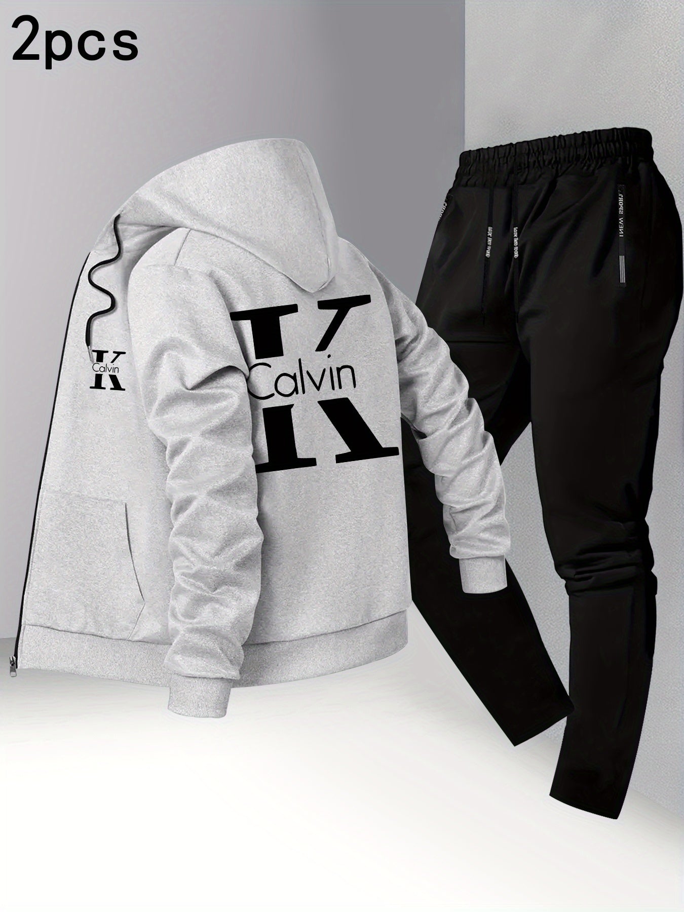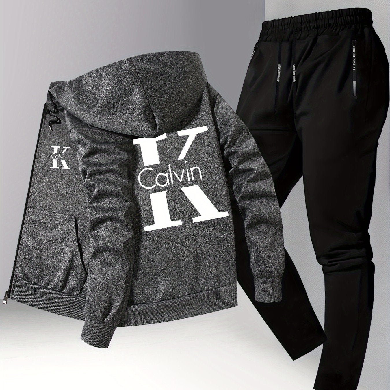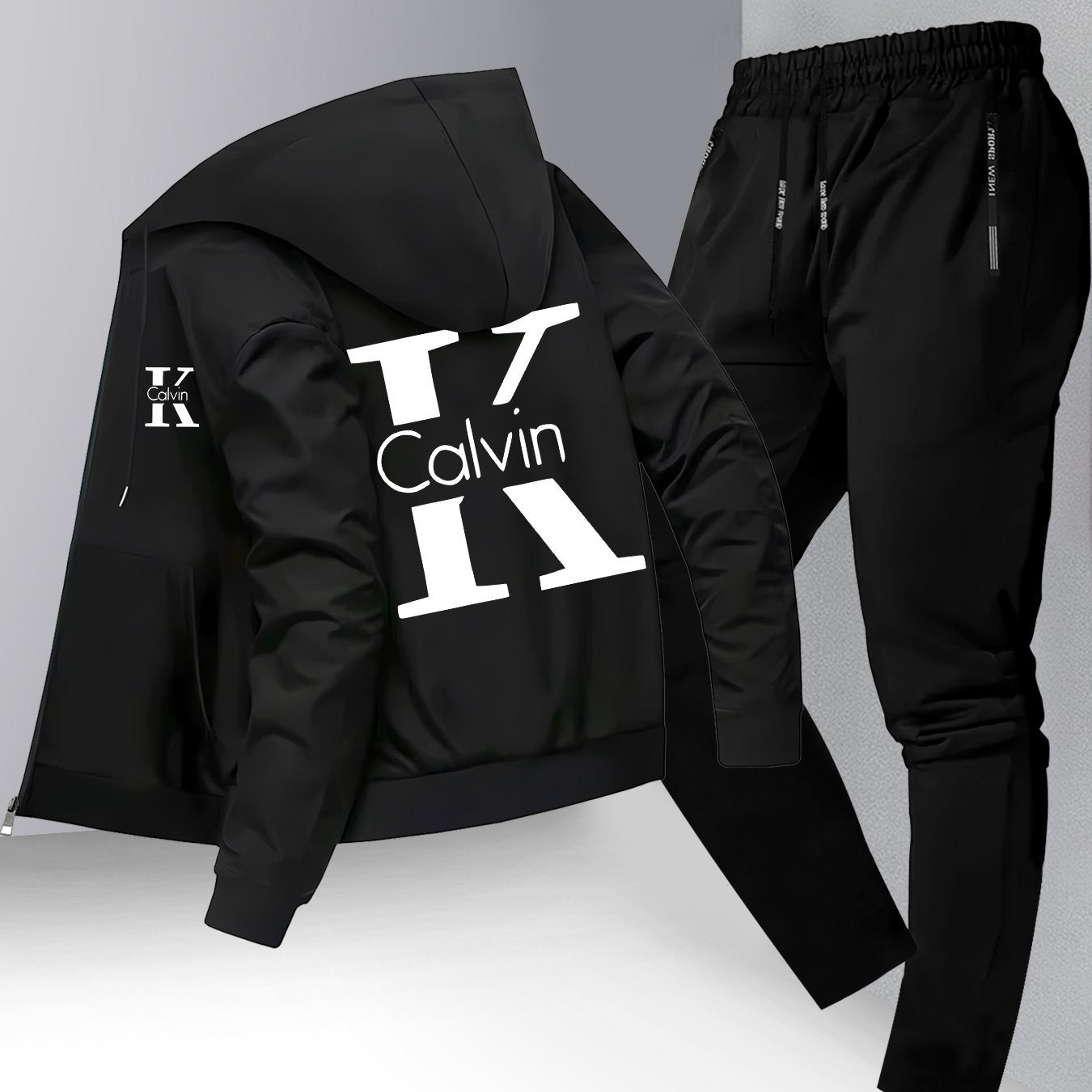 Men's Trendy Autumn/Winter Hooded Jacket and Shirt Two-Piece Set with CK Print, Casual Business Outfit, Youth Leisure Baseball Uniform Stand Collar Suit