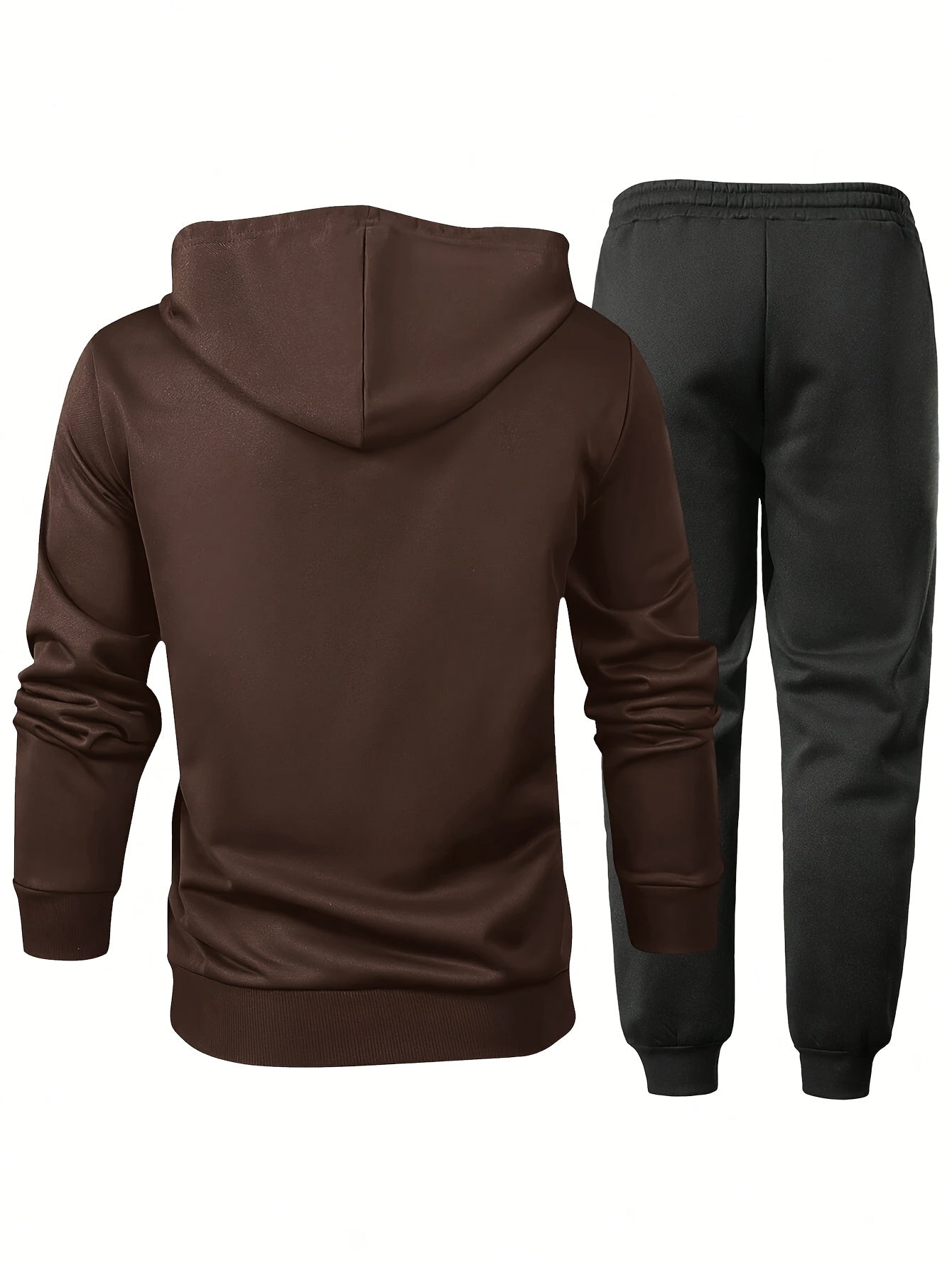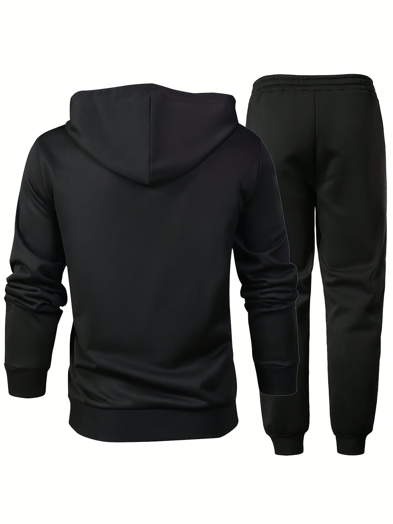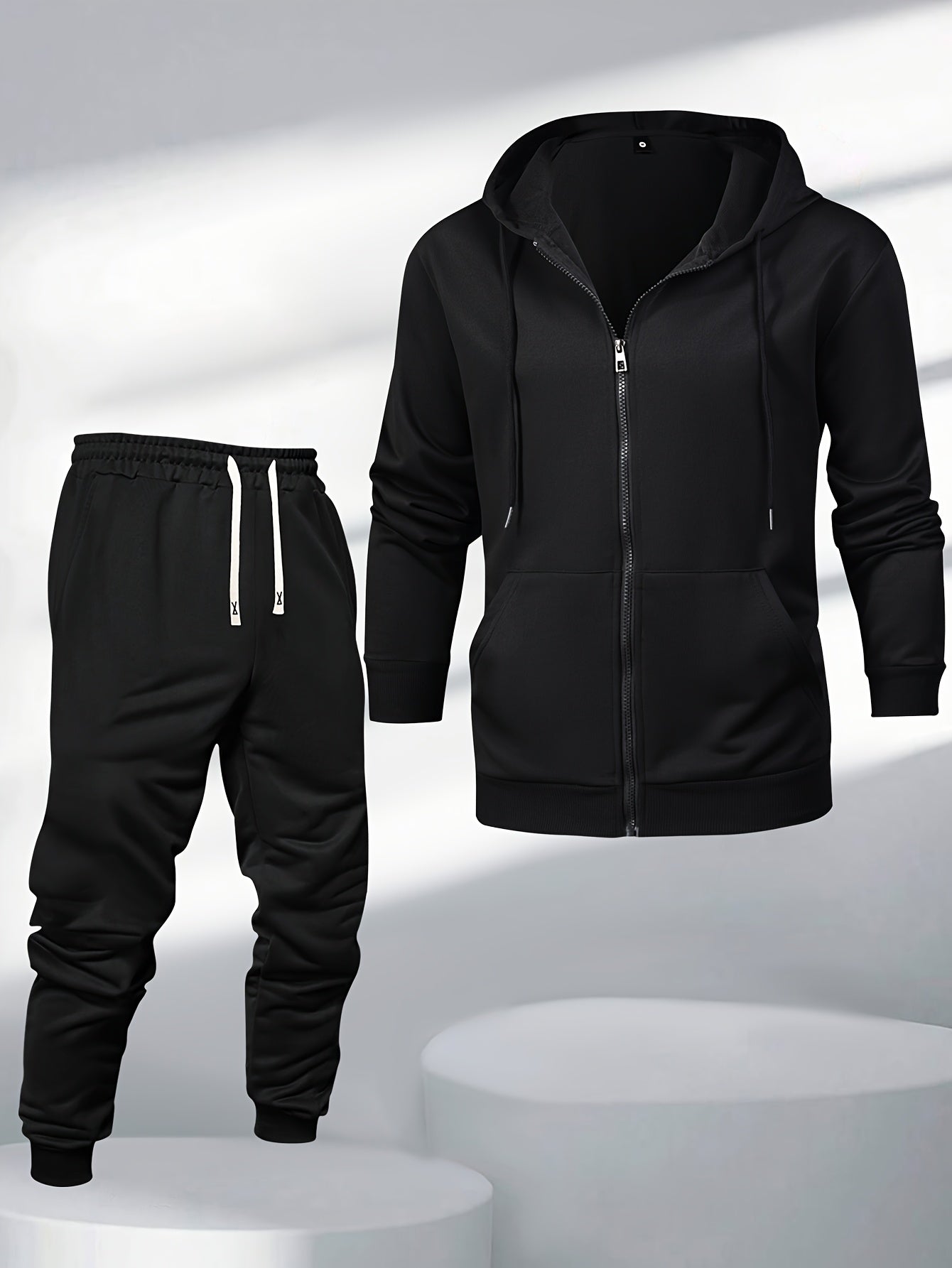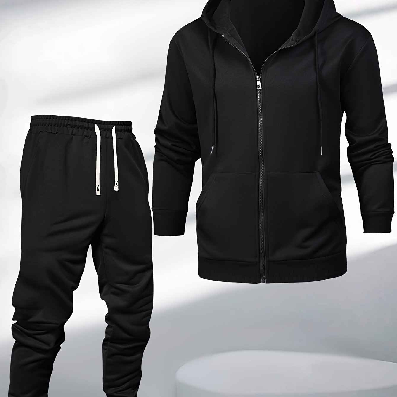 Men's Two-Piece Sportswear Suit: Zipper Hoodie + Sweatpants Set, Spring/Autumn Solid Color Regular Long Sleeve Zipper Hoodie with Drawstring, Threaded Trousers, Casual Sportswear Two-Piece Set