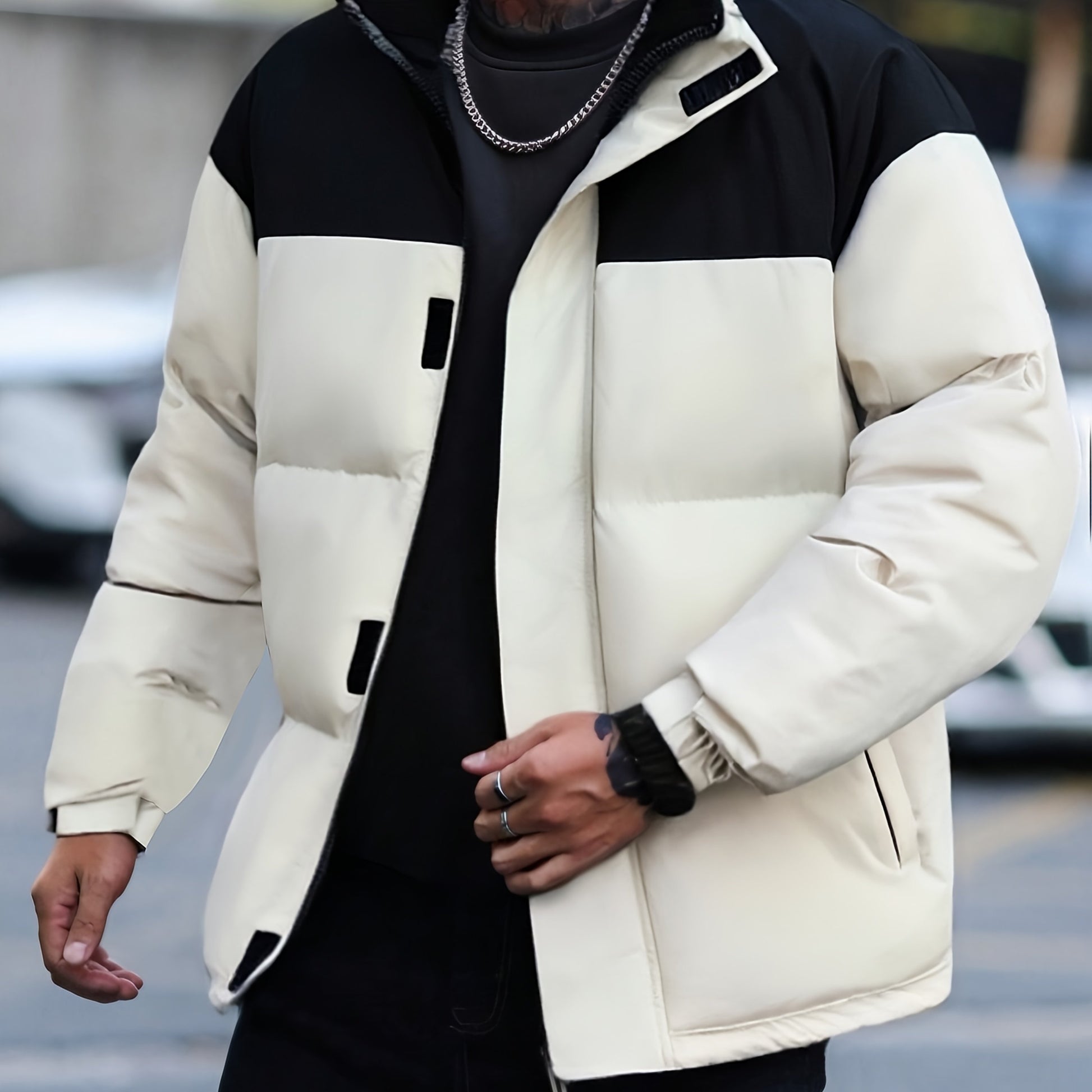 Տղամարդու ձմեռային գունային բլոկներով բաճկոն՝ կանգնած օձիքով - սև և առօրյա տաք վերարկու՝ բացօթյա օգտագործման համար, պոլիեսթերով լցված կայծակաճարմանդ առջևի մասով, սովորական չափսի՝ ցուրտ եղանակի համար, չձգվող գործվածք
