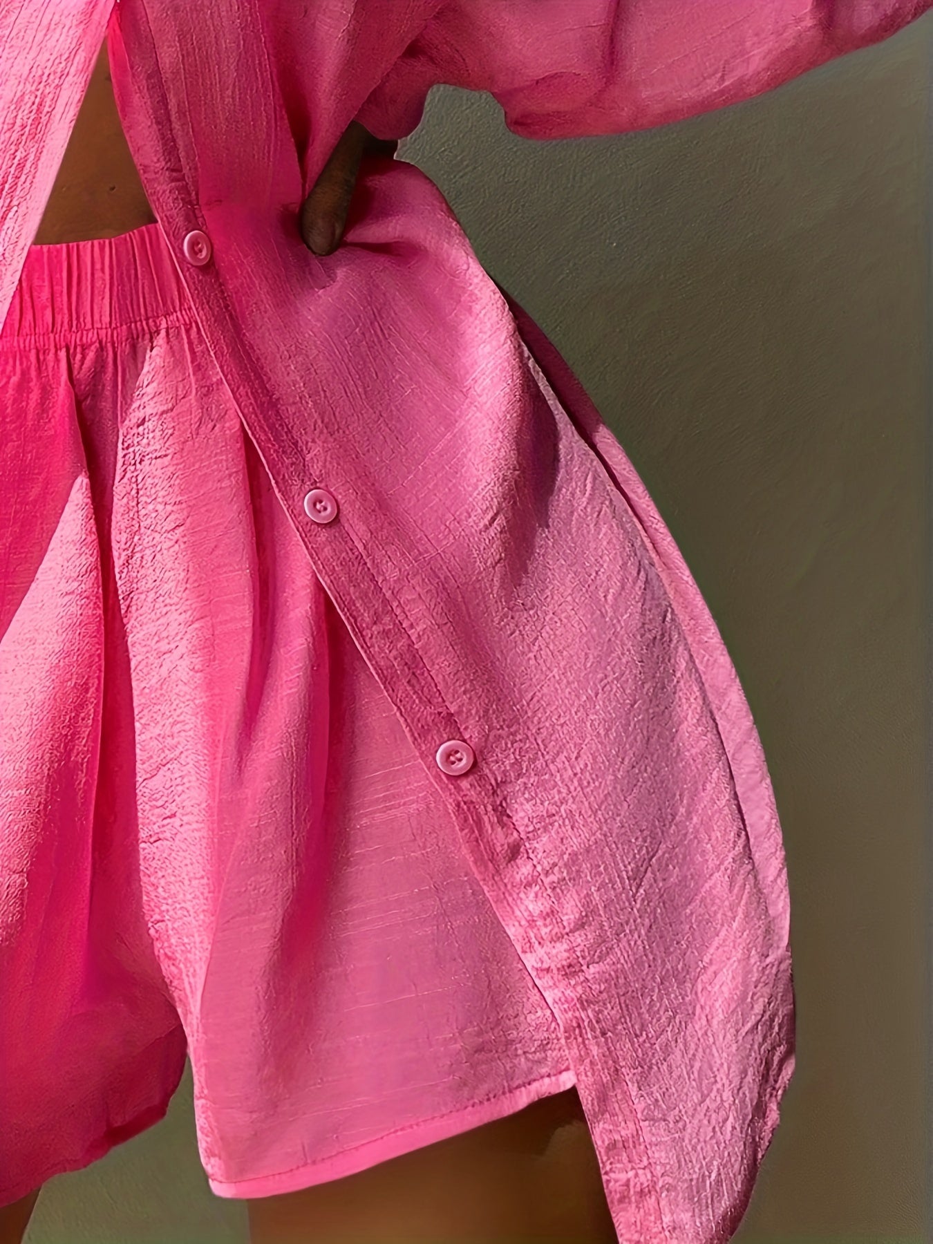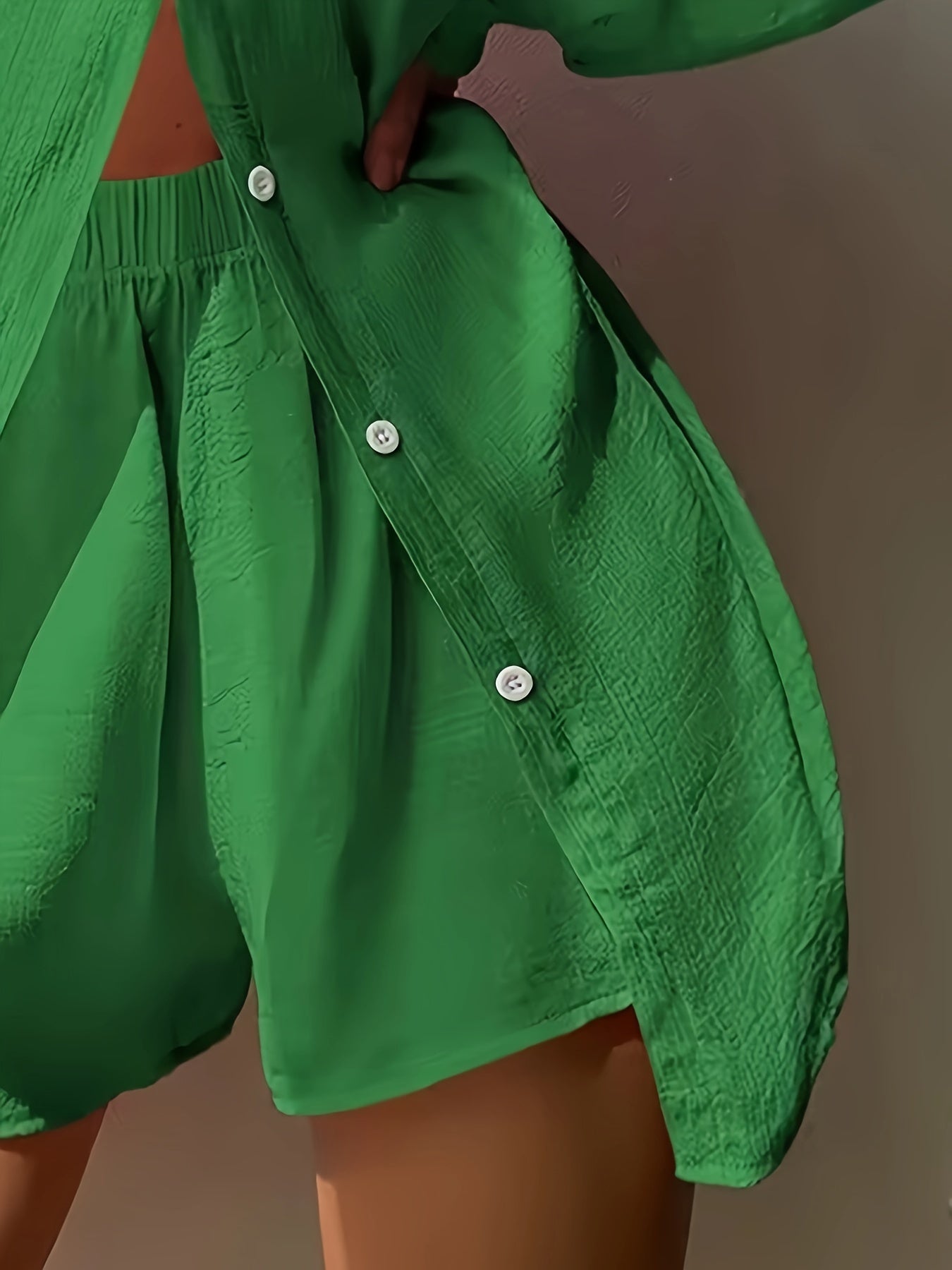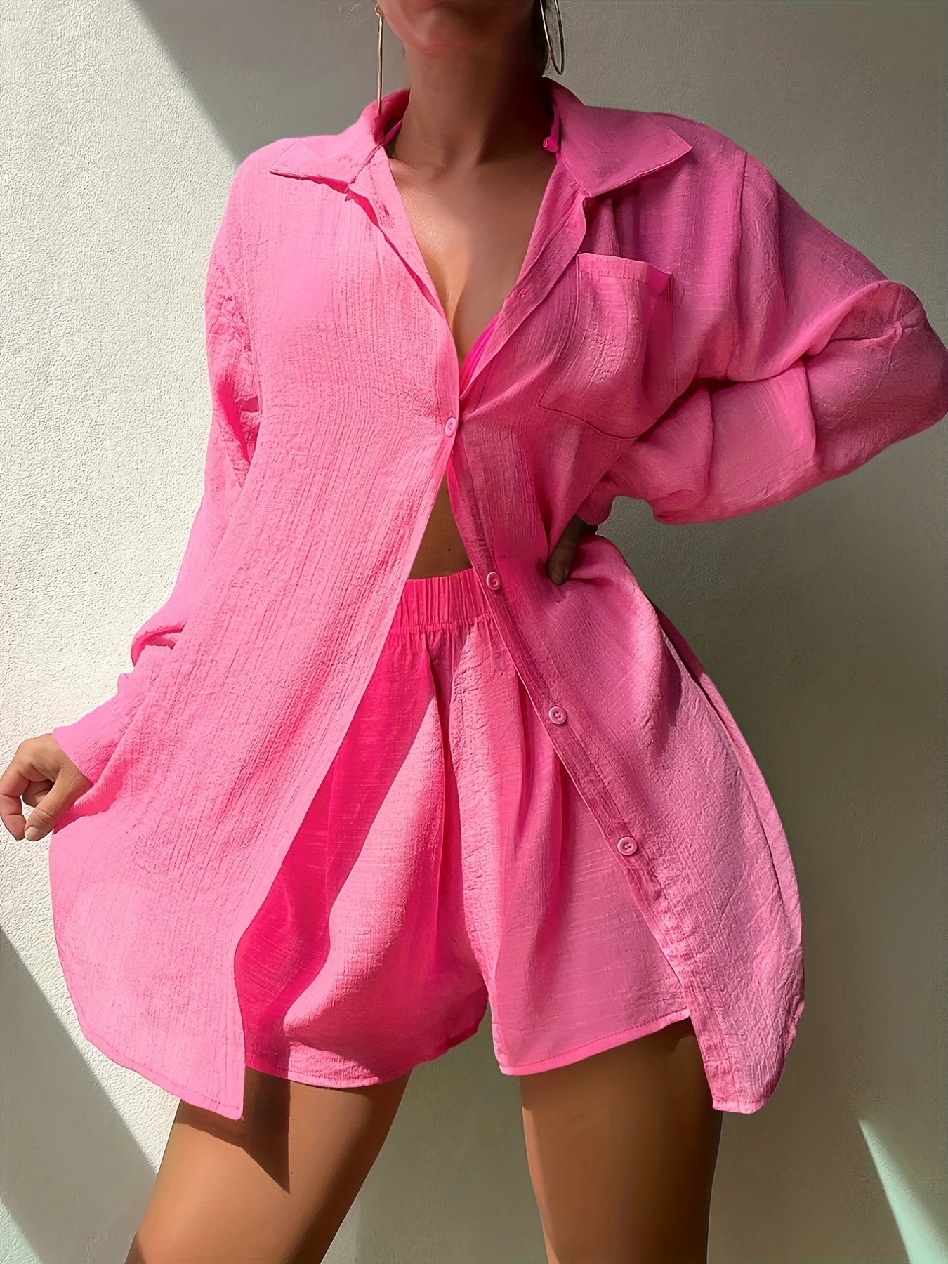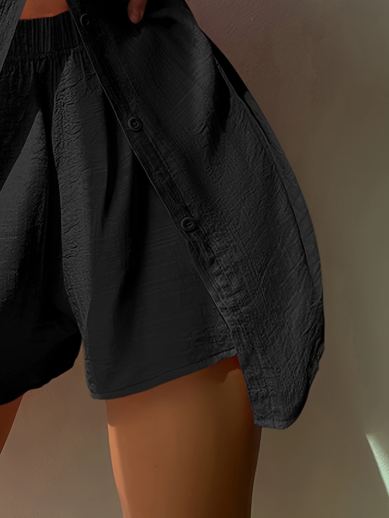 MOXDO կանացի ամառային ծովափնյա արձակուրդային պատահական հանդերձանք - պինդ սև վիսկոզայի խառնուրդ վերնաշապիկ և շորտեր՝ առաձգական գոտկատեղով, առջևի կոճակով և արևապաշտպան երկար թևերով