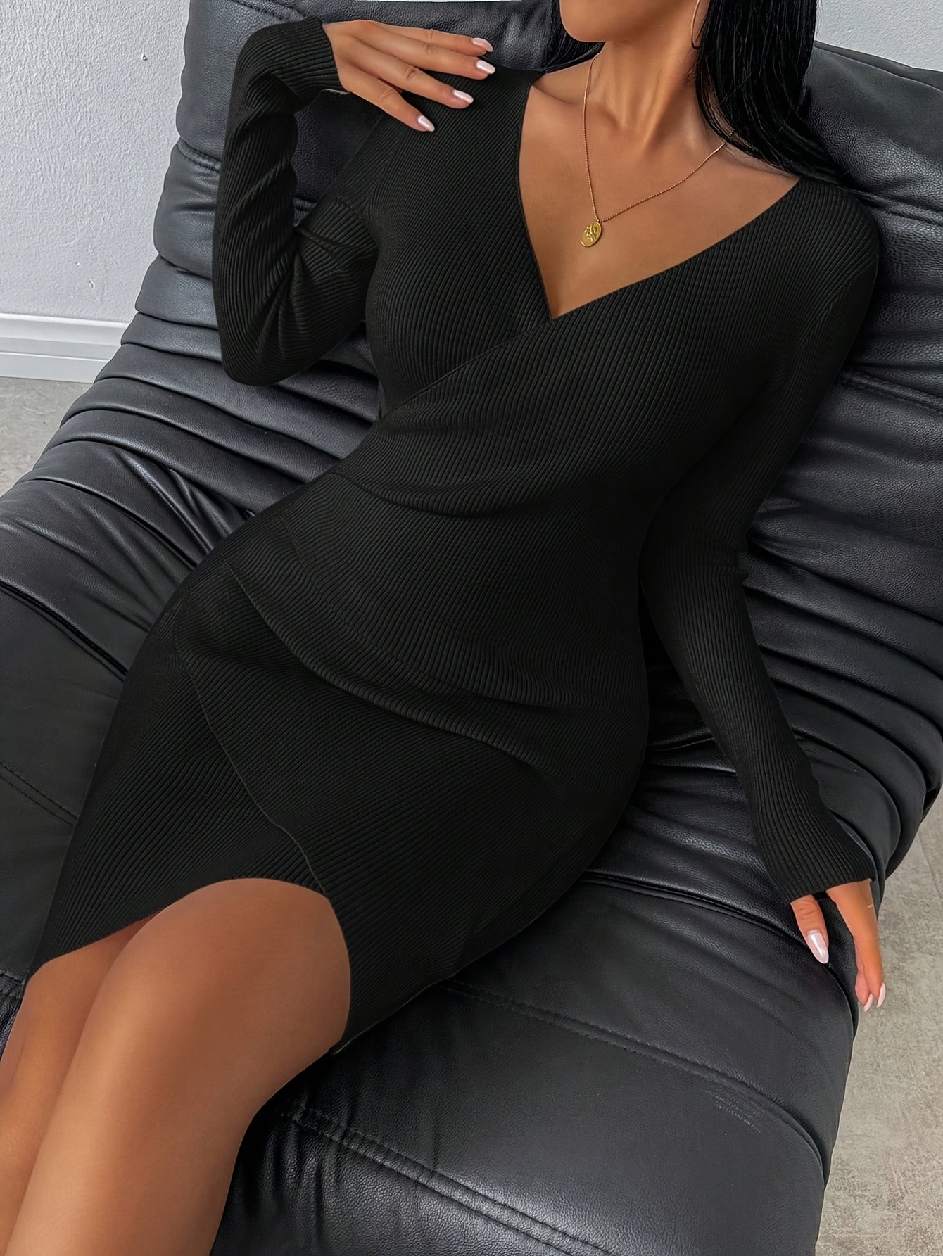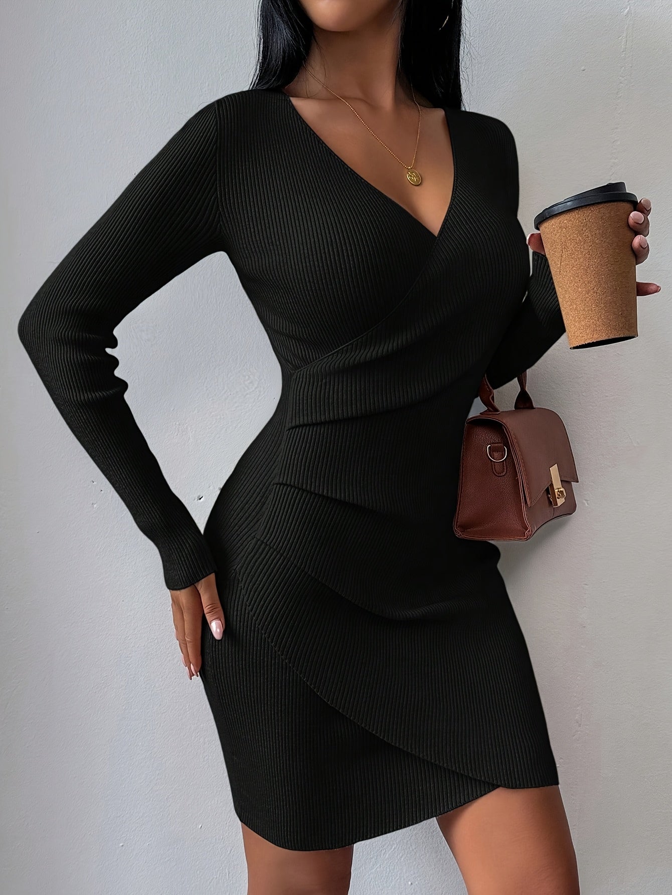 Նոր աշնանային և ձմեռային նեղ, V-ձև դեկոլտեով զգեստ՝ ձգվող և գրավիչ փաթաթվող դիզայնով, էլեգանտ միագույն մինի զգեստ՝ աշխատանքի և ժամադրությունների համար