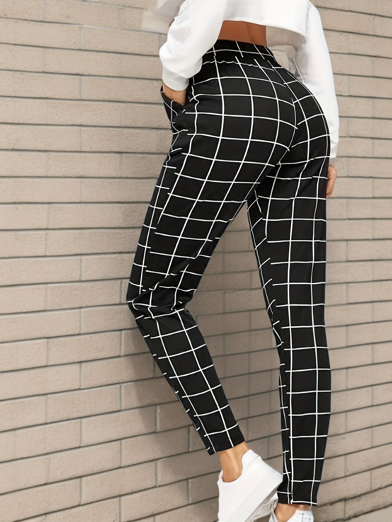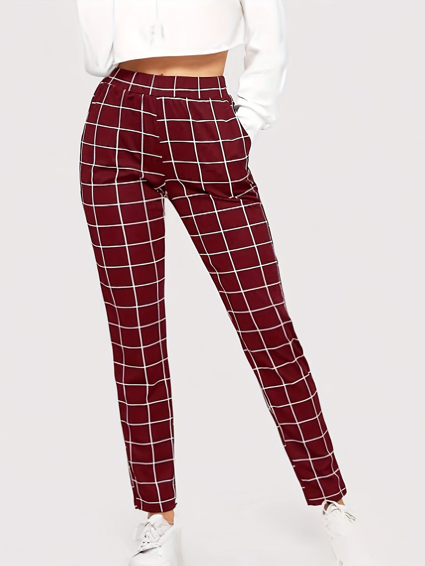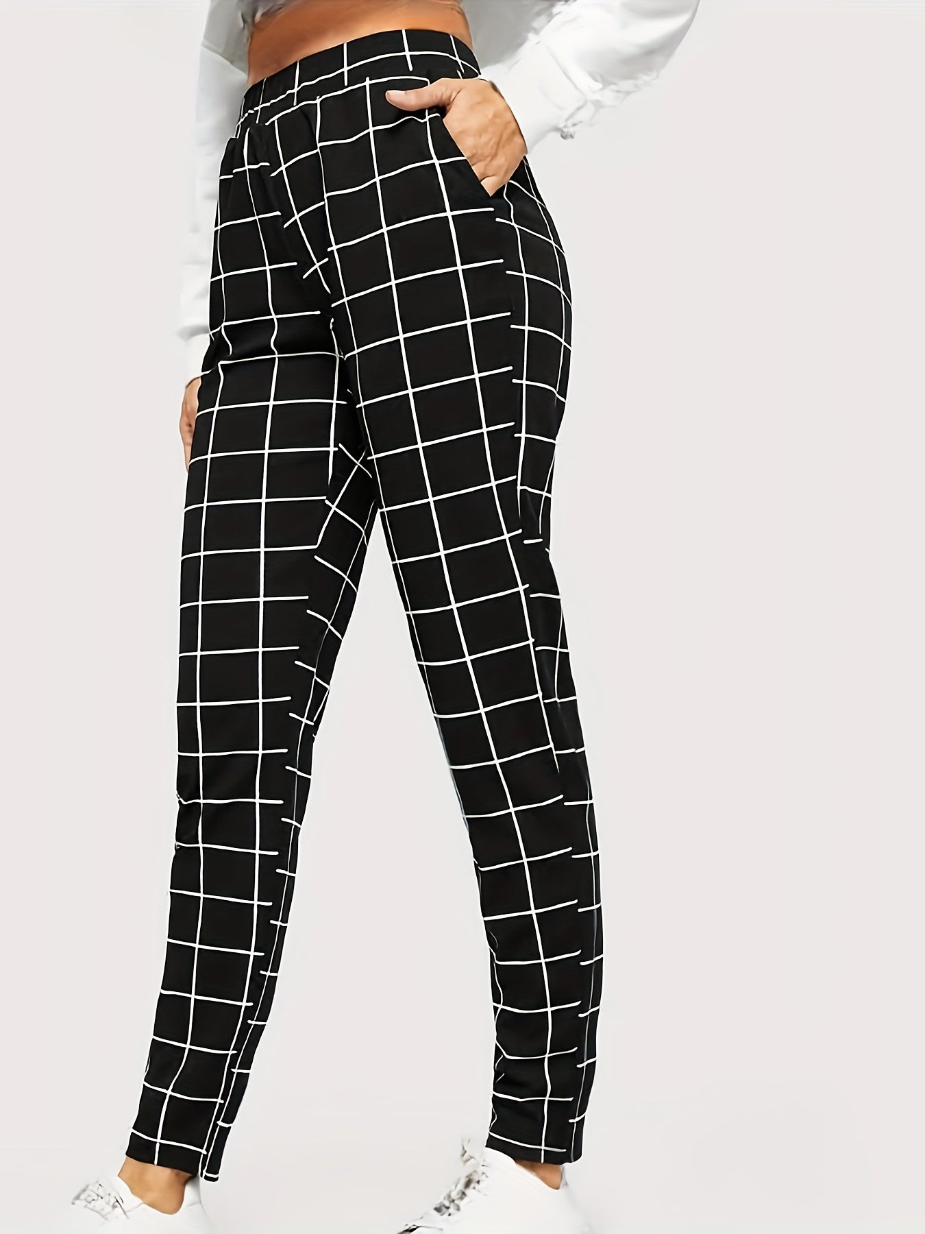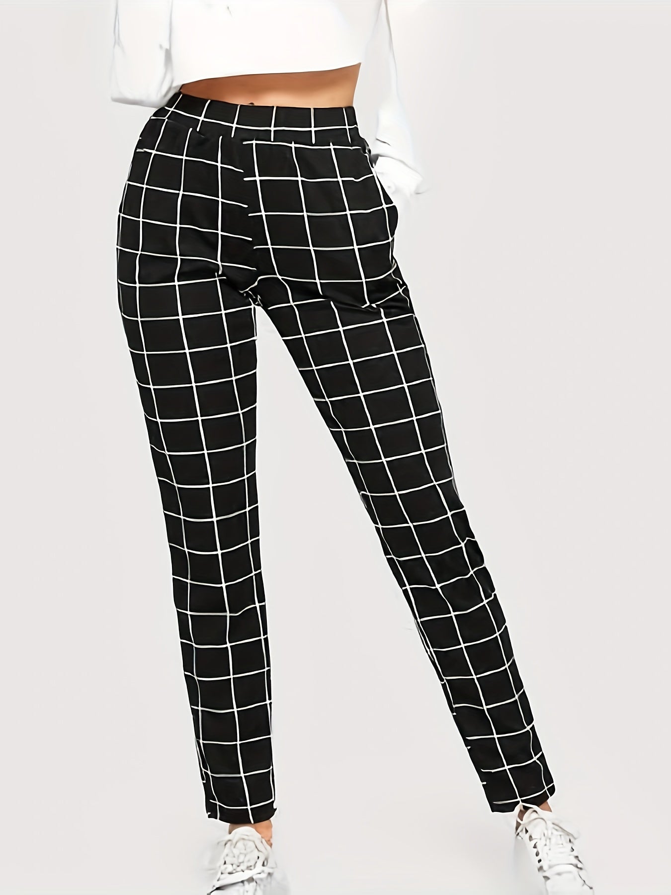 Վանդակավոր տպագրություն Բարձր գոտկատեղի շալվար Նրբագեղ ուղիղ ոտքի թեք գրպաններ Տաբատ, կանացի հագուստ