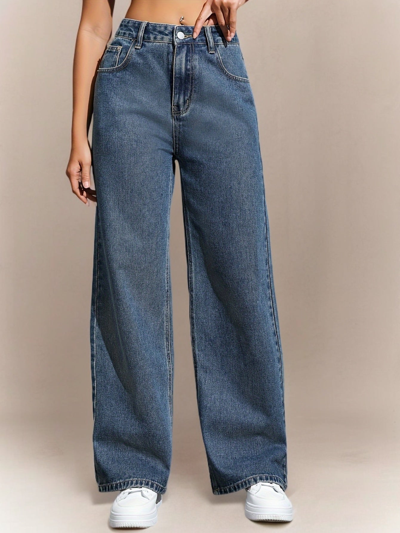 Պարզ լվացված կապույտ ազատ Fit Casual Slash գրպանի ջինսե ջինսե տաբատ, կանացի ջինսե ջինսեր և հագուստ աշնանային համար