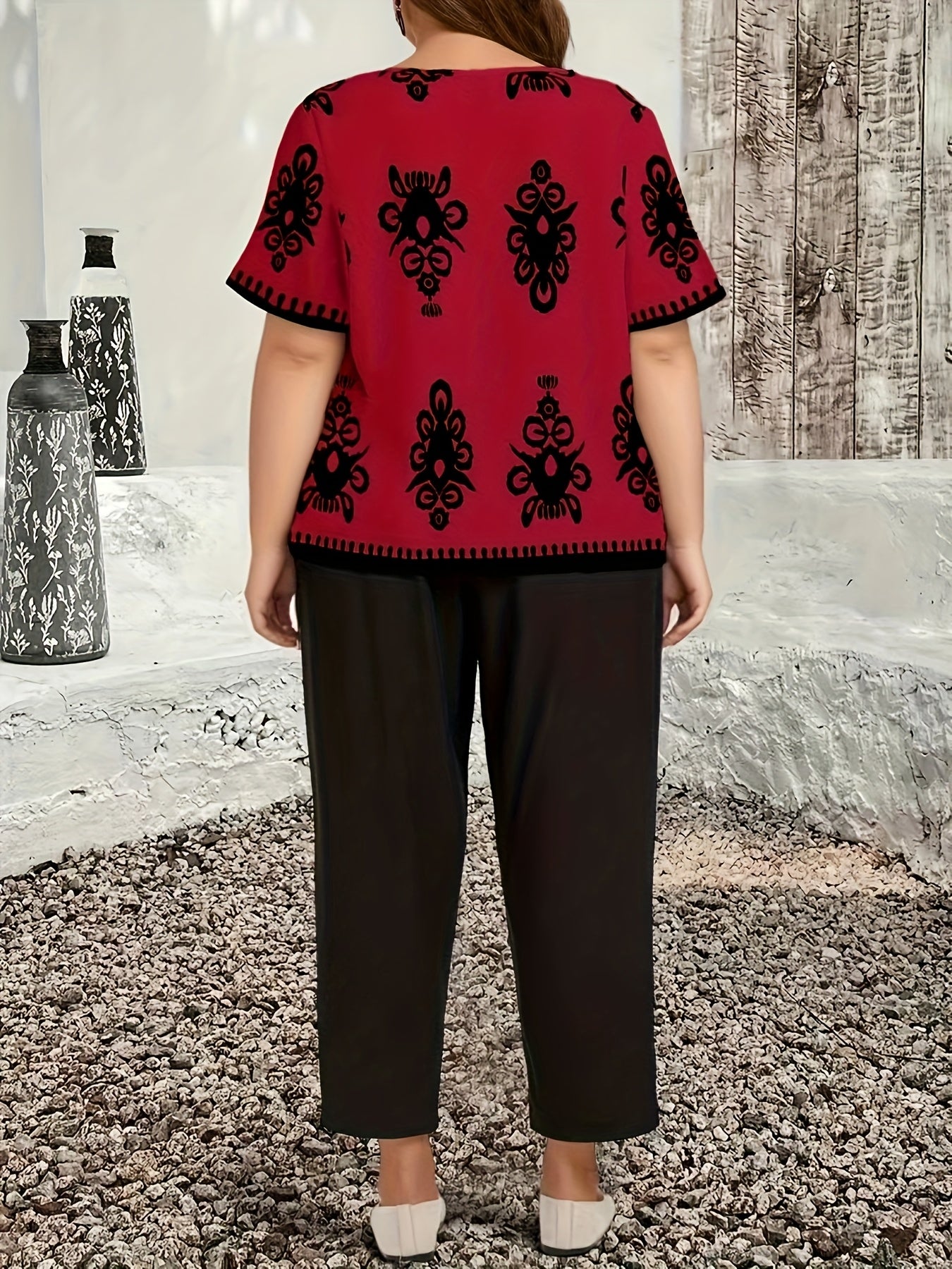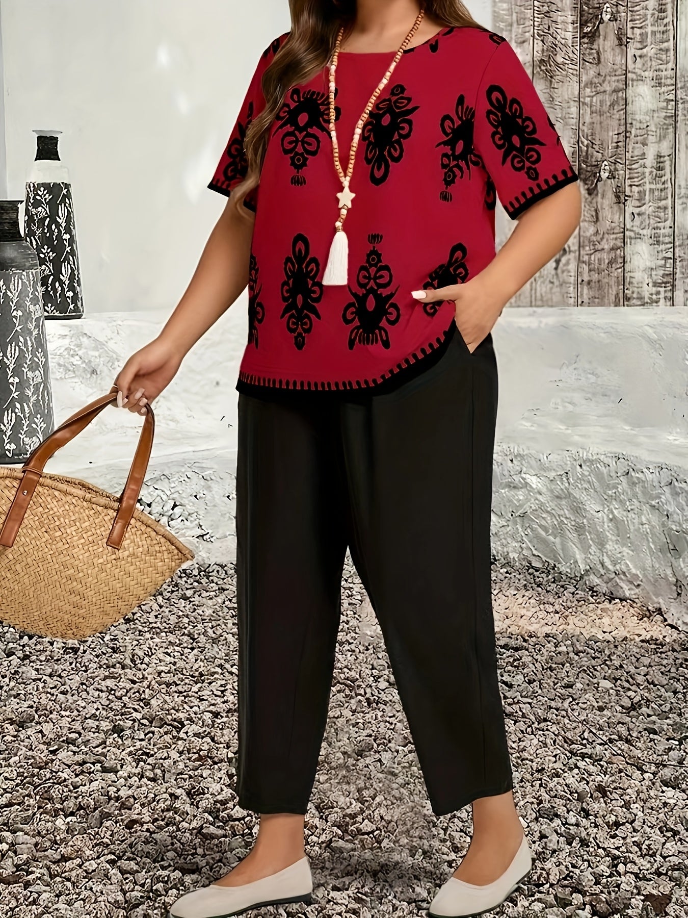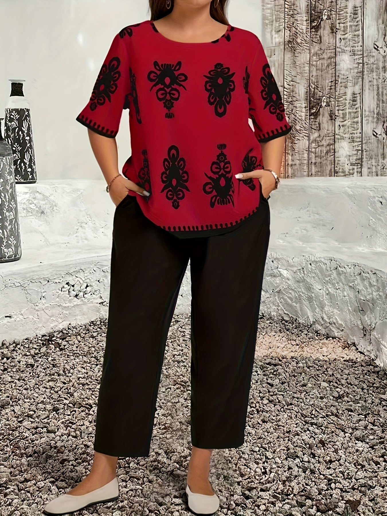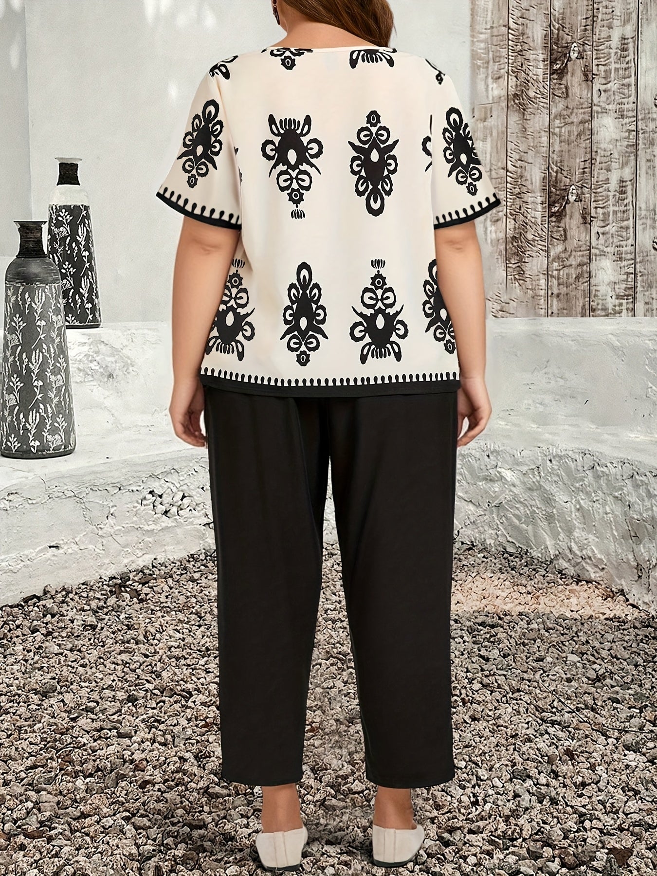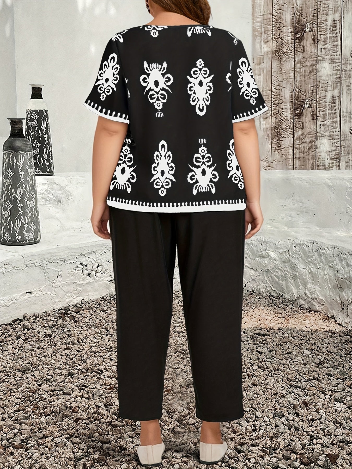 Մեծ չափսի առօրյա, գյուղական նախշերով, ազատ, երկար թևքերով սվիտեր և տաբատ՝ երկու մասից բաղկացած հավաքածու, էլեգանտ աշնանային Լեոնի