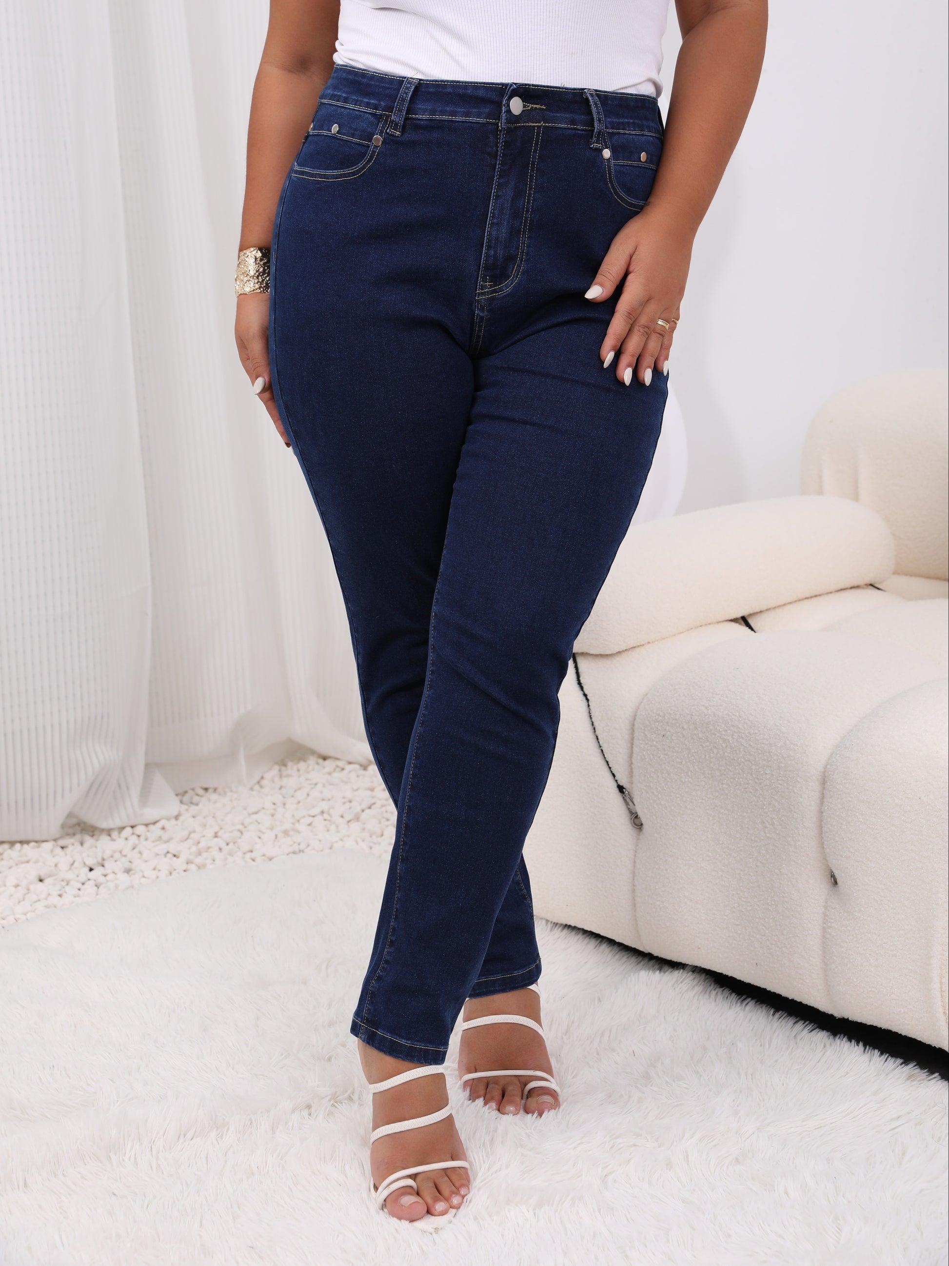 Plus Size Casual Jeans, Women's Plus Solid Button Fly Բարձրաճճի բարձր ձգվող ջինսեր