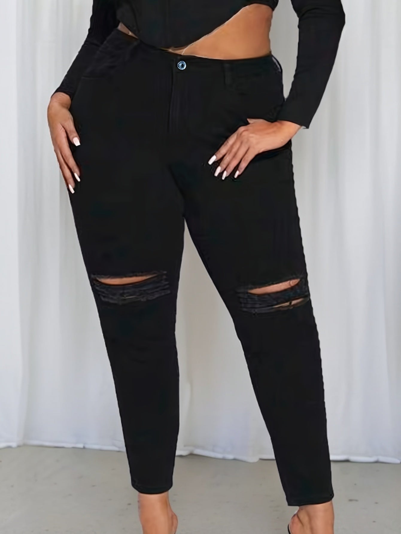 Պլյուս չափի պատահական ջինսեր, կանացի պլյուս պինդ պոկված կոճակով թռչող բարձրաճ բարձր ձգվող ջինսեր