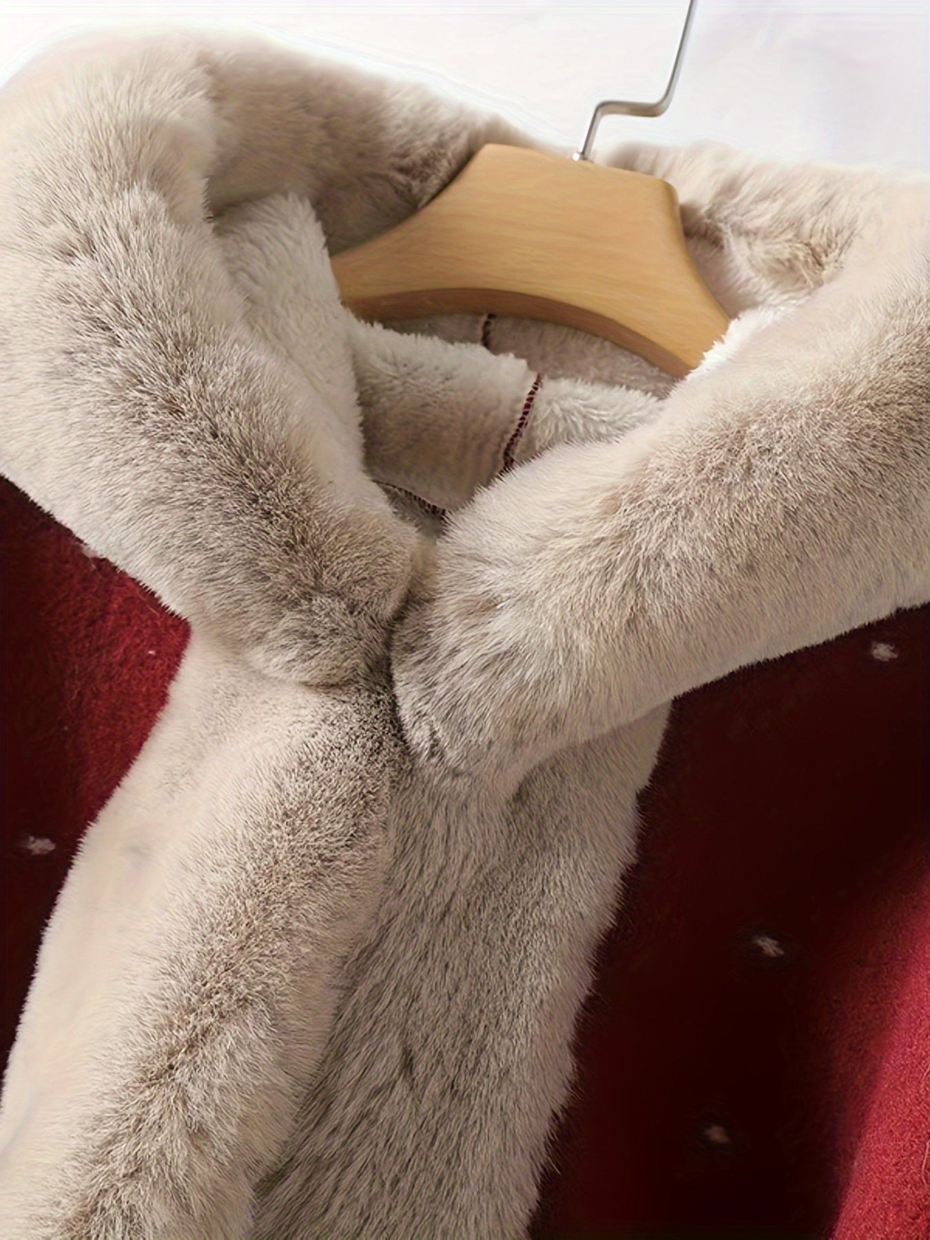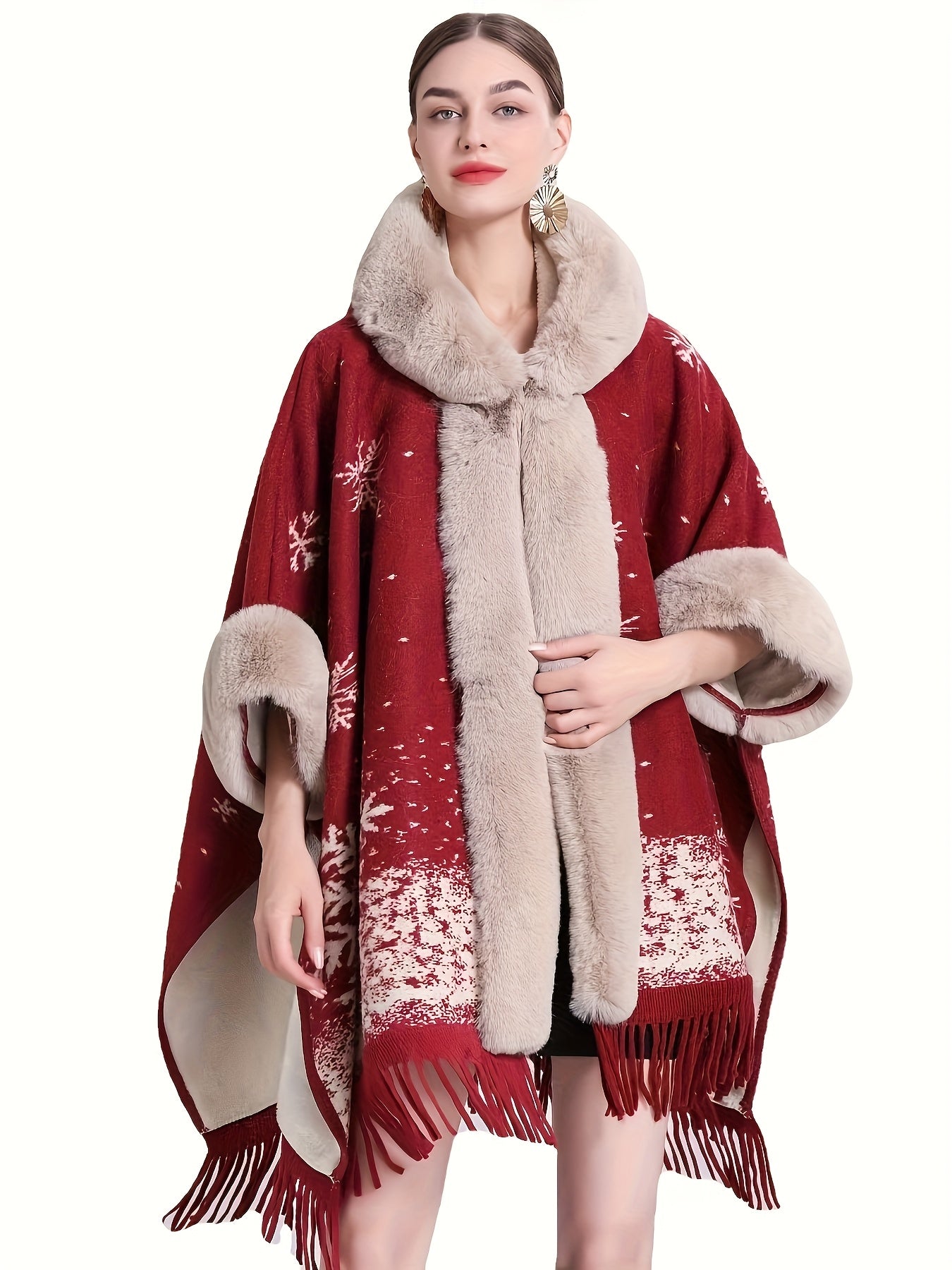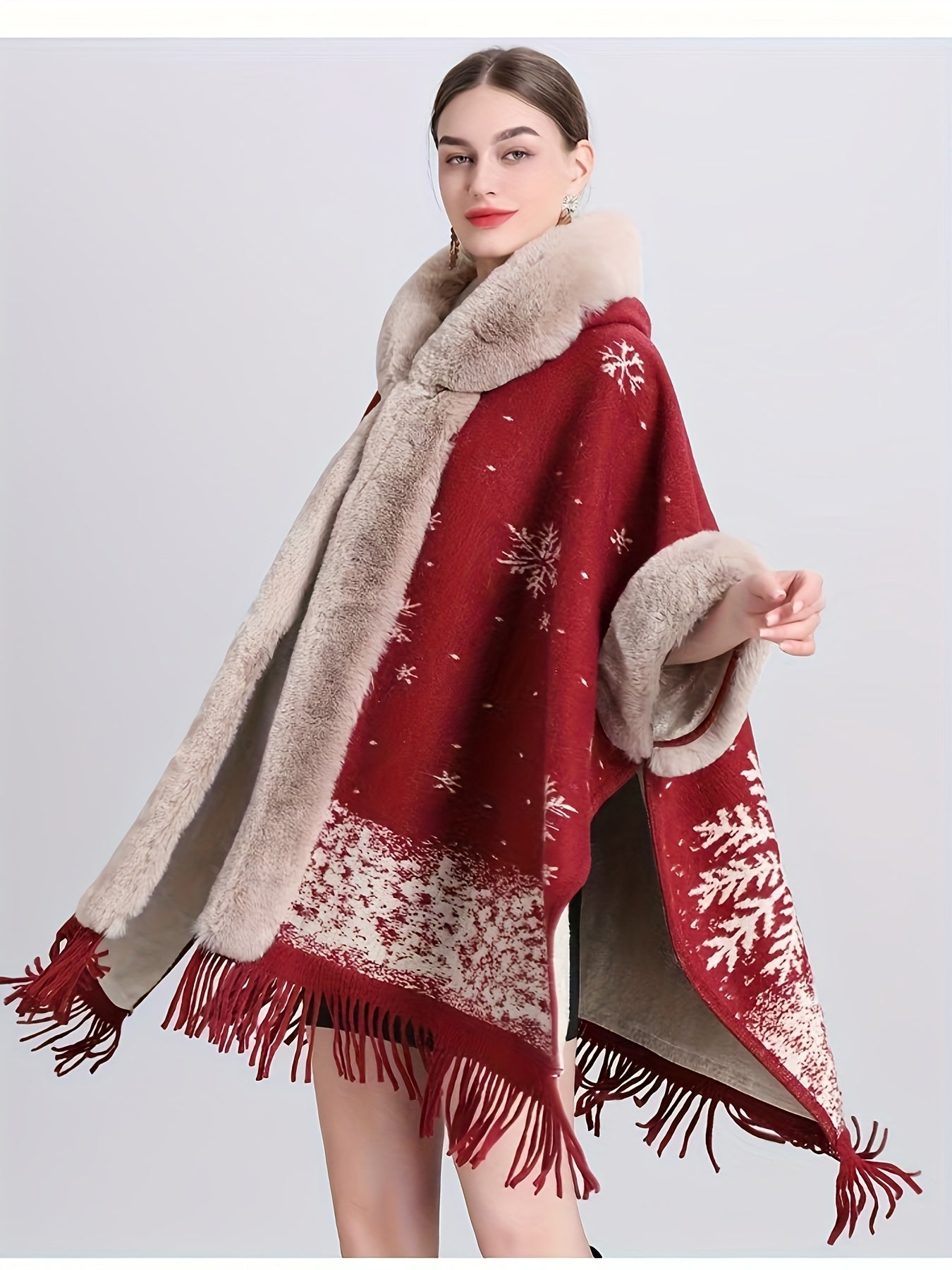 Մեծ չափսի կանացի էլեգանտ կարմիր և բեժ Սուրբ Ծննդյան թիկնոց - գլխարկով ձմեռային թիկնոց, ոչ ձգվող գործվածքով, տոնական երեկույթների, Նոր տարվա գիշերվա, ամենօրյա ձմեռային հանդերձանքների համար - էլեգանտ հատուկ գիծ, սեզոնային նորաձևություն, ոճային եռանկյունաձև