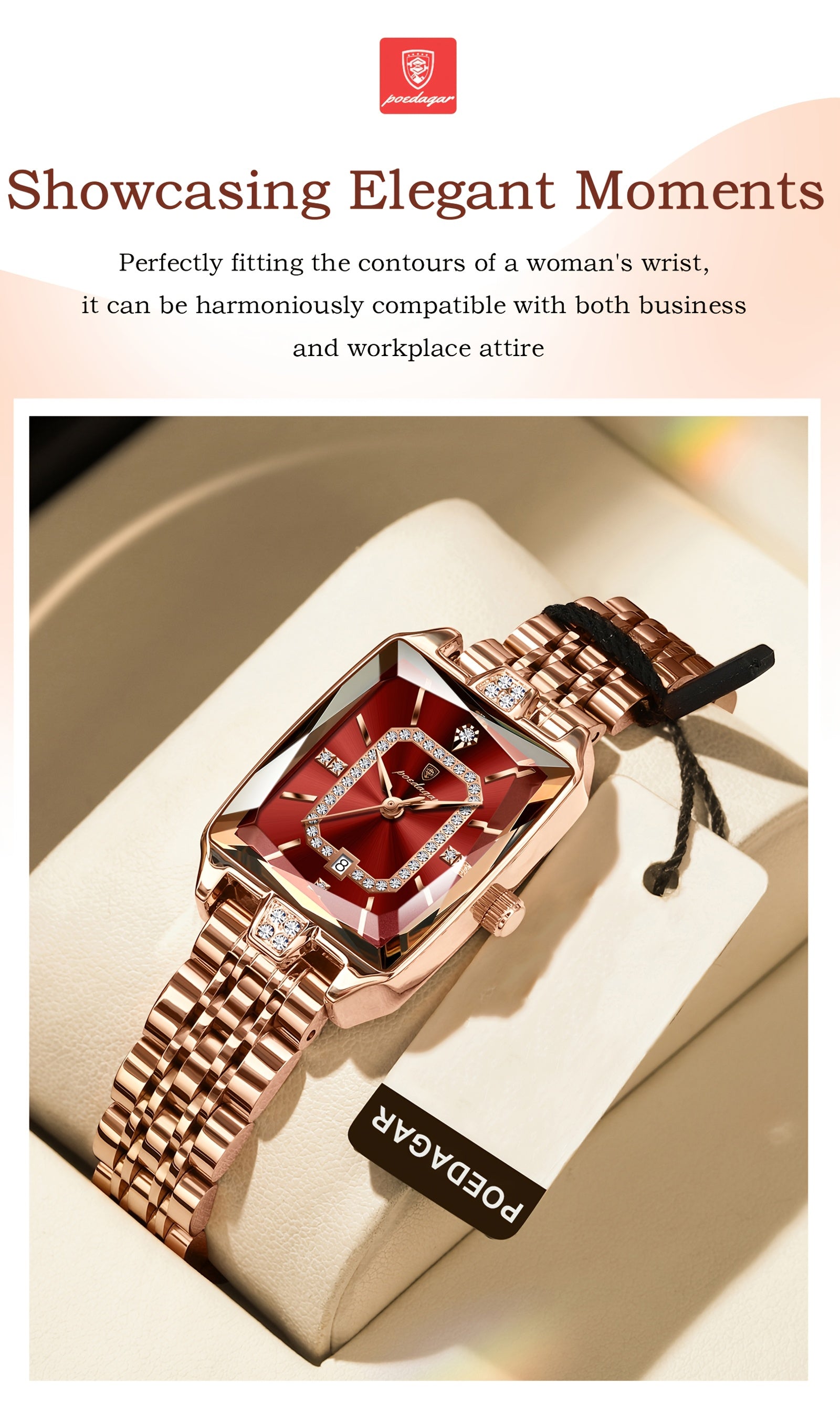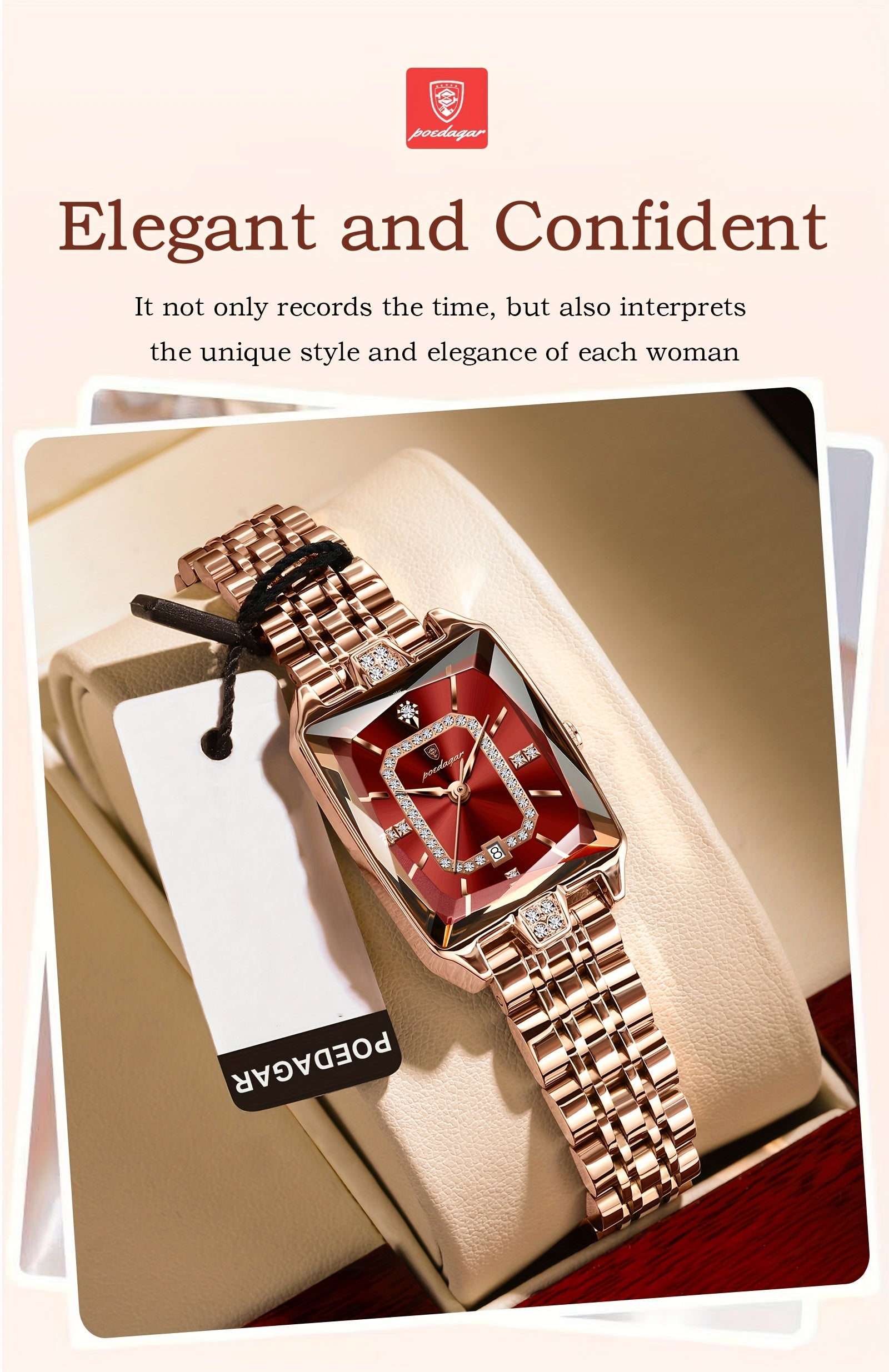 POEDAGAR էլեգանտ կանացի քվարցային ժամացույց՝ վարդագույն ոսկեգույն չժանգոտվող պողպատից, (3ATM), քառակուսի ցուցատախտակ՝ թանկարժեք քարերի զարդարանքներով, ամսաթվի ցուցիչ, շքեղ նորաձև աքսեսուար՝ ամենօրյա կամ պաշտոնական առիթների համար