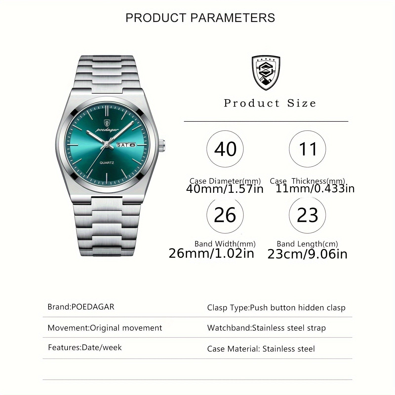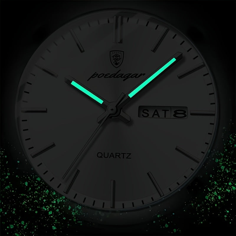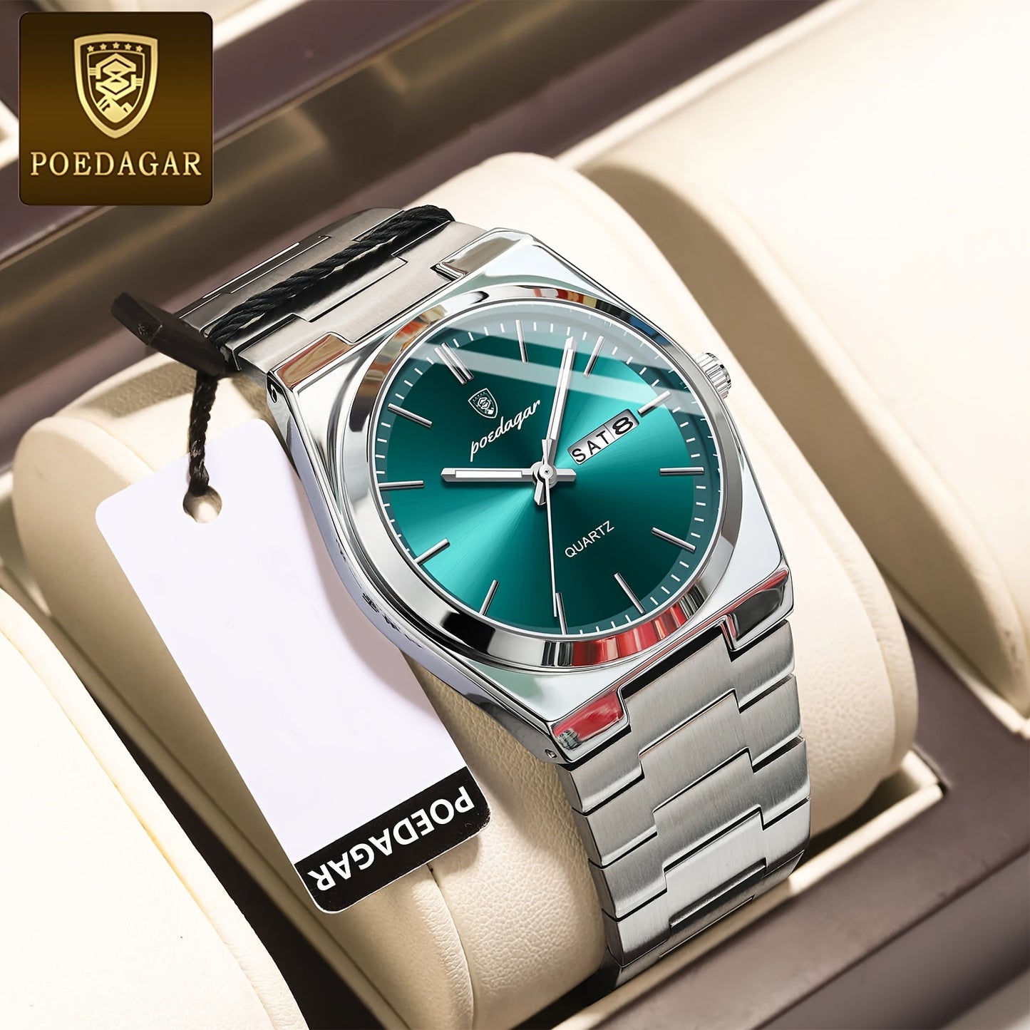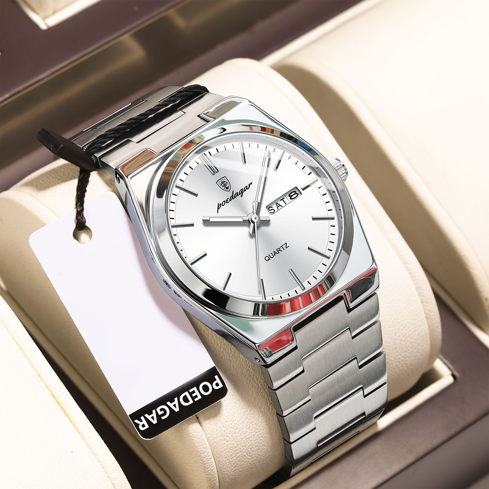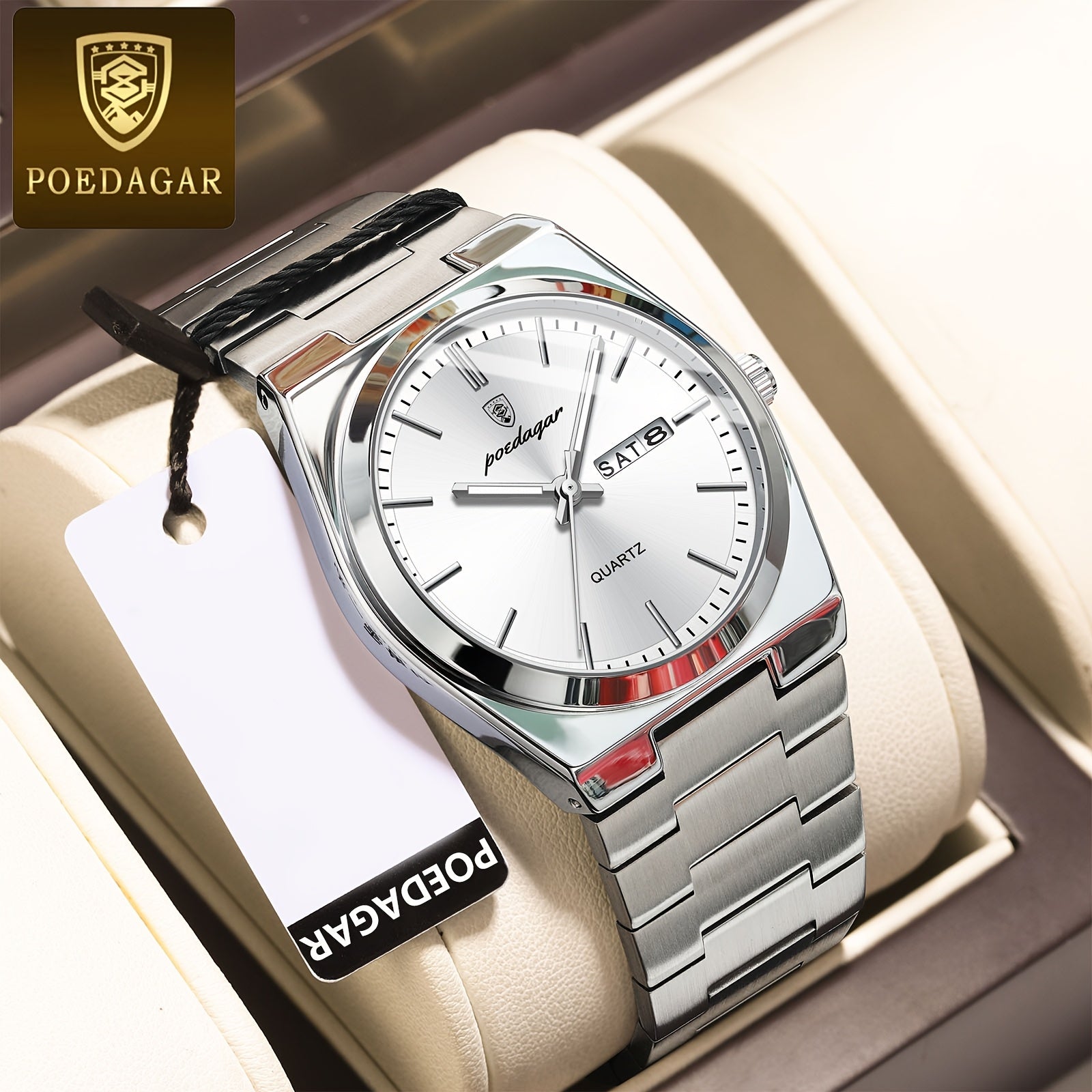 POEDAGAR շքեղ քվարցային տղամարդու ձեռքի ժամացույց՝ լուսավորվող ամսաթվի և շաբաթվա ցուցադրմամբ, չժանգոտվող պողպատե ժապավեն, ջրակայուն (IPX8), իդեալական նվեր բիզնես մասնագետների համար