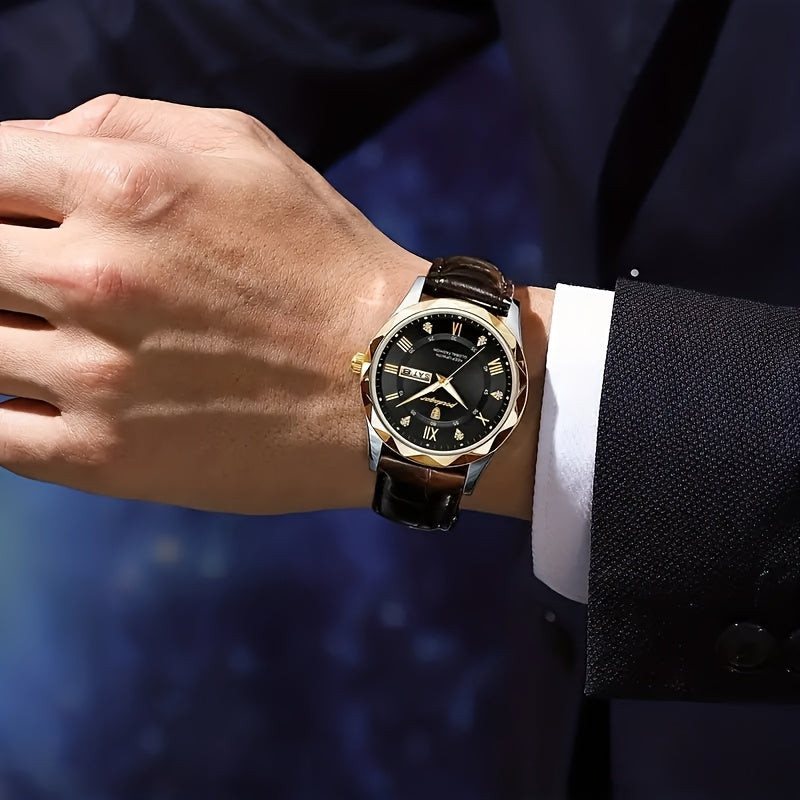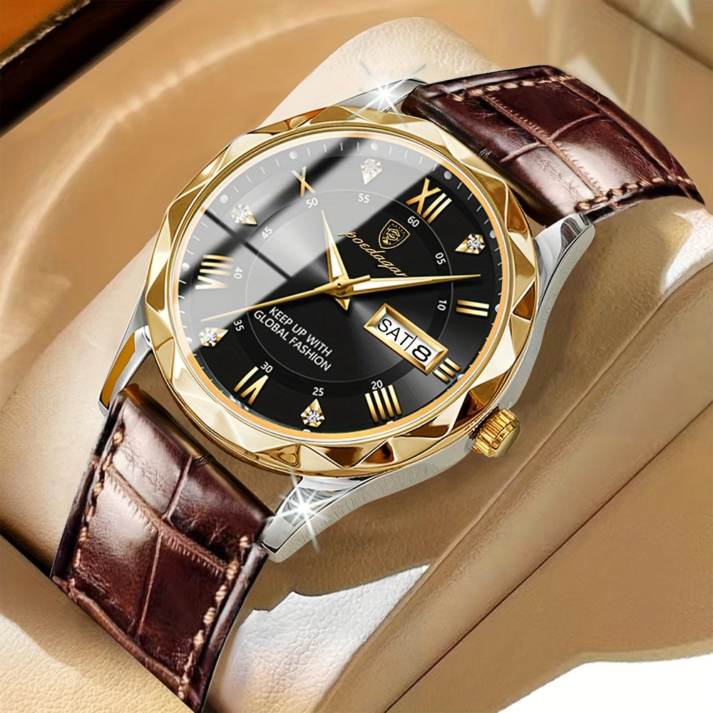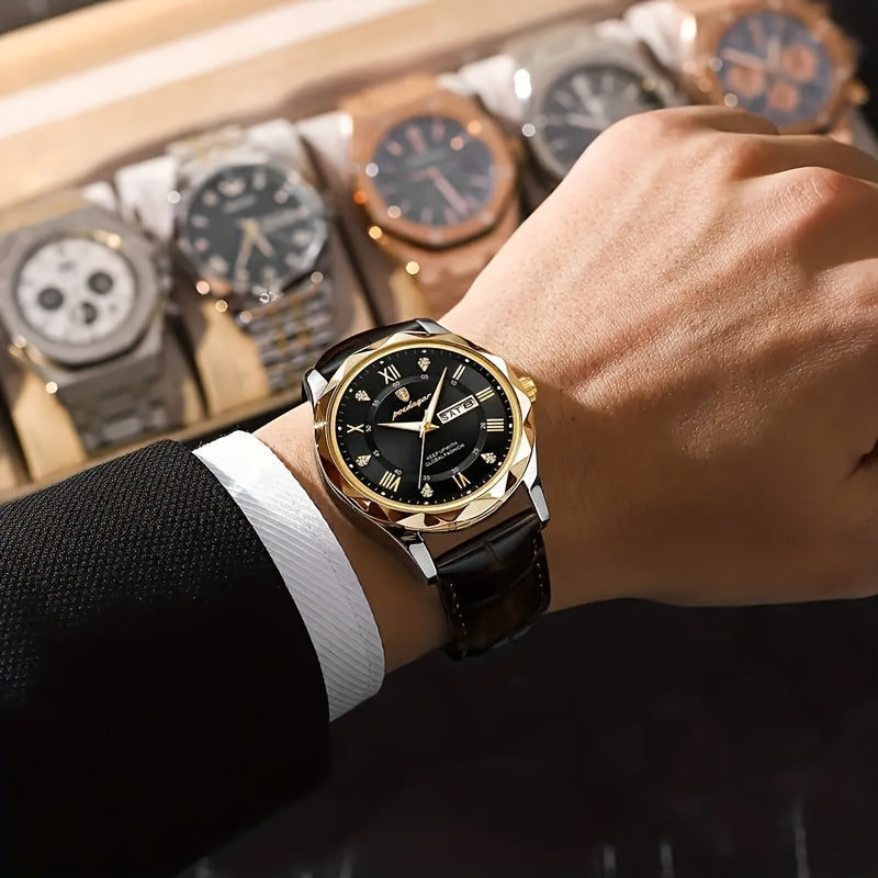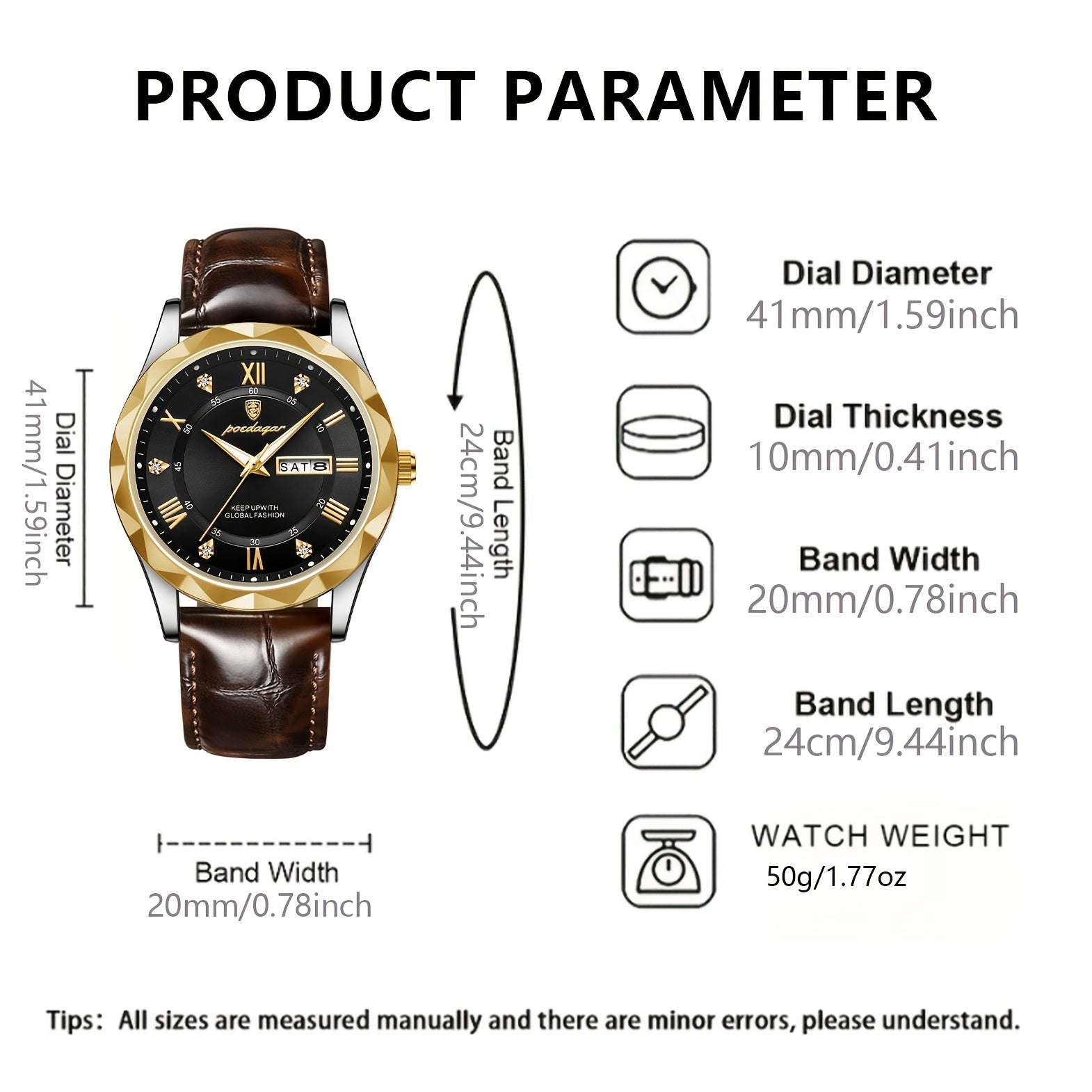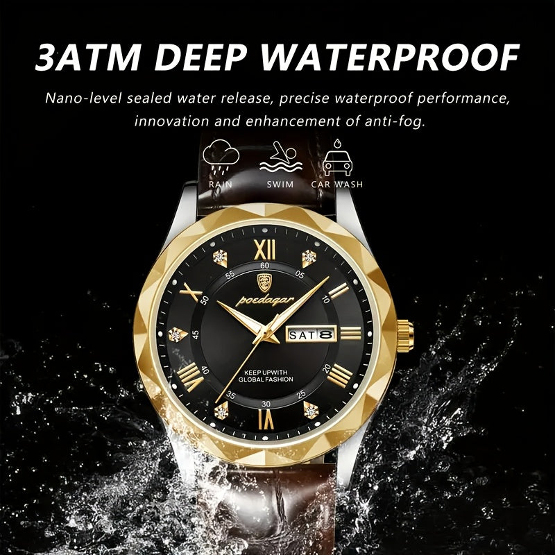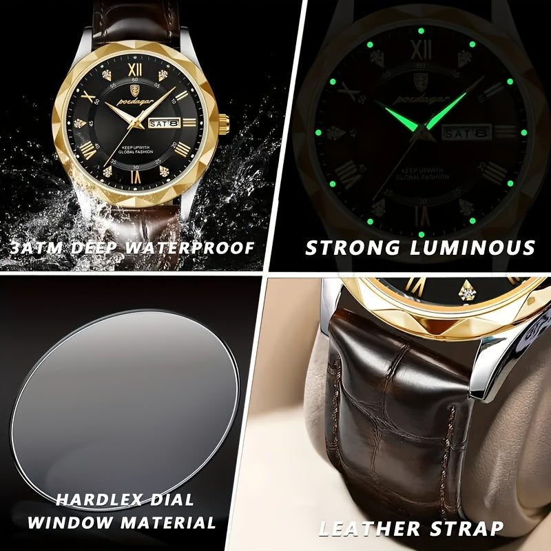 POEDAGAR տղամարդու նորաձև քվարցային ժամացույց, ջրակայուն 3ATM, կլոր համաձուլվածքից պատյան, լուսավոր սլաքներ, օրացույցի գործառույթ, մարտկոցով և էլեկտրոնային փոխանցմամբ, արհեստական կաշվից ժապավեն