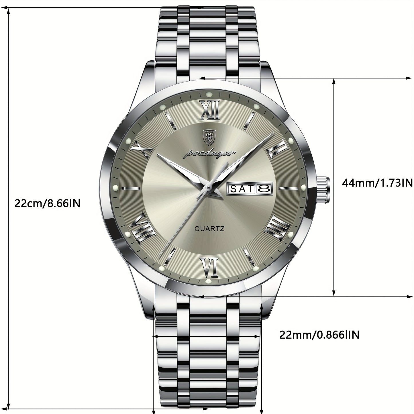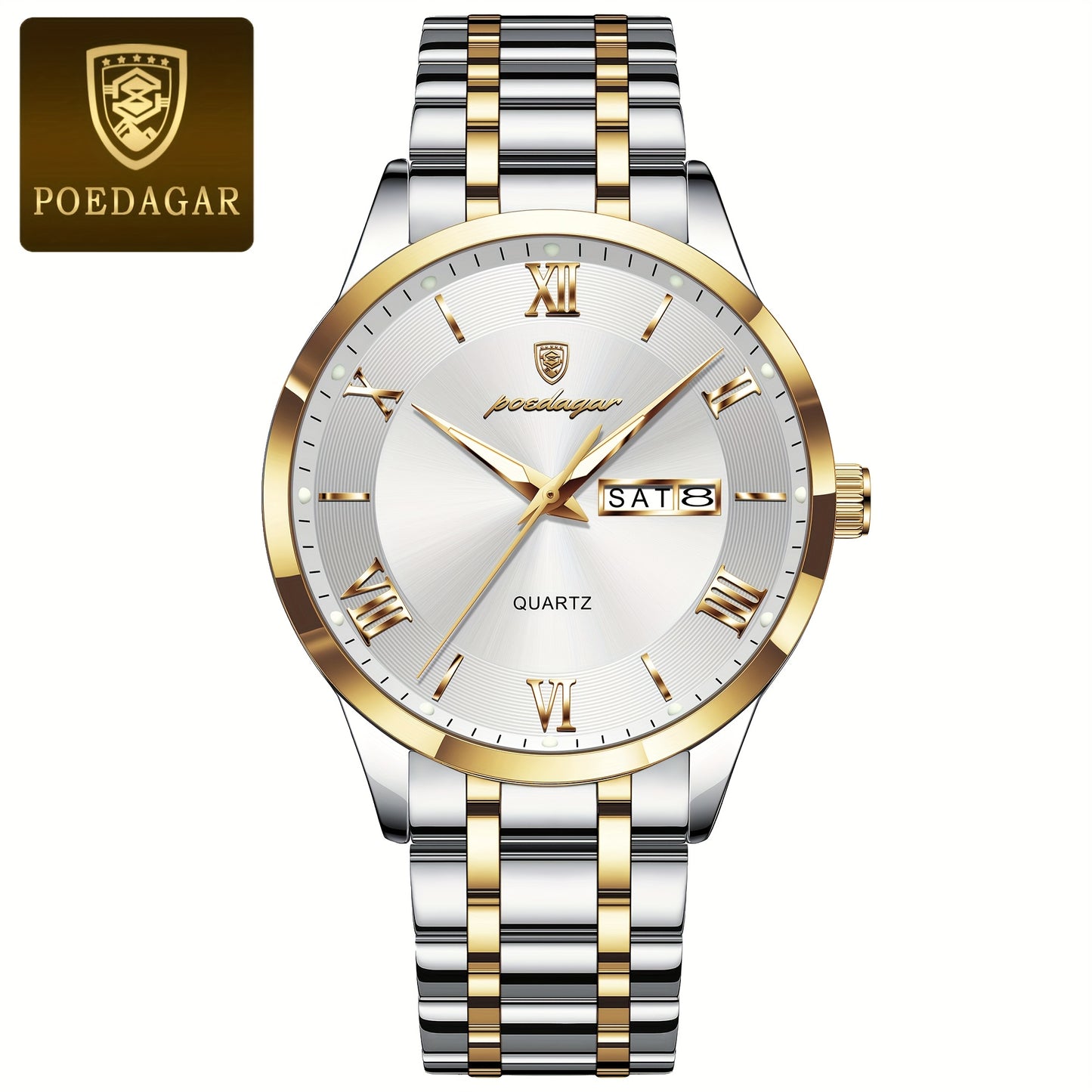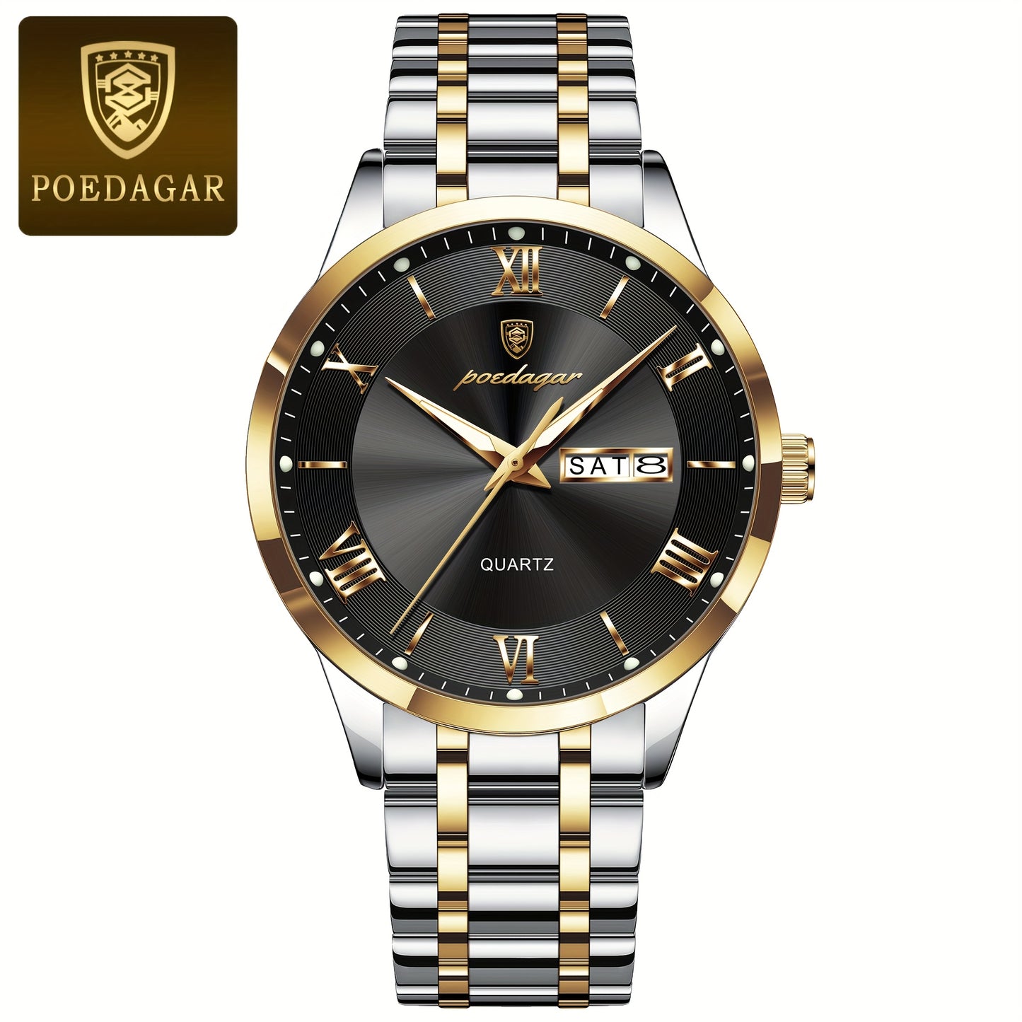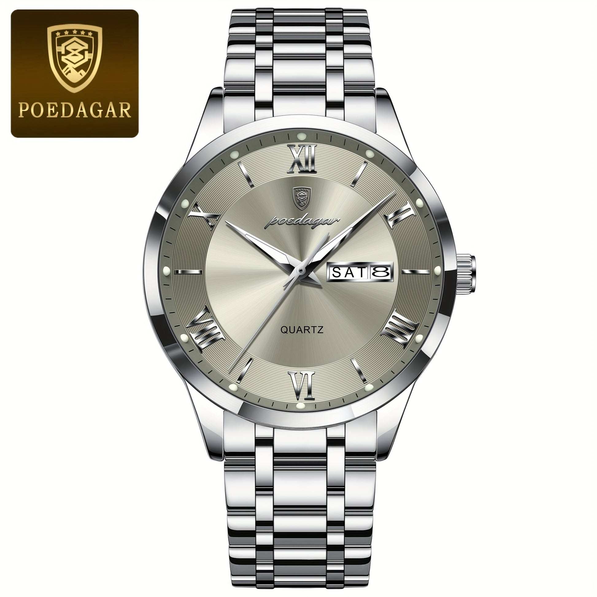 POEDAGAR Men'S Quartz Watch, Sports Style, Waterproof 3ATM, Luminous Calendar, Stainless Steel Strap, Pointer Display, Alloy Case, Electronic Drive, Non-Rechargeable Button Battery, with Spring Festival and Football Holiday T