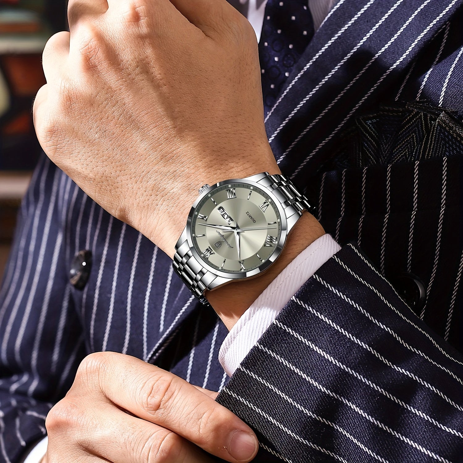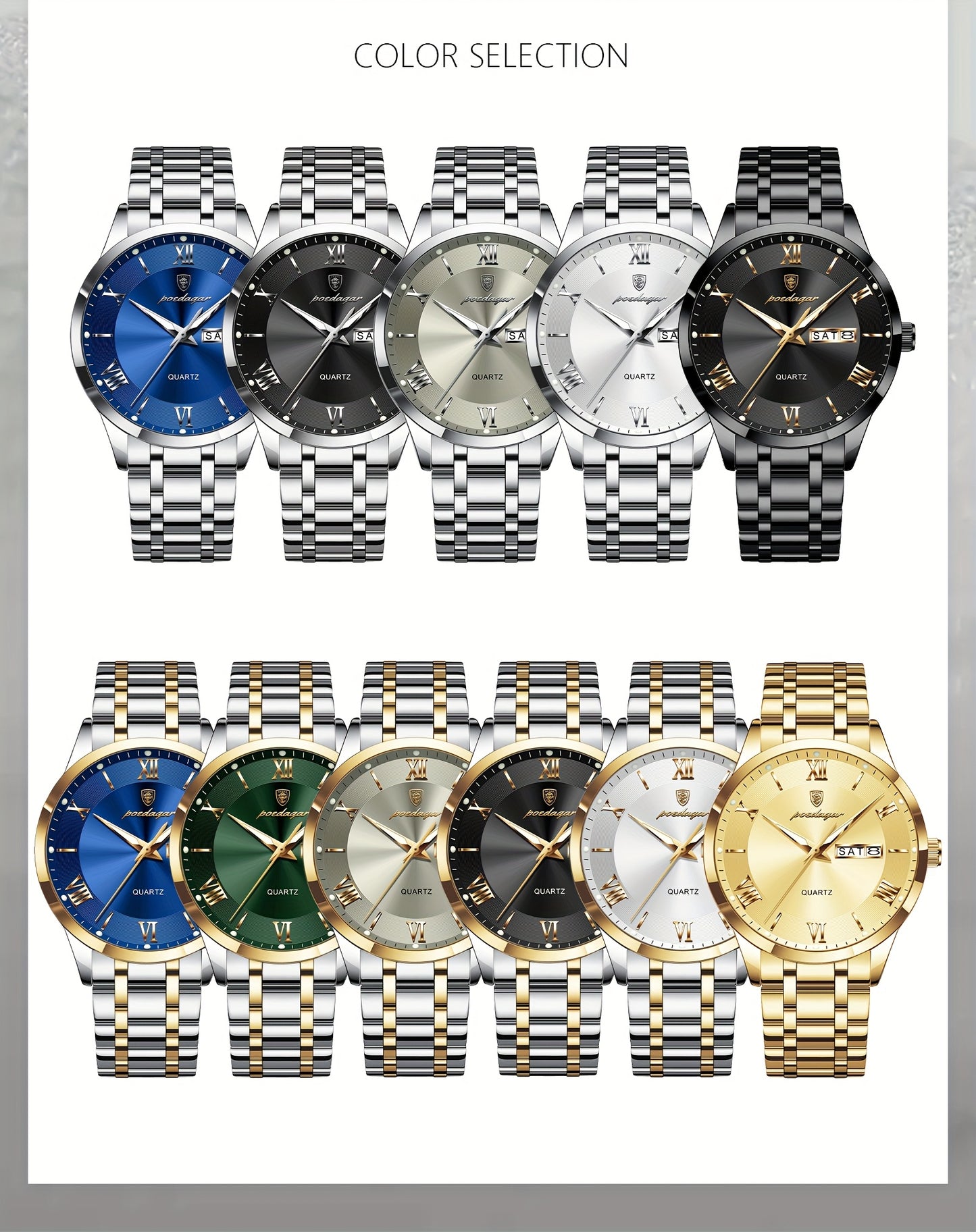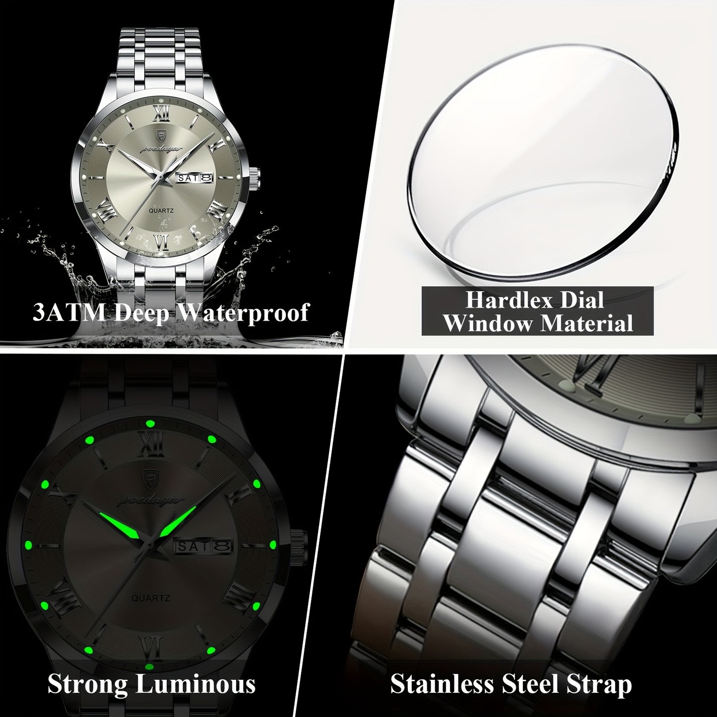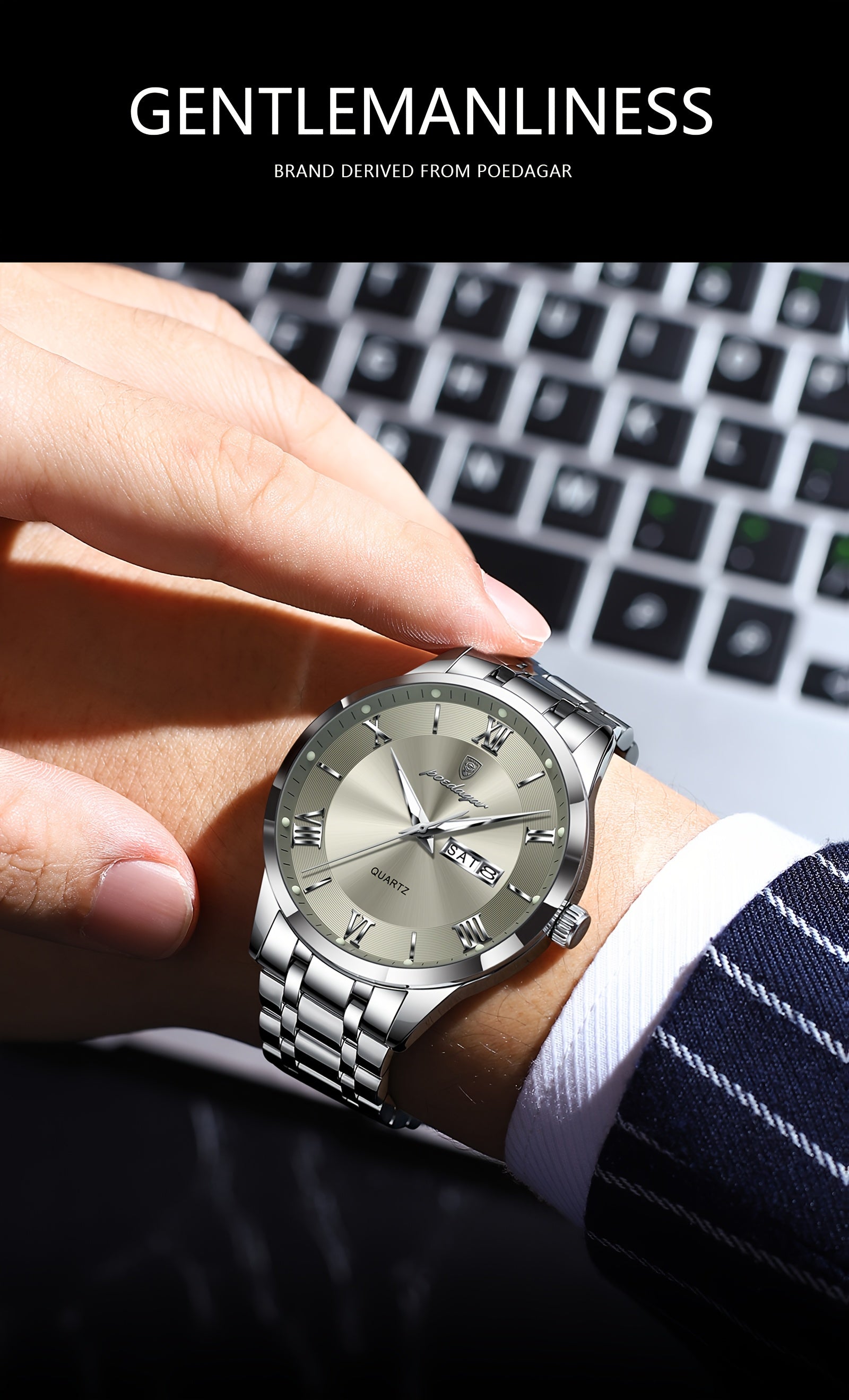 POEDAGAR Men'S Quartz Watch, Sports Style, Waterproof 3ATM, Luminous Calendar, Stainless Steel Strap, Pointer Display, Alloy Case, Electronic Drive, Non-Rechargeable Button Battery, with Spring Festival and Football Holiday T