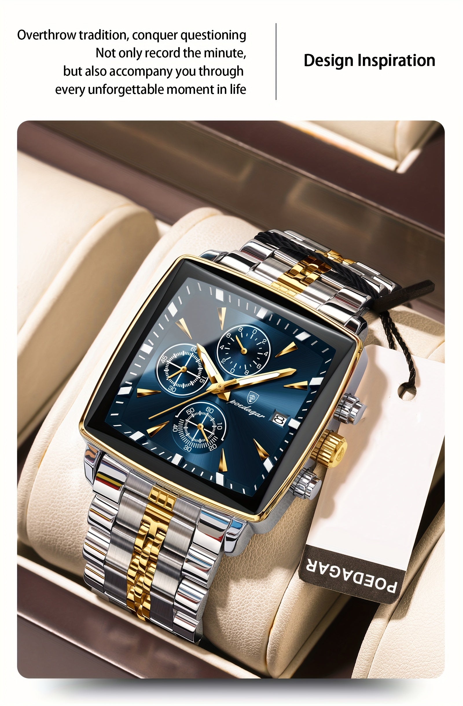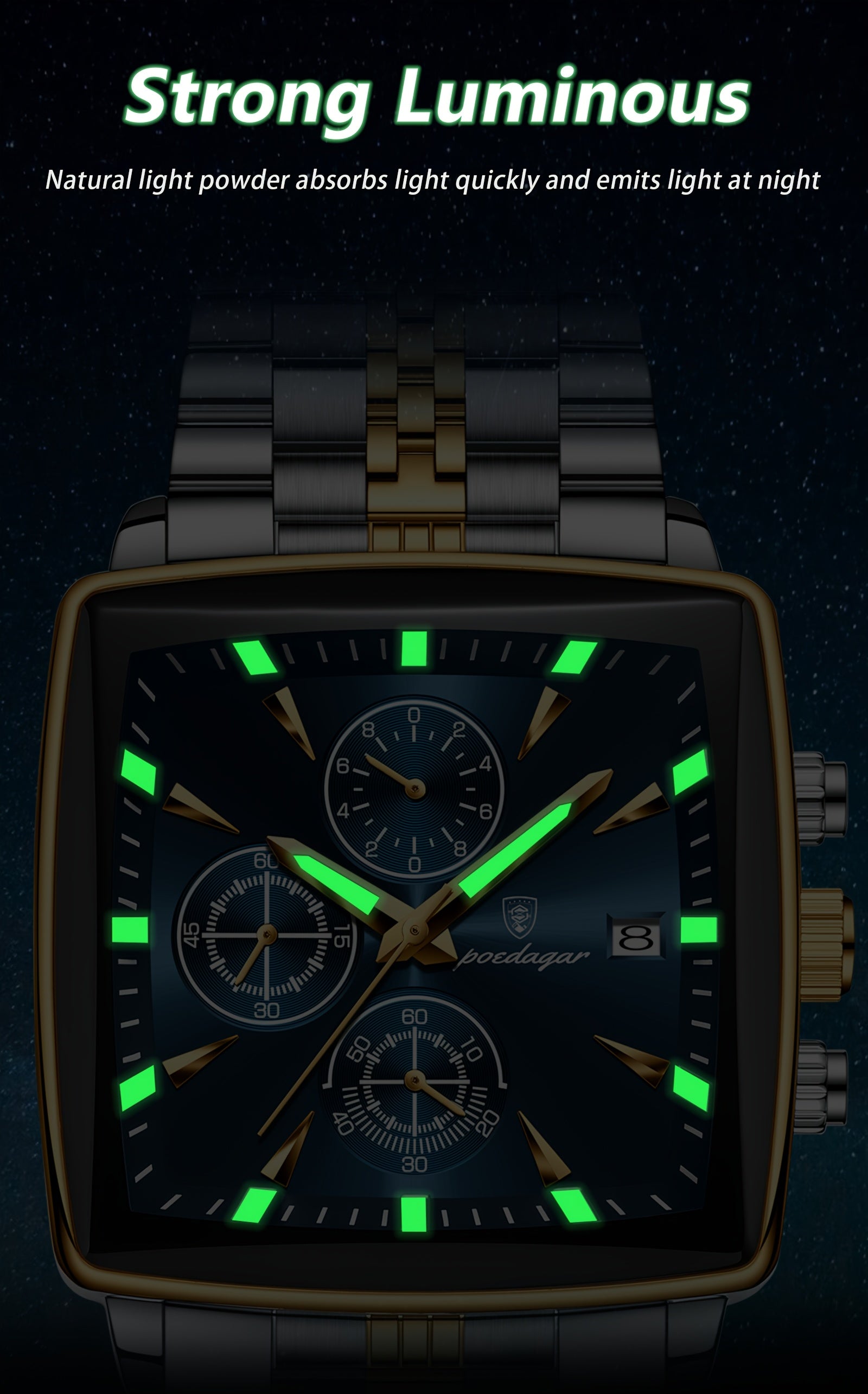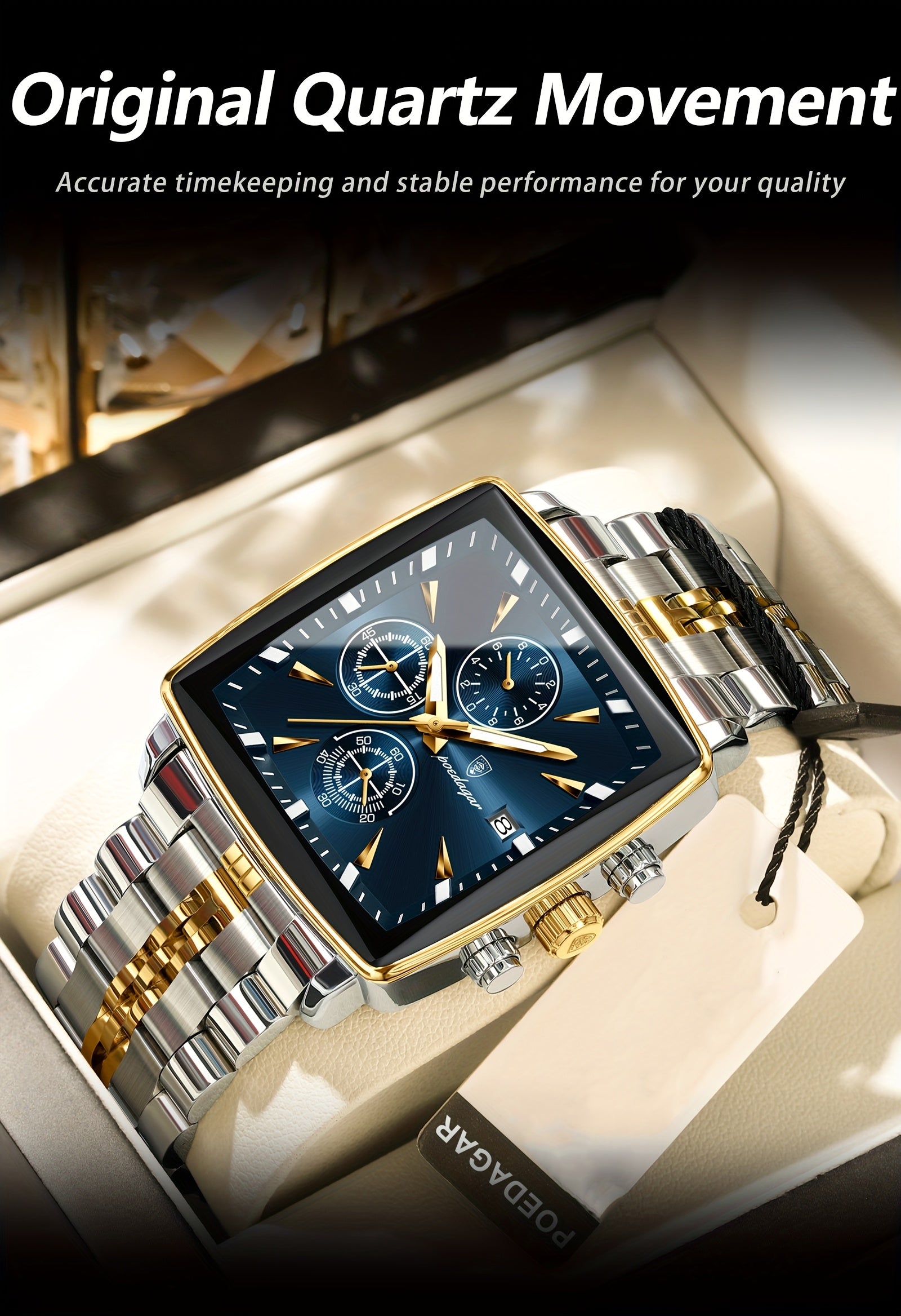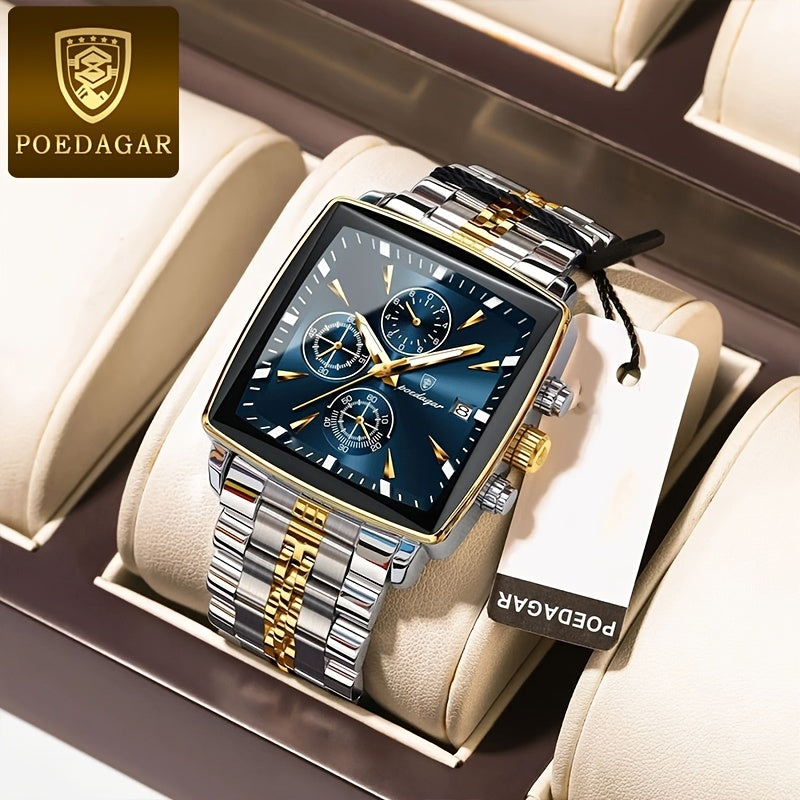 POEDAGAR Men's Stainless Steel Luminous Watch - Blue Dial Chronograph, High Quality Quartz Movement with Date Calendar, Golden-Tone Accents for Business Casual & Casual Attire, Formal Accessory, Stylish Accessory, Refined Cra