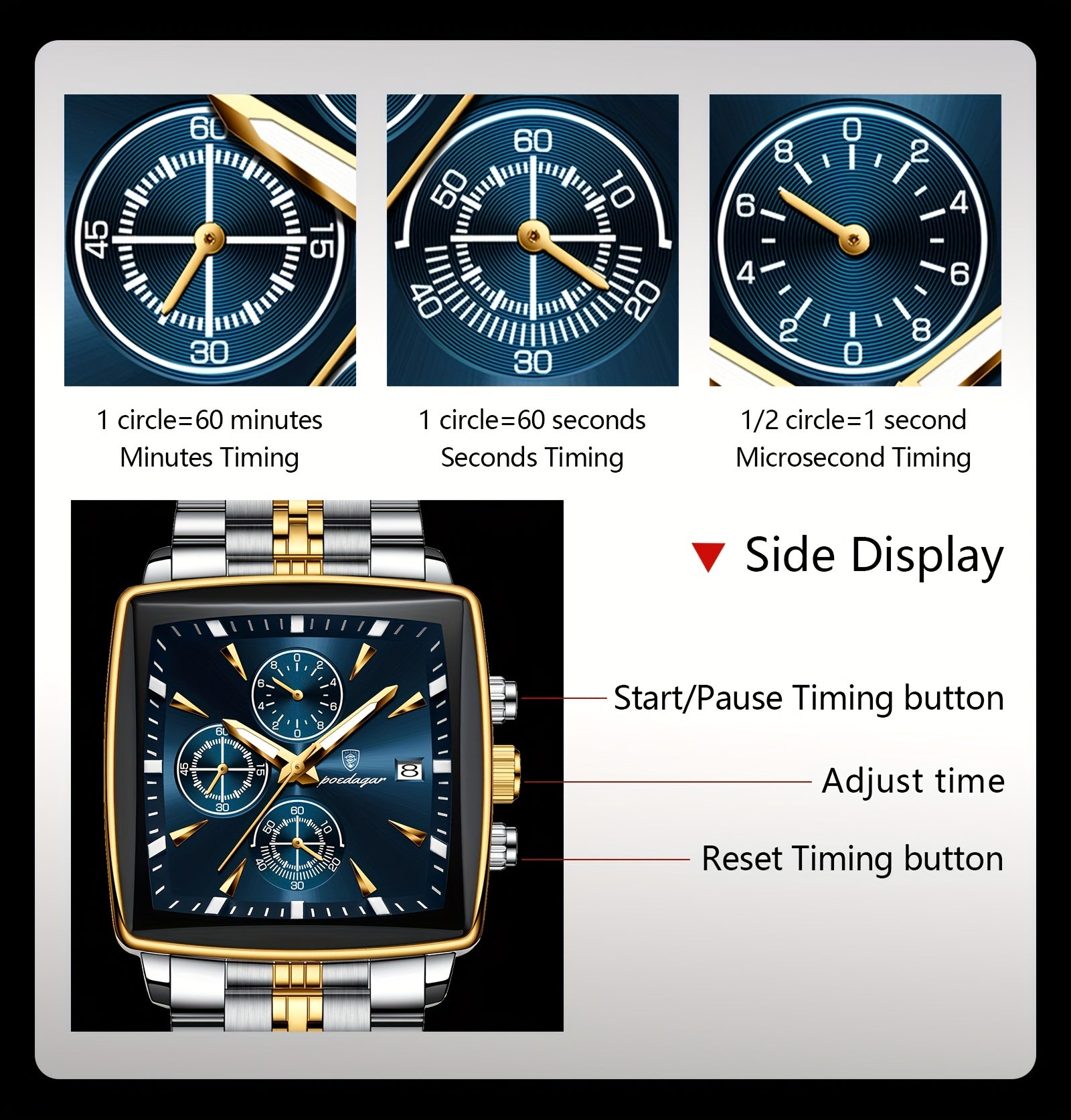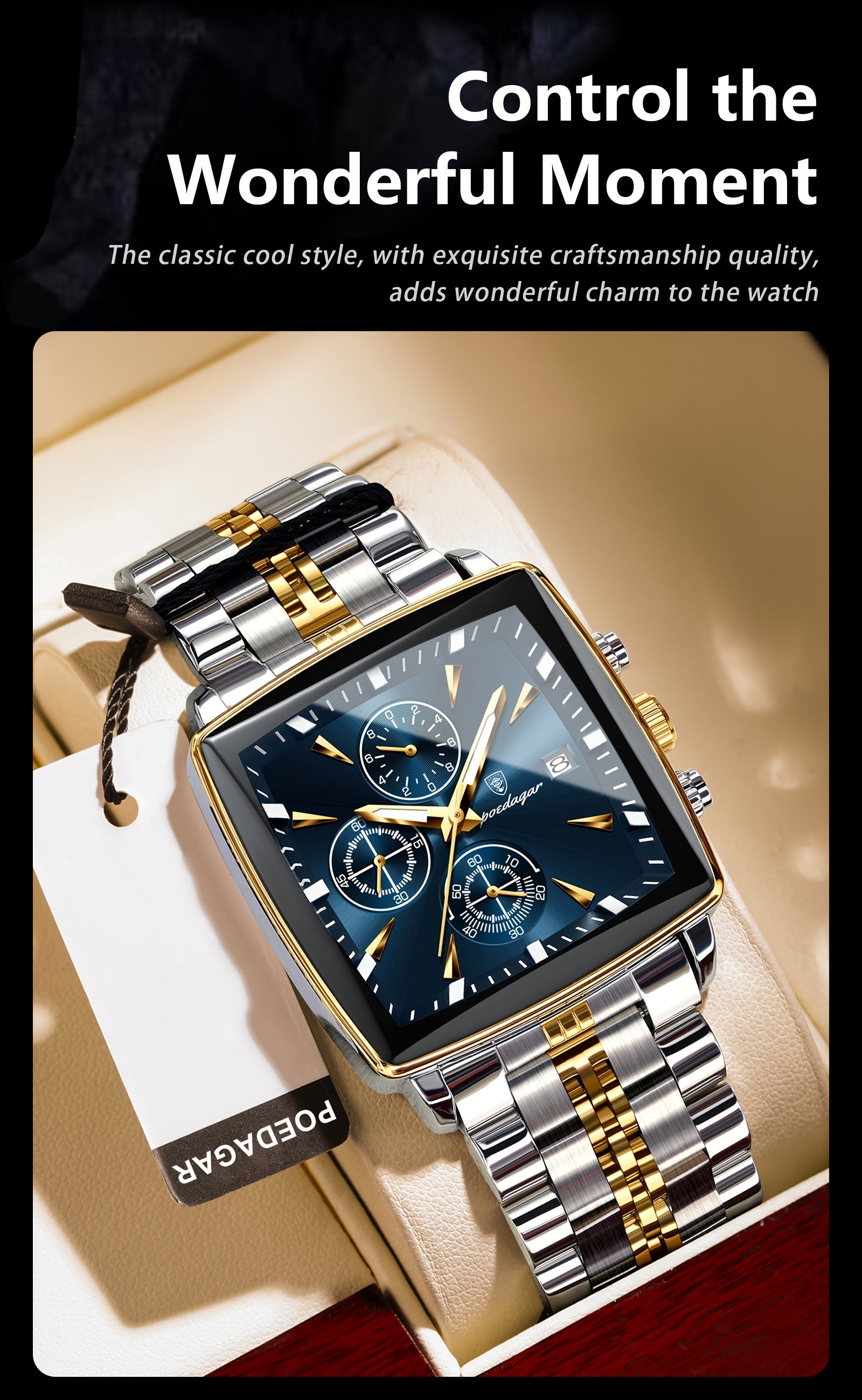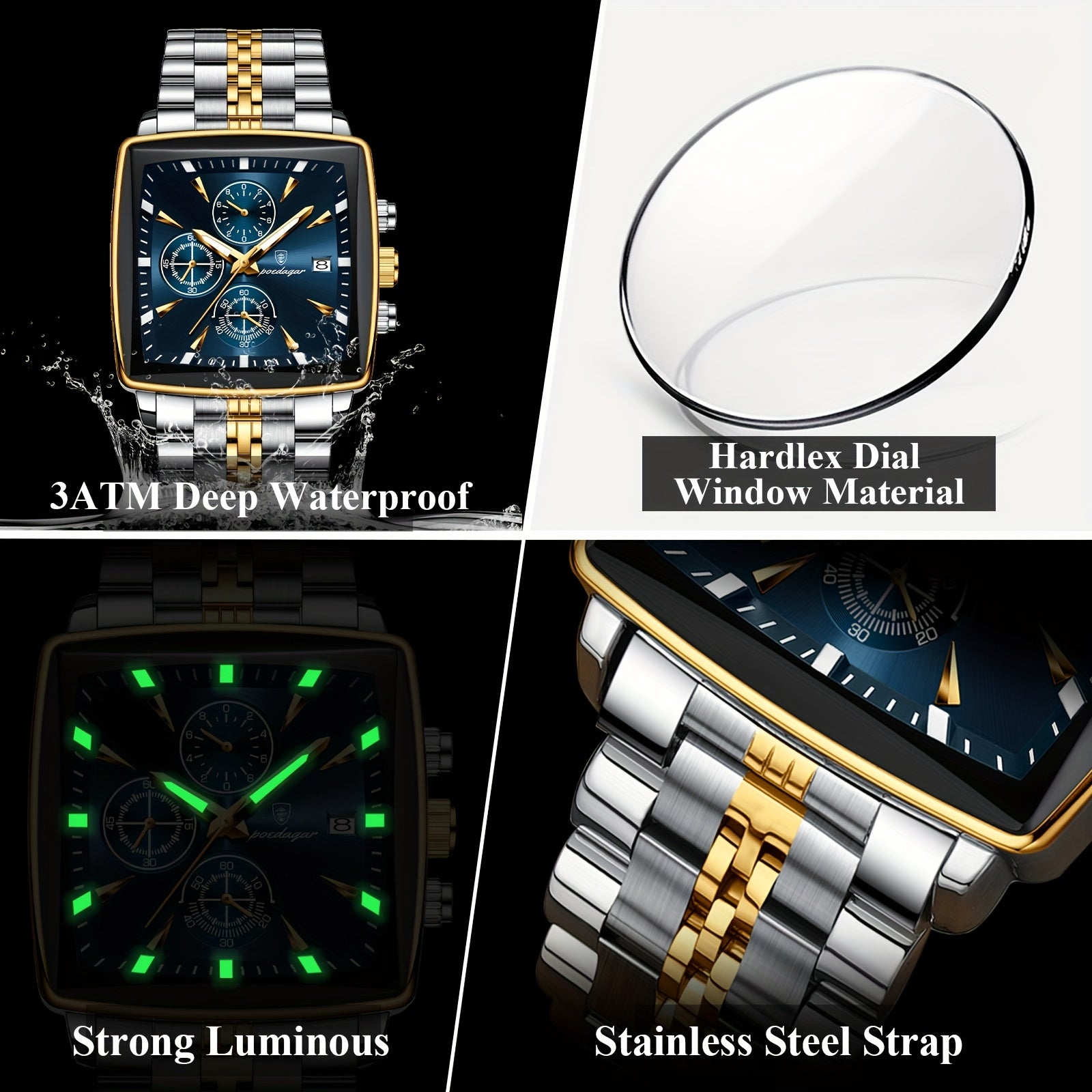 POEDAGAR Men's Stainless Steel Luminous Watch - Blue Dial Chronograph, High Quality Quartz Movement with Date Calendar, Golden-Tone Accents for Business Casual & Casual Attire, Formal Accessory, Stylish Accessory, Refined Cra
