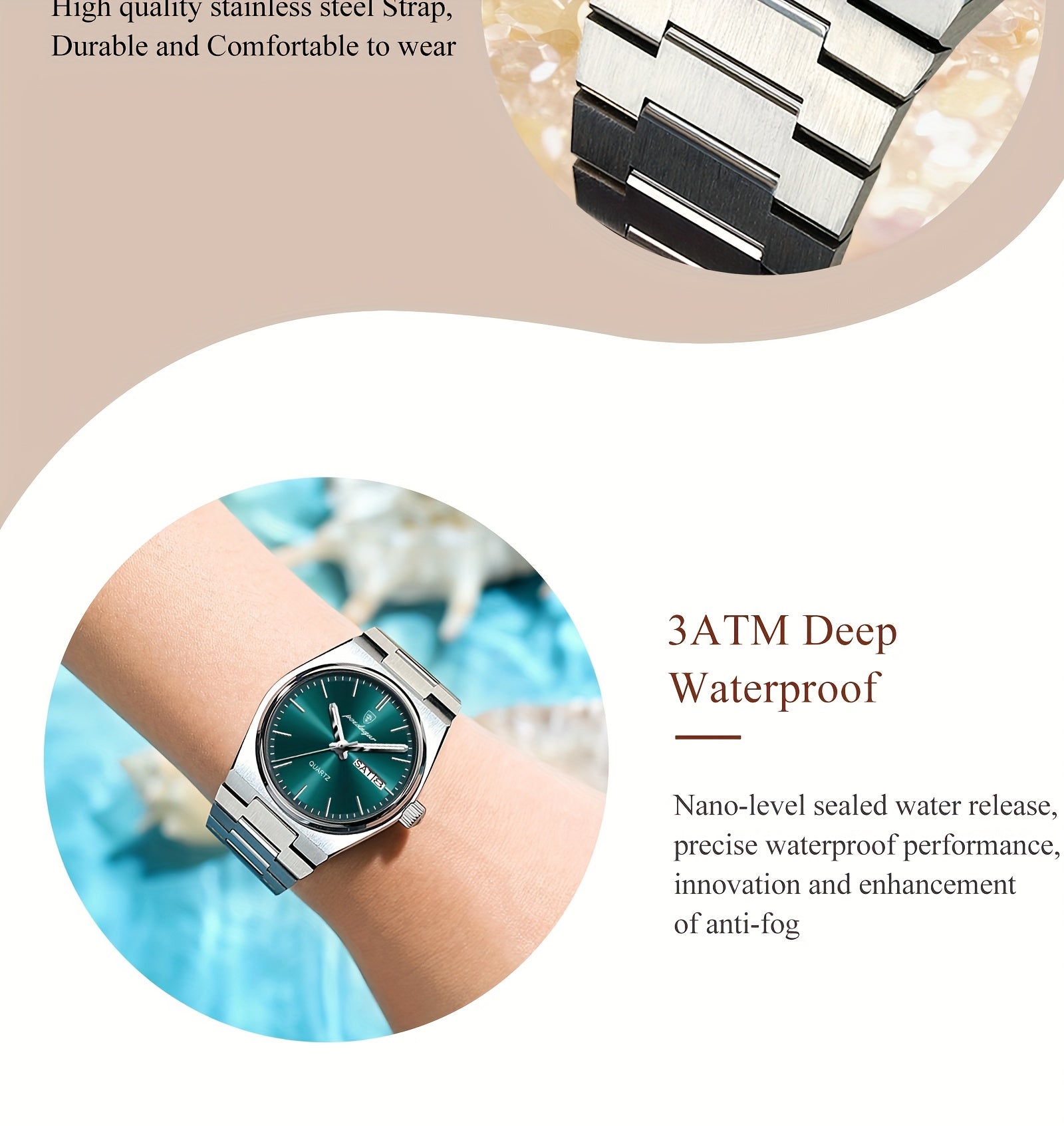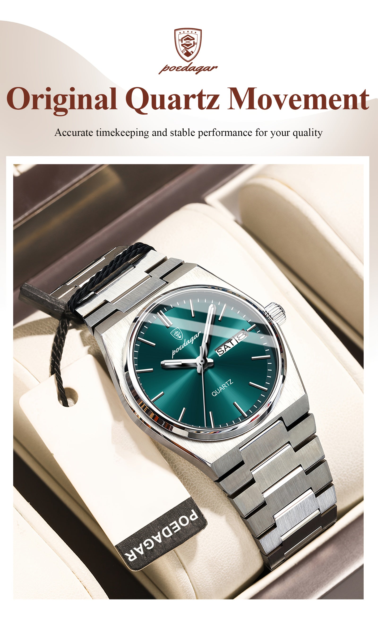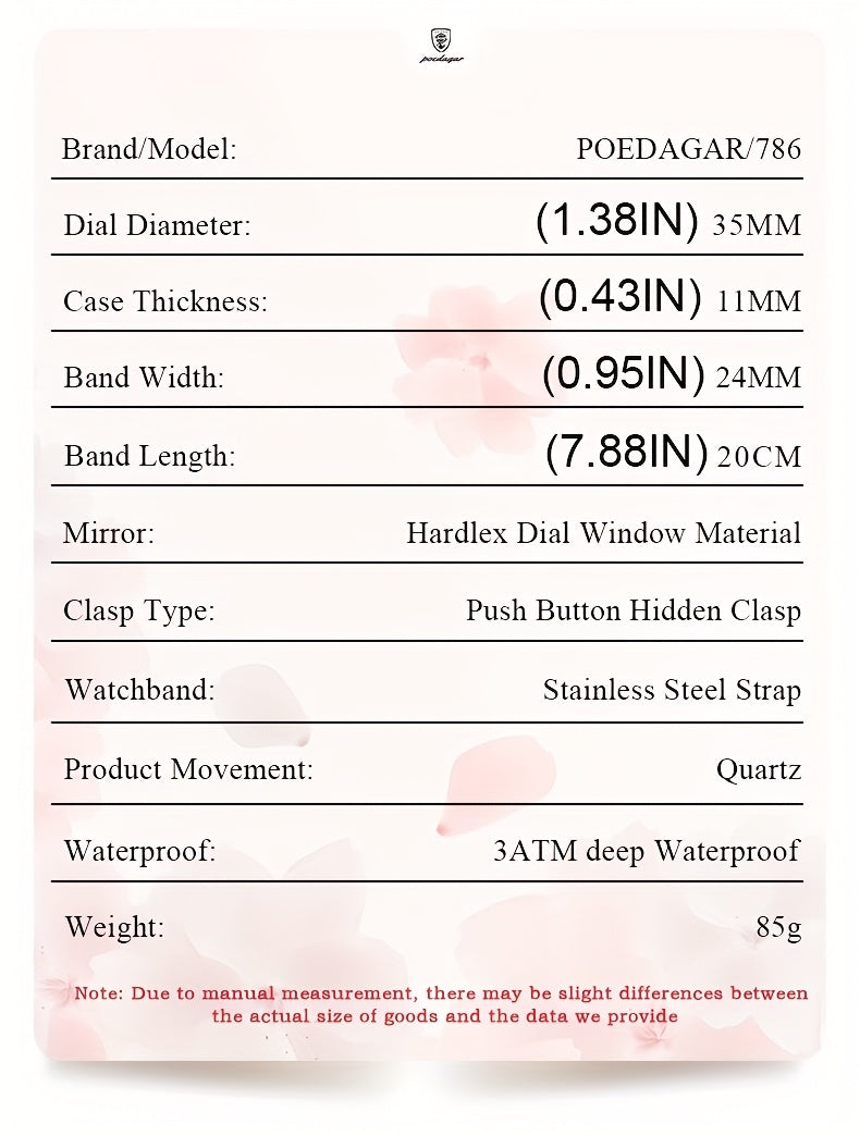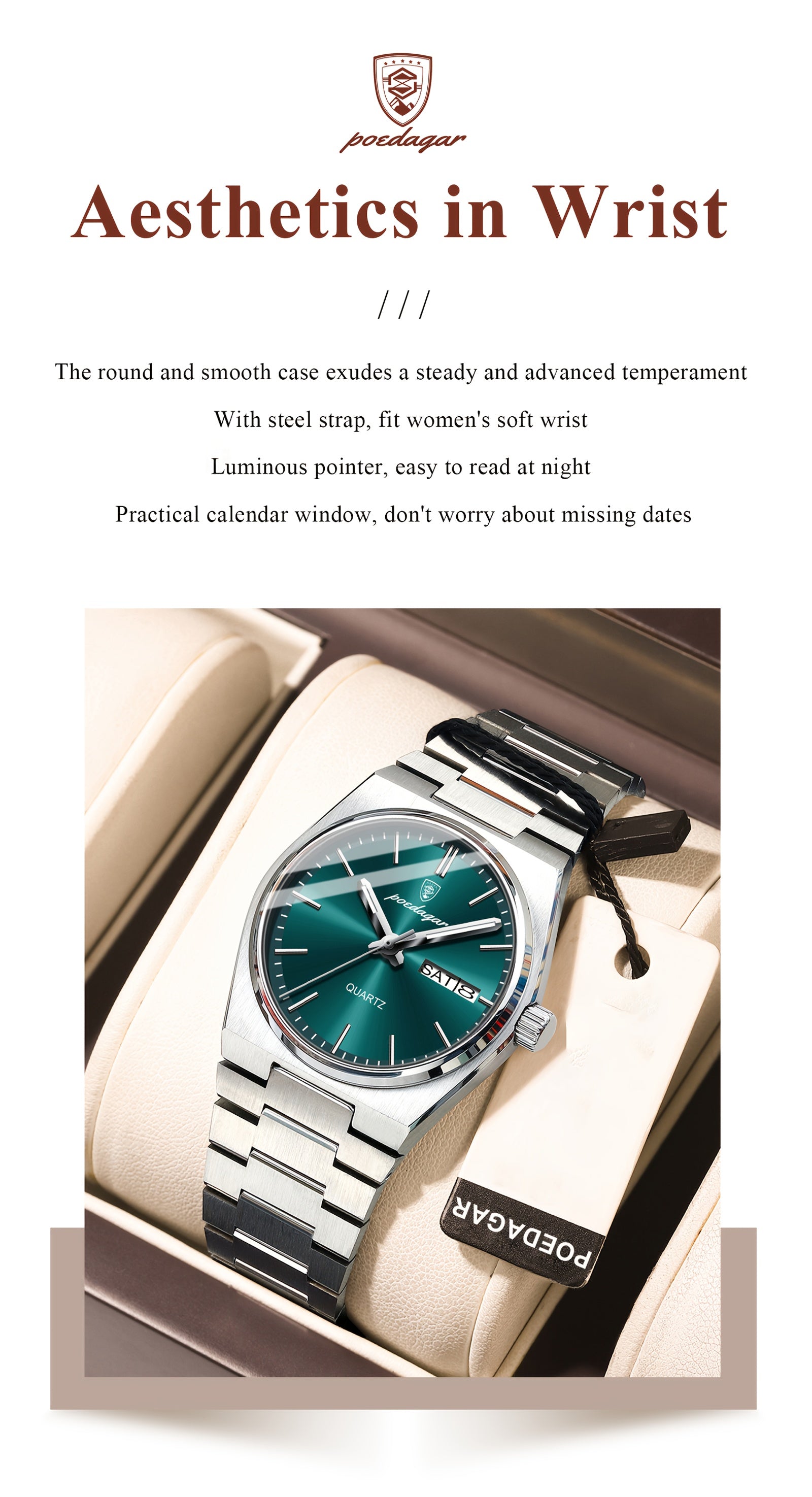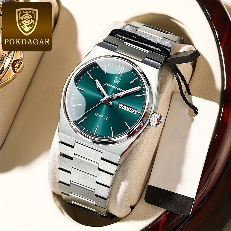 POEDAGAR Women's Elegant Green Luminous Calendar Watch - Waterproof Stainless Steel Ultra-Thin Quartz Wristwatch with Minimalist Design for Casual & Formal Wear, Casual Attire, Korean Fashion, Sleek Metallic Strap