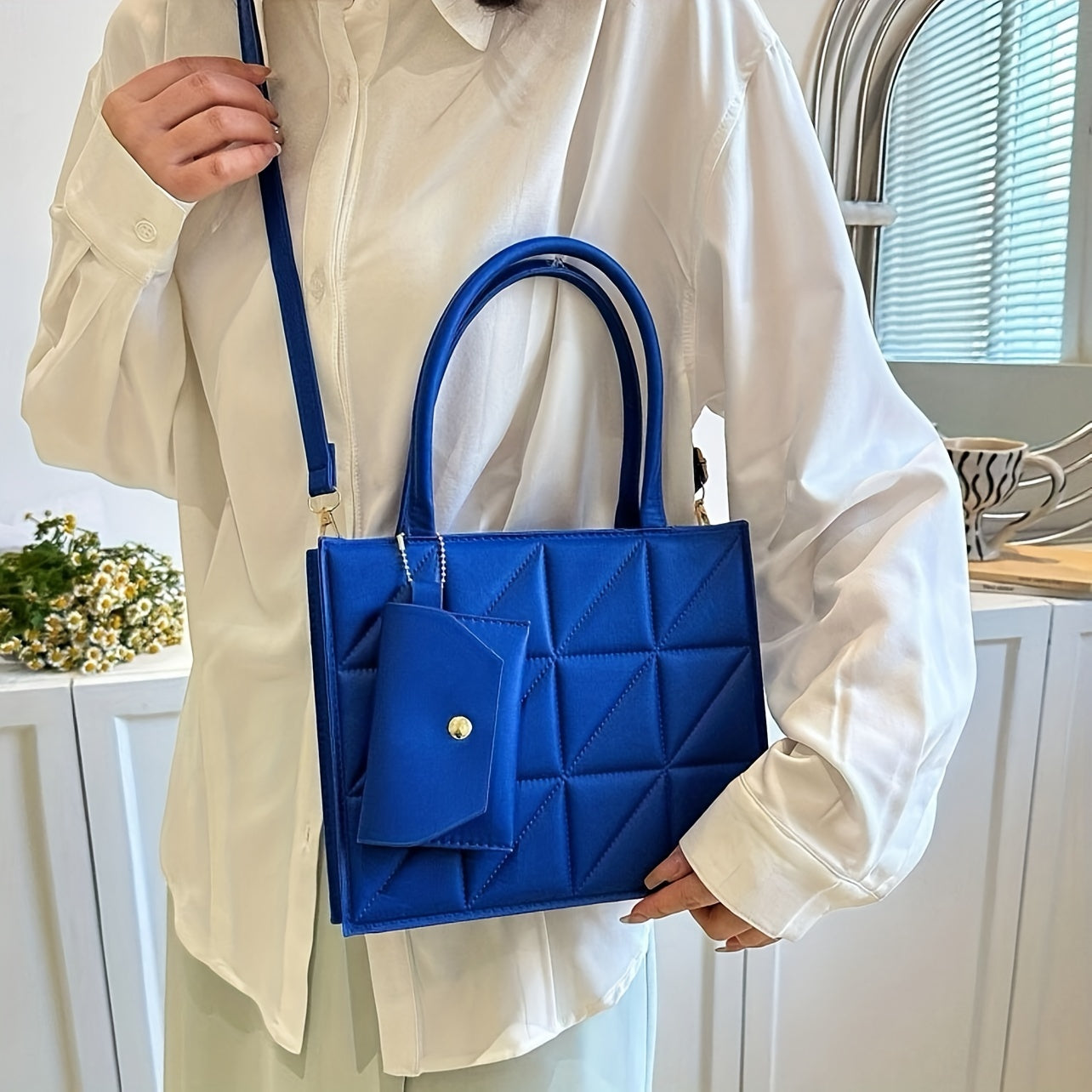 Quilted Square Crossbody Bag for Women - Synthetic Leather Work Bag with Detachable Coin Purse, Geometric Quilted Design, Adjustable Strap & Golden-Tone Hardware, Black Office Commute Bag for College Students & Professionals,