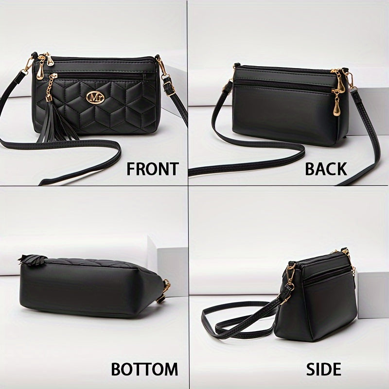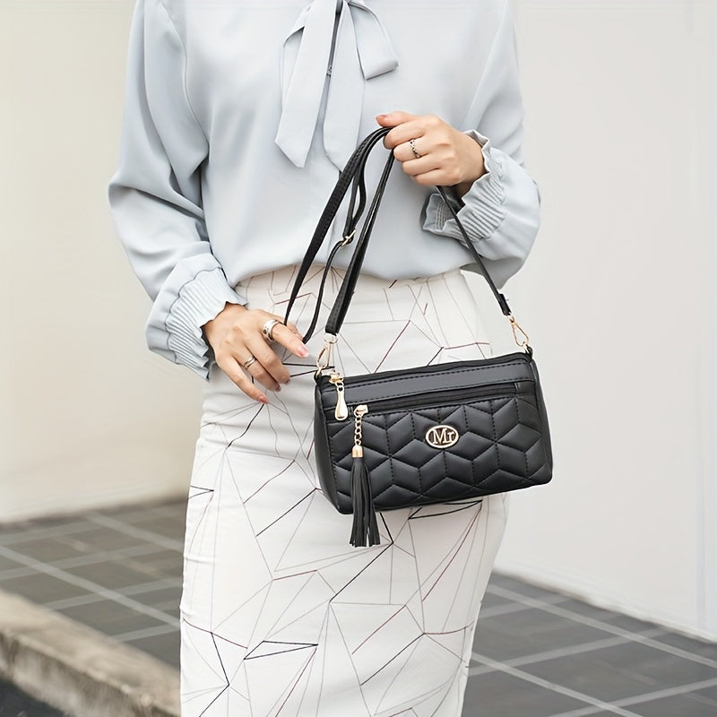 Կանացի կարված, մեծ տարողությամբ, ամենօրյա ուսի պայուսակ՝ ծոպավոր զարդարանքներով, բազմաթիվ կայծակաճարմանդներով և կարգավորվող ուսի գոտիով
