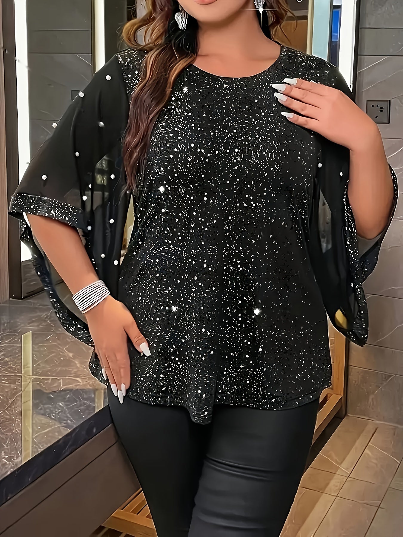 Շողշողացող հմայքը, էլեգանտ Plus Size կանացի վերնաշապիկ՝ փայլուն սեկվիններով և արհեստական մարգարիտներով՝ ասիմետրիկ թևերով, կլոր վզով, ձգվող գործվածք՝ գարուն/ամառ