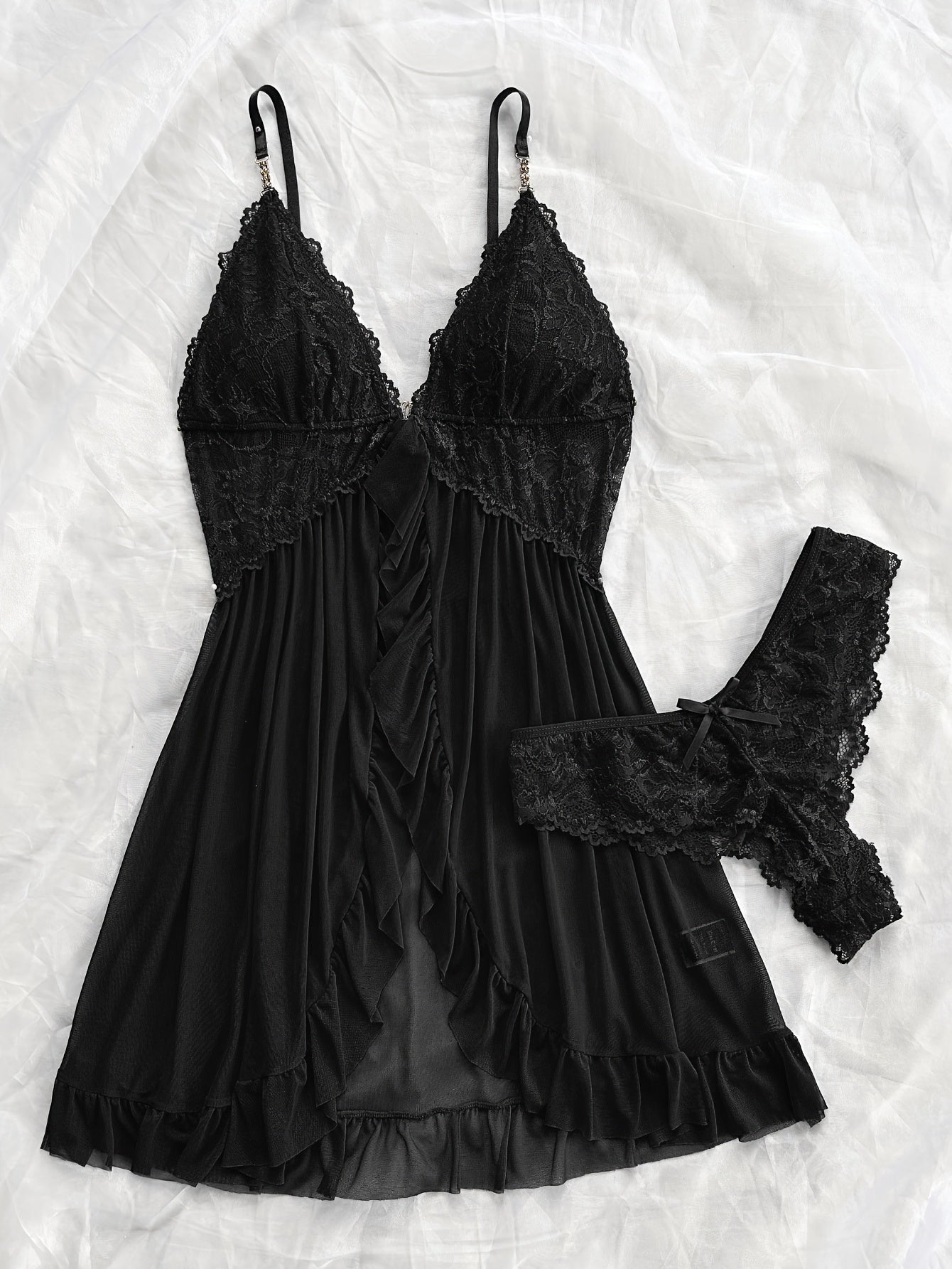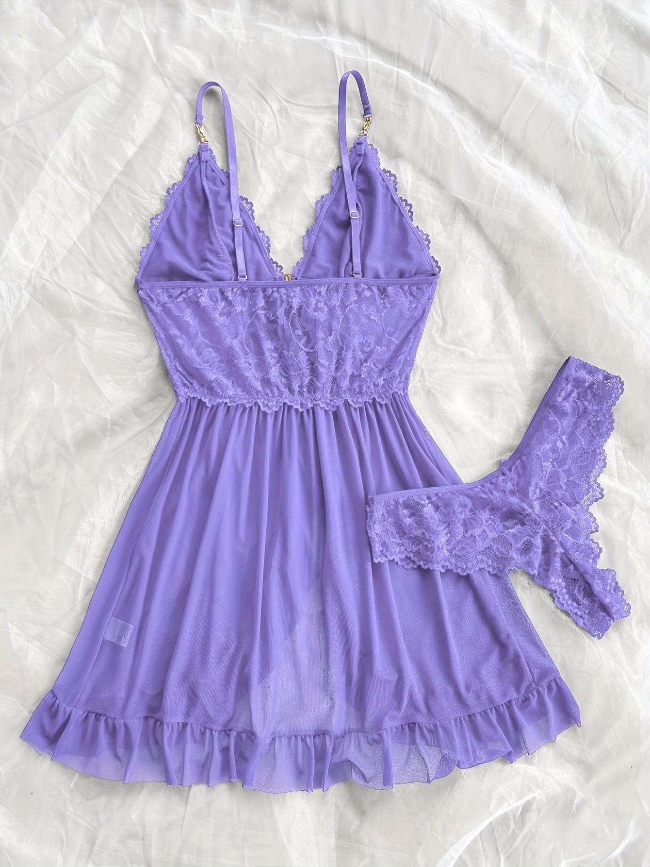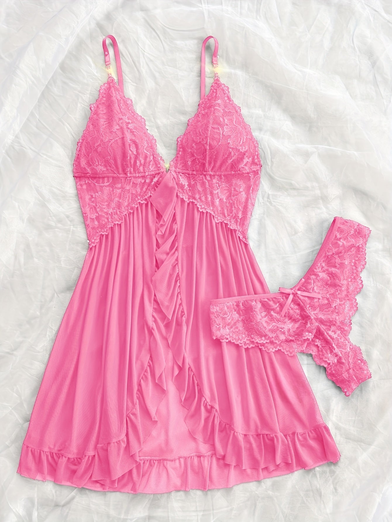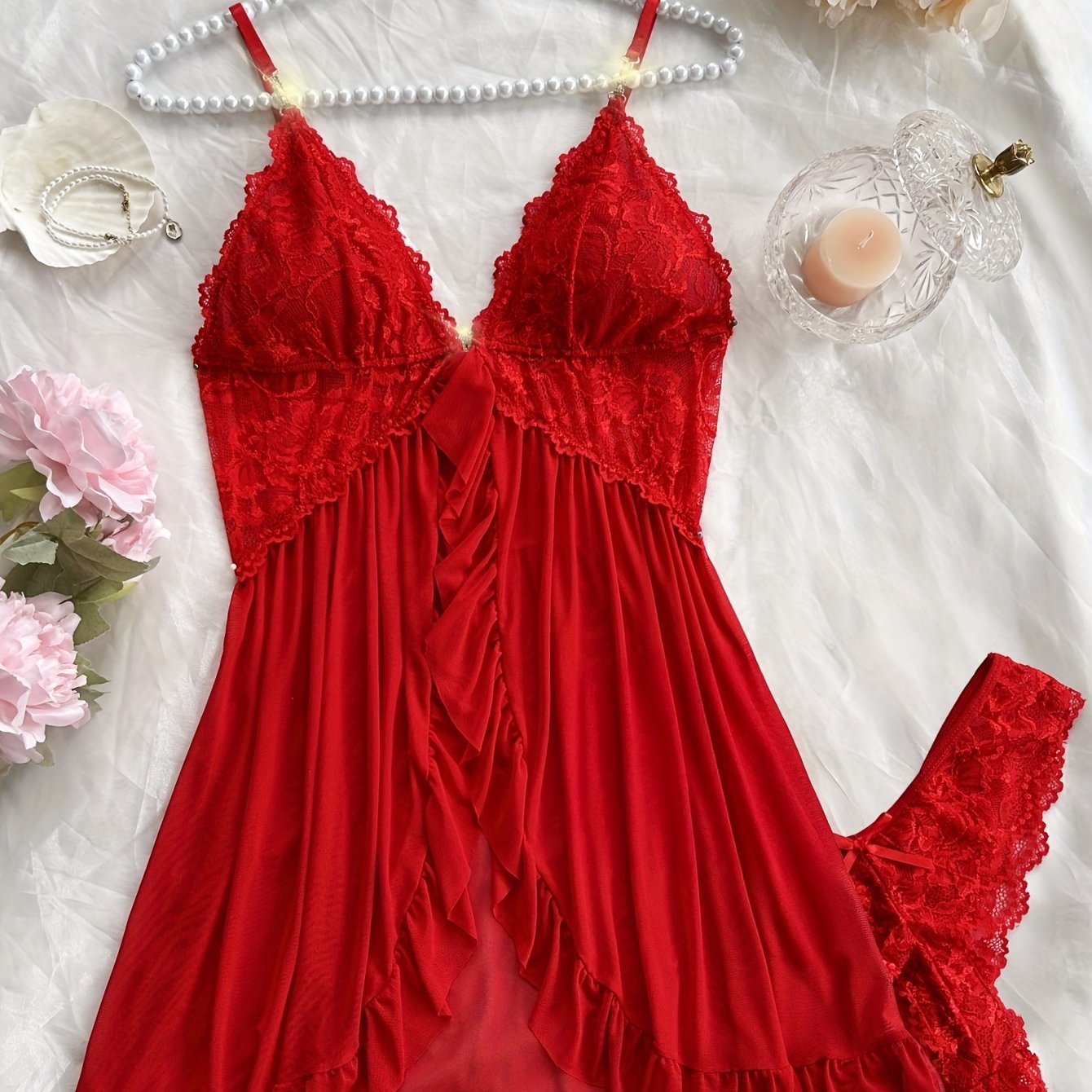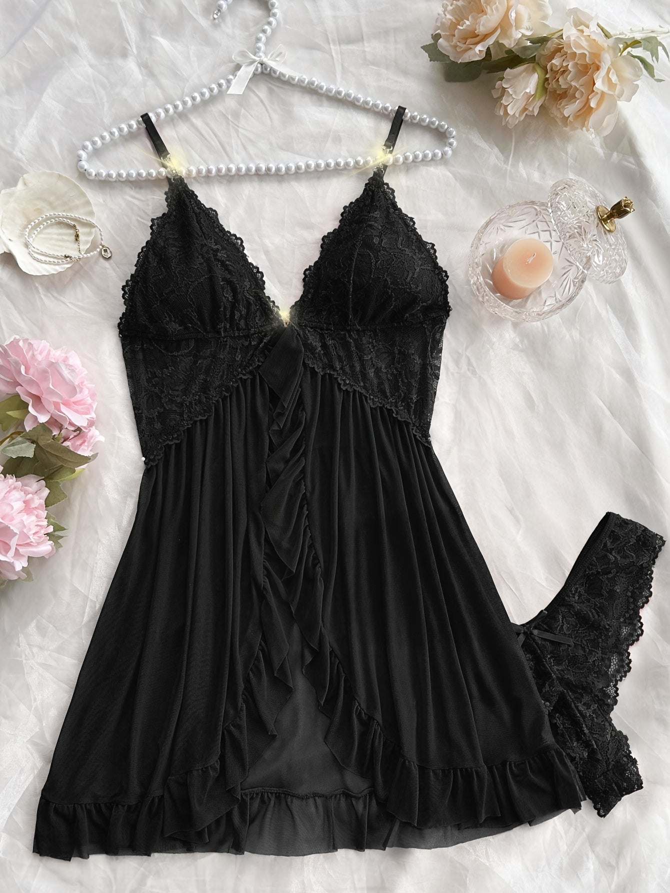 Sexy and Romantic Sleepwear Set, Solid Color Lace Camisole with Matching Panties, V-Neck Design Accentuating Elegant Neckline, Delicate Lace Pattern for Softness. Flared Hem and Ruffled Front Add Graceful Charm, Perfect for a