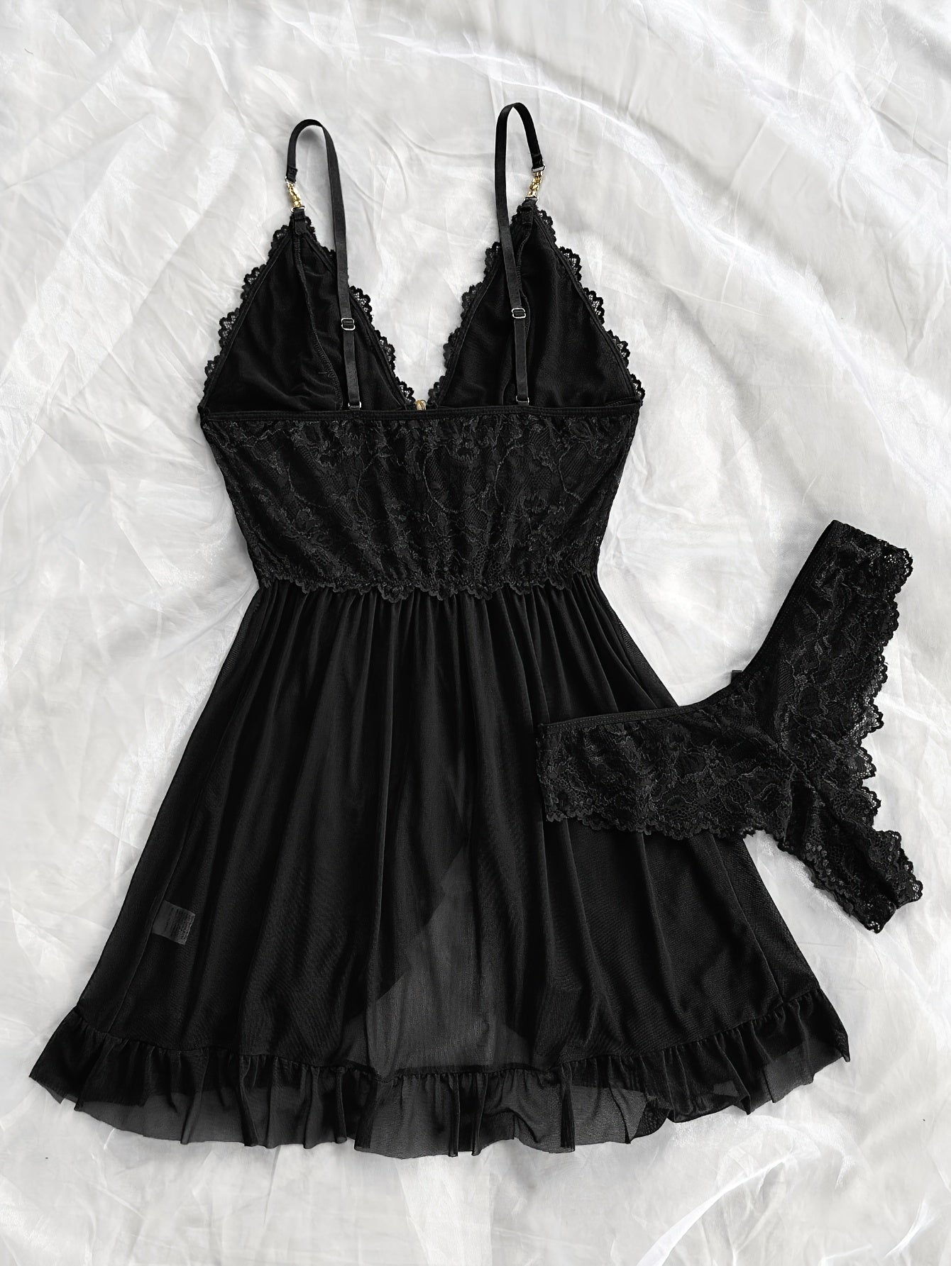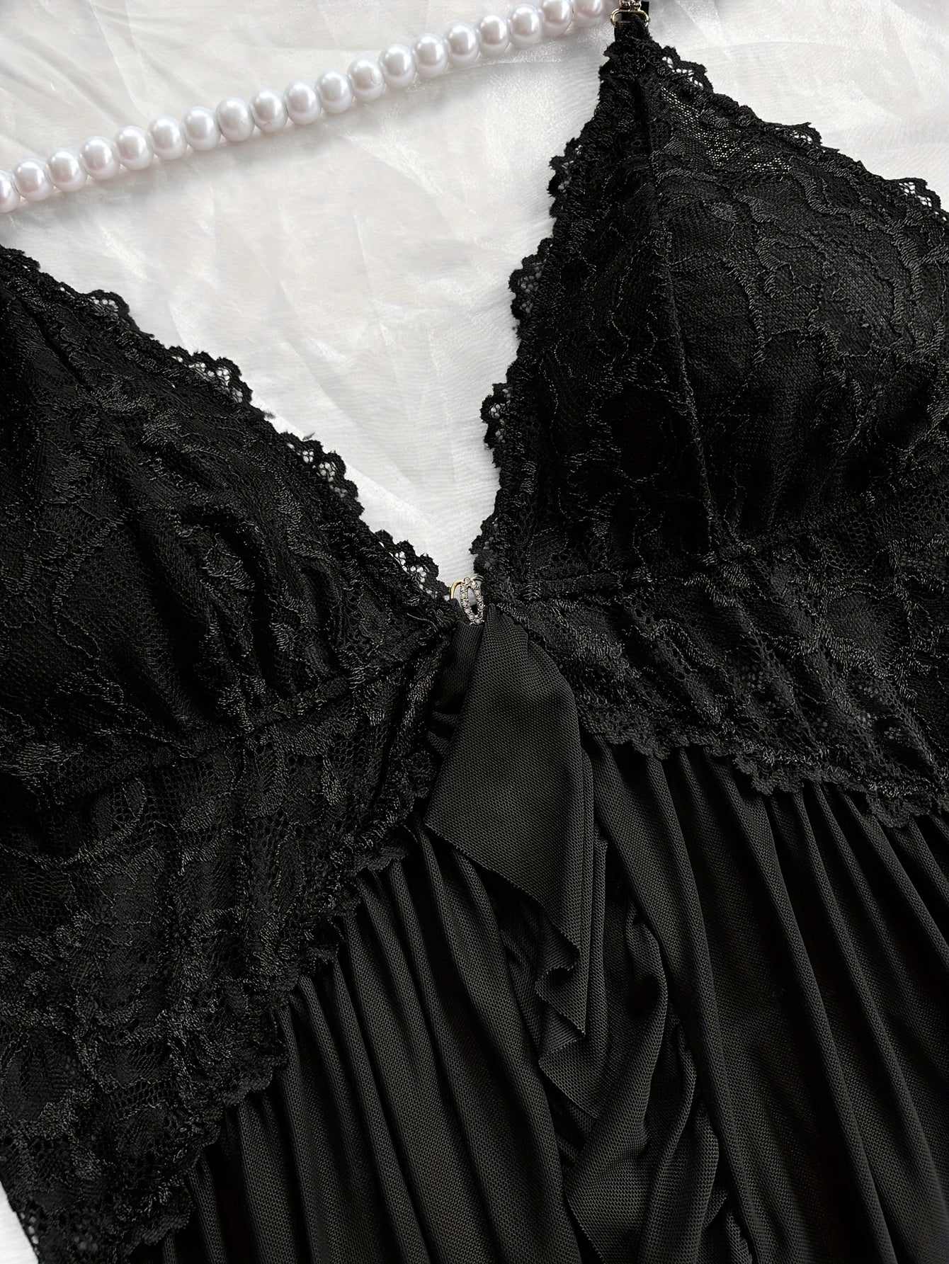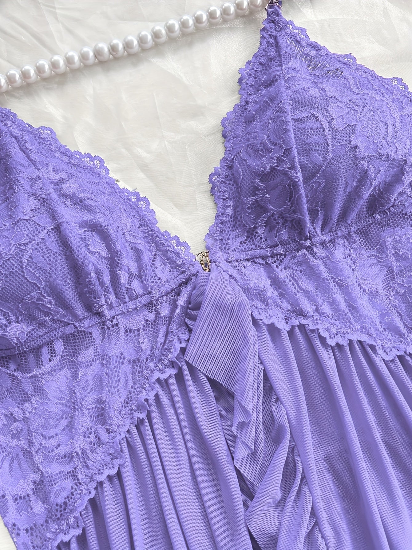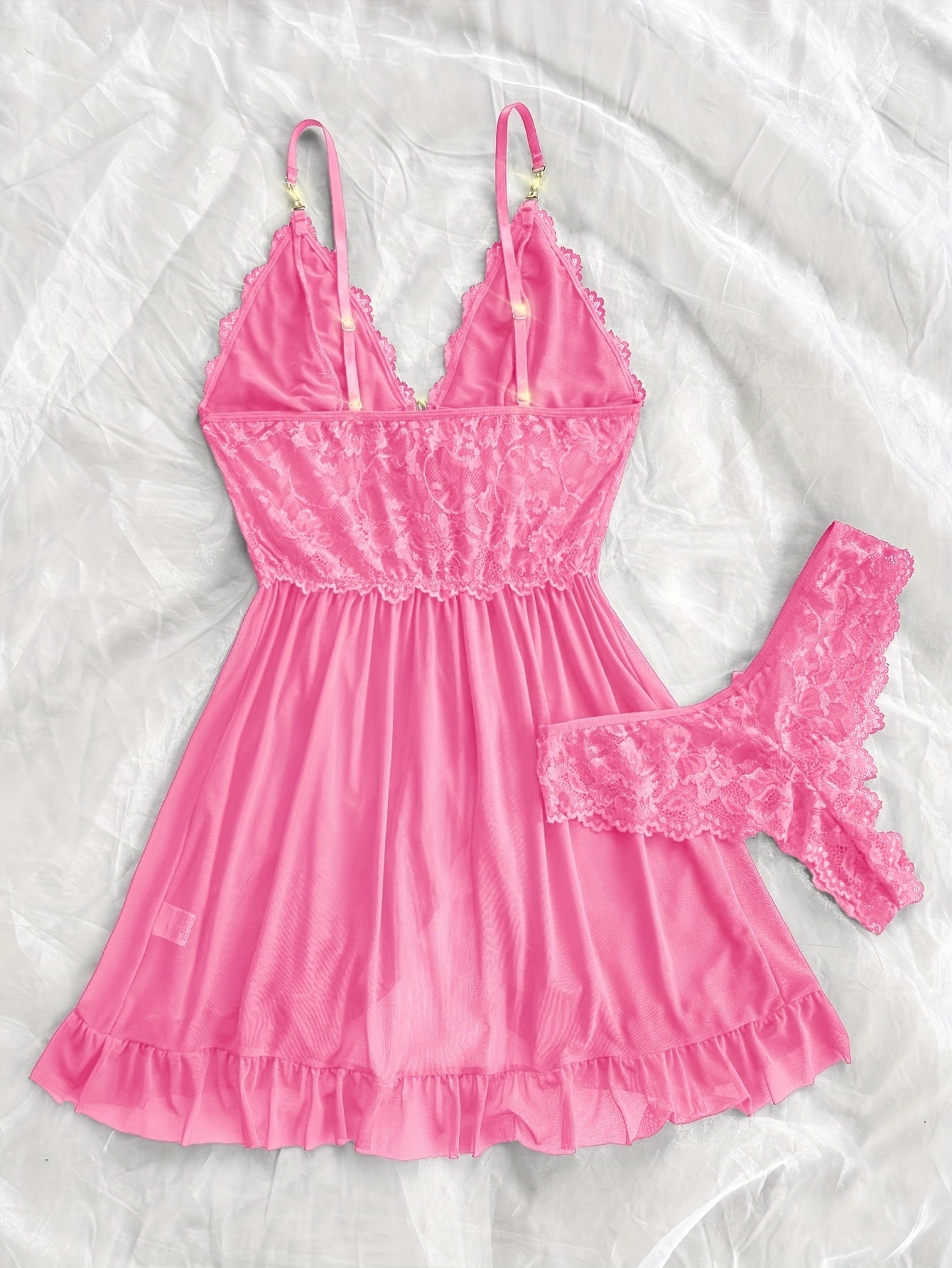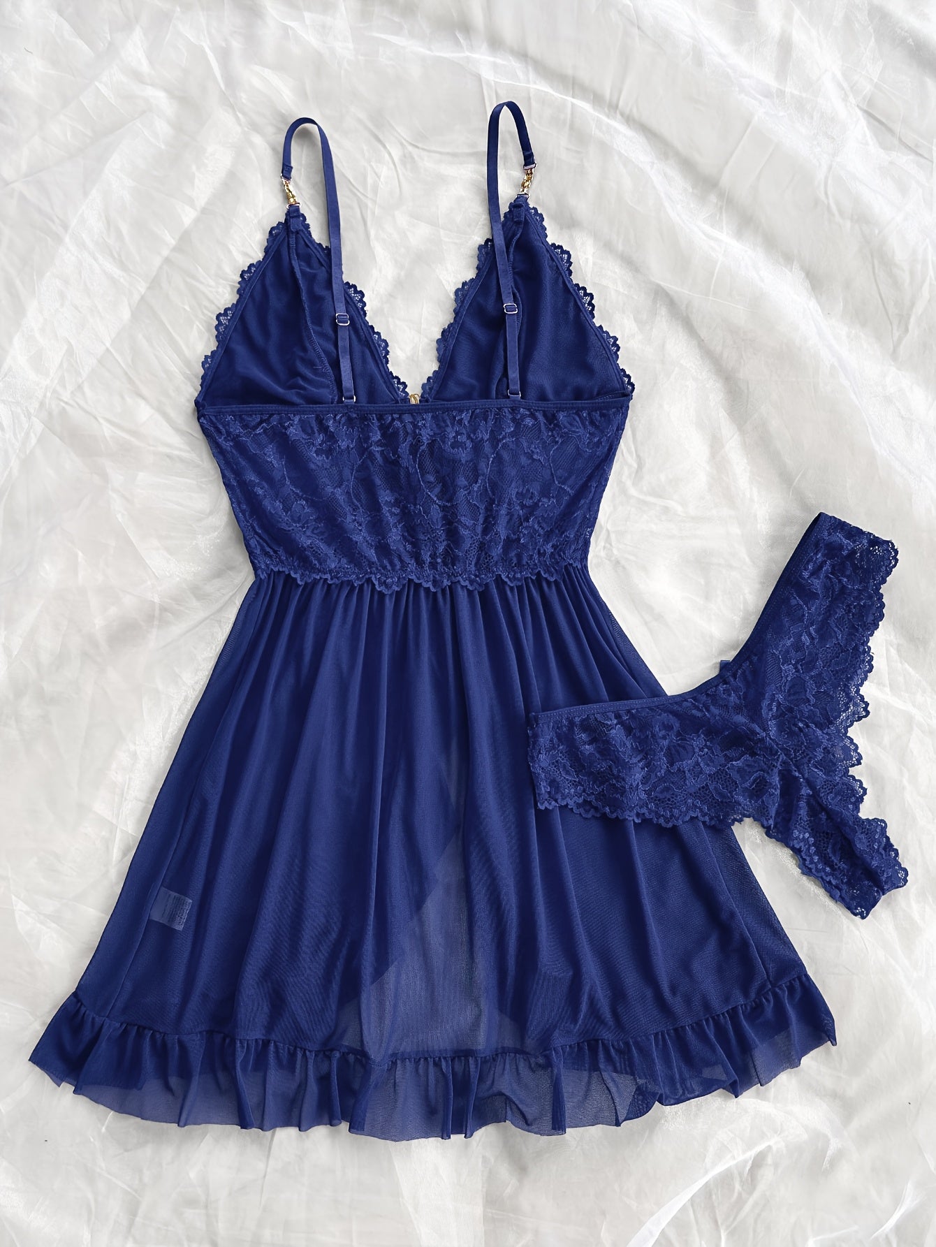 Sexy and Romantic Sleepwear Set, Solid Color Lace Camisole with Matching Panties, V-Neck Design Accentuating Elegant Neckline, Delicate Lace Pattern for Softness. Flared Hem and Ruffled Front Add Graceful Charm, Perfect for a