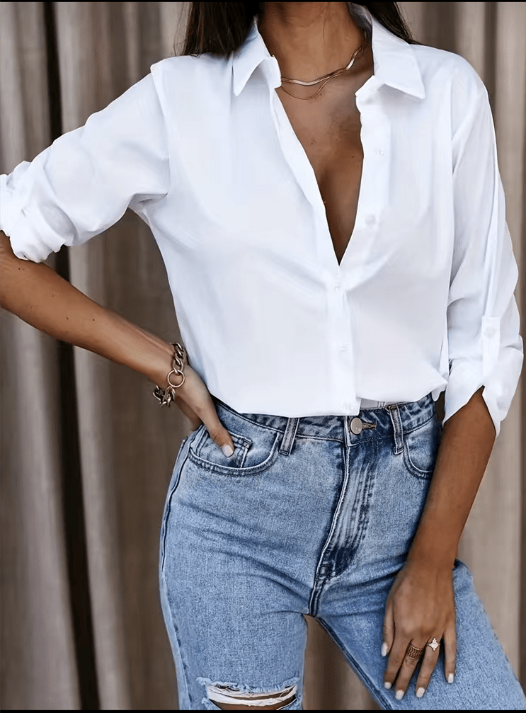 Միագույն ծալովի թևքերով վերնաշապիկ, առօրյա կոճակներով առջևի աշխատանքային, գրասենյակային վերնաշապիկ օձիքով, կանացի հագուստ