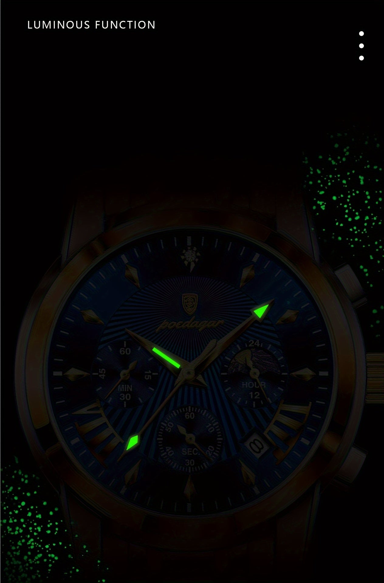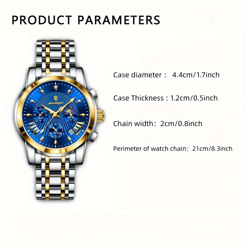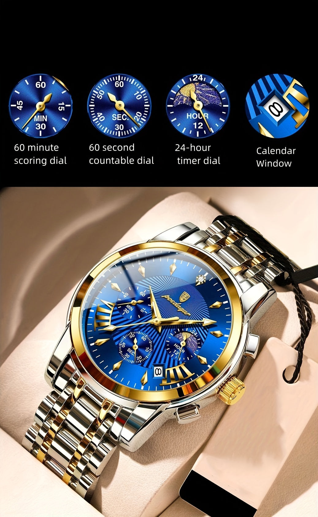 [Sophisticated Charm] Men's Multifunctional Fashion Watch - Waterproof Quartz Wristwatch with Chronograph, Stainless Steel Band, Blue Dial & Golden Accents, Ideal Gift for Men, Casual Timepiece|Contemporary Watch|Golden Accen