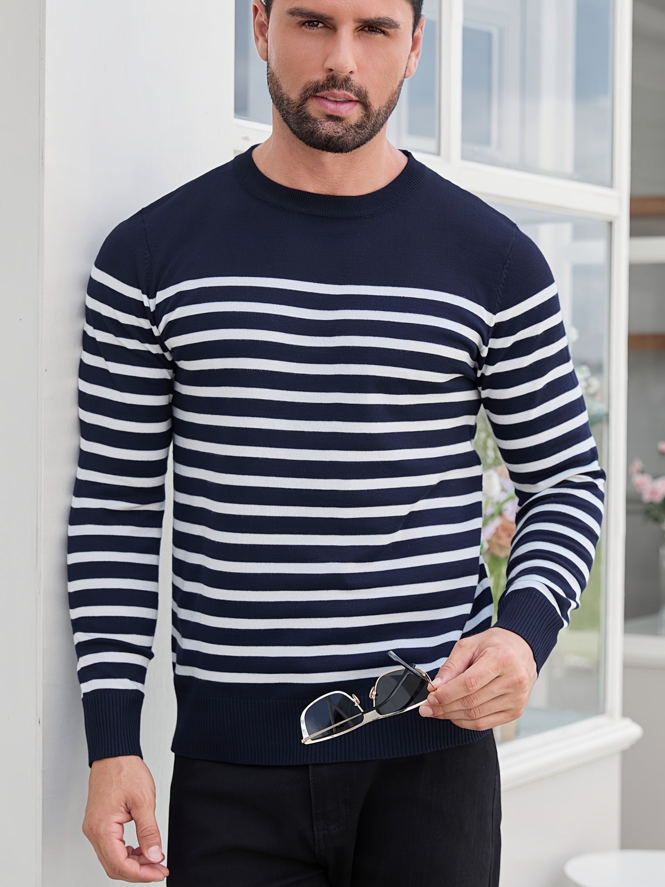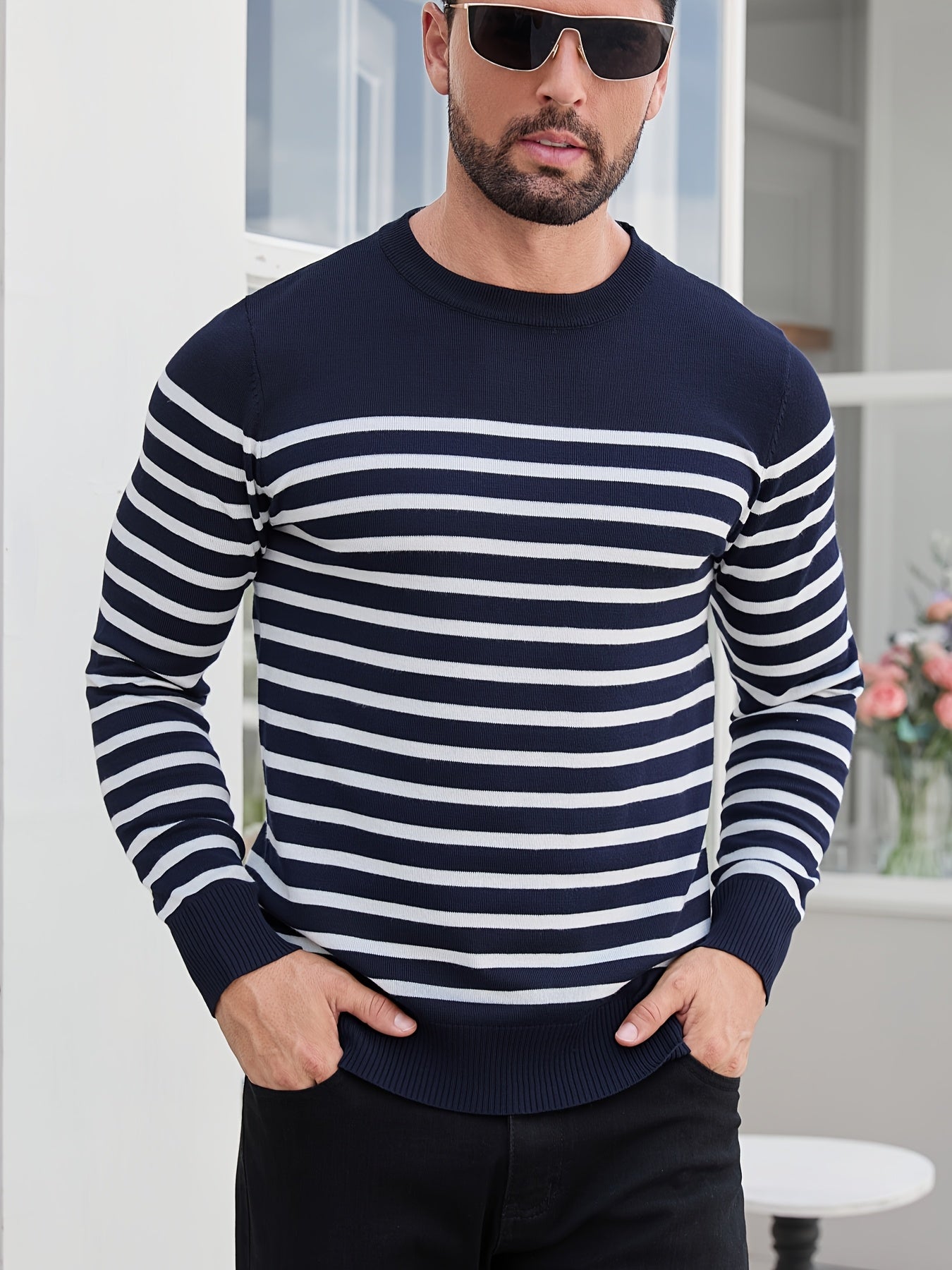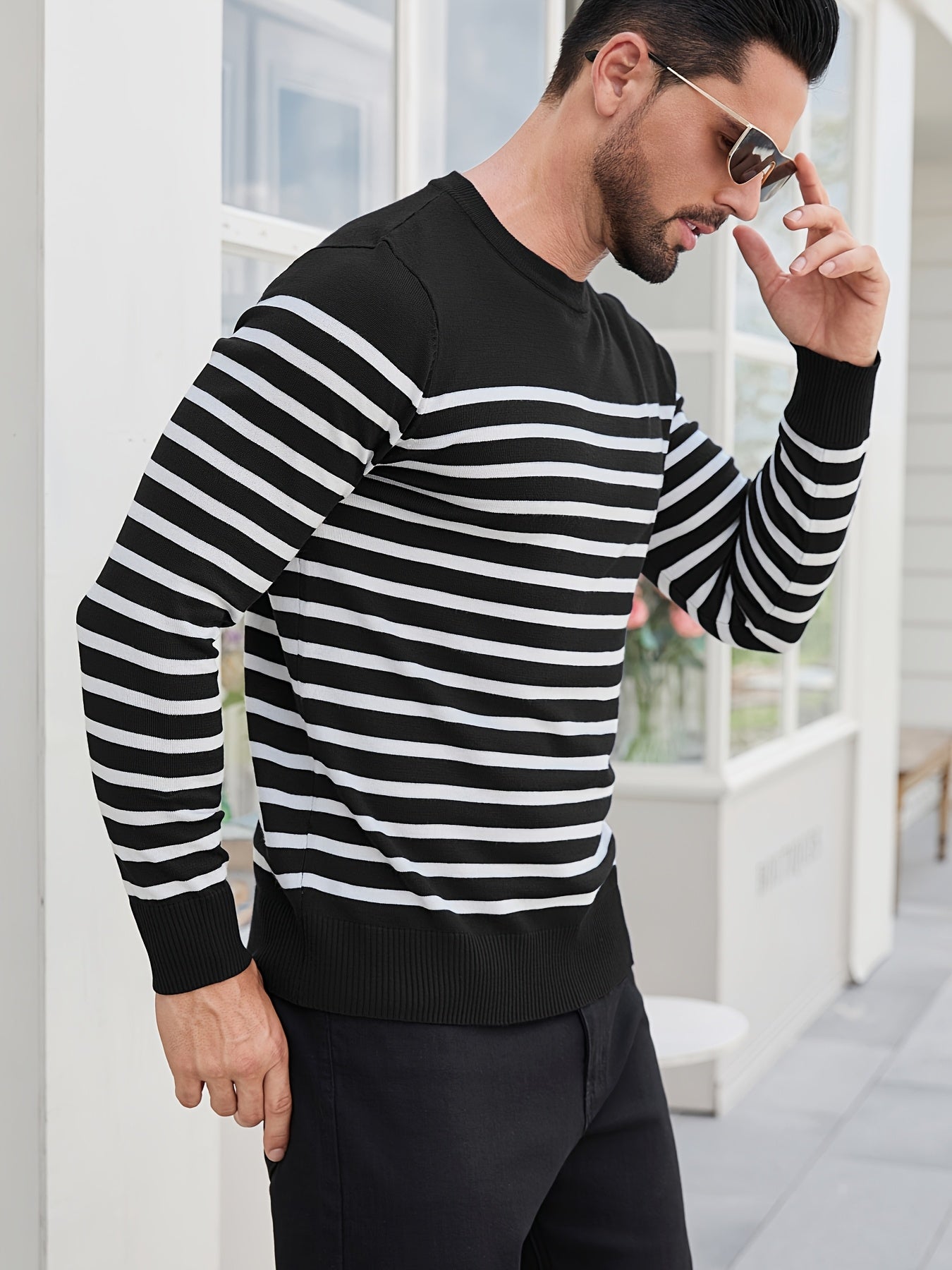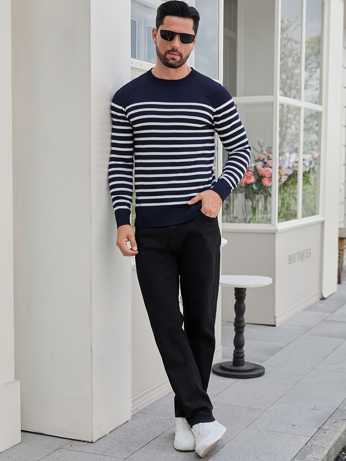 Գարնանային և աշնանային ամենօրյա երկգույն գծավոր տղամարդու սվիտեր-պուլովեր՝ գունավոր բլոկներով, կլոր վզնոցով, տղամարդու տրիկոտաժե վերնաշապիկ