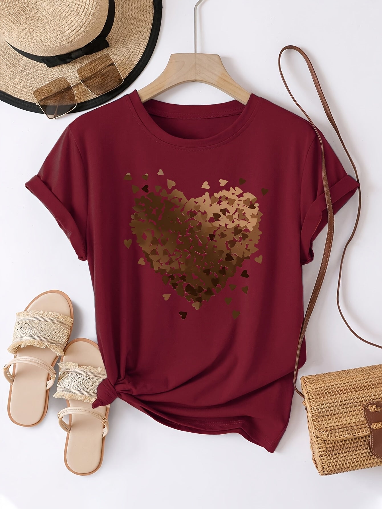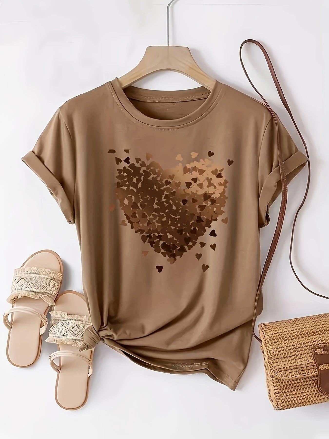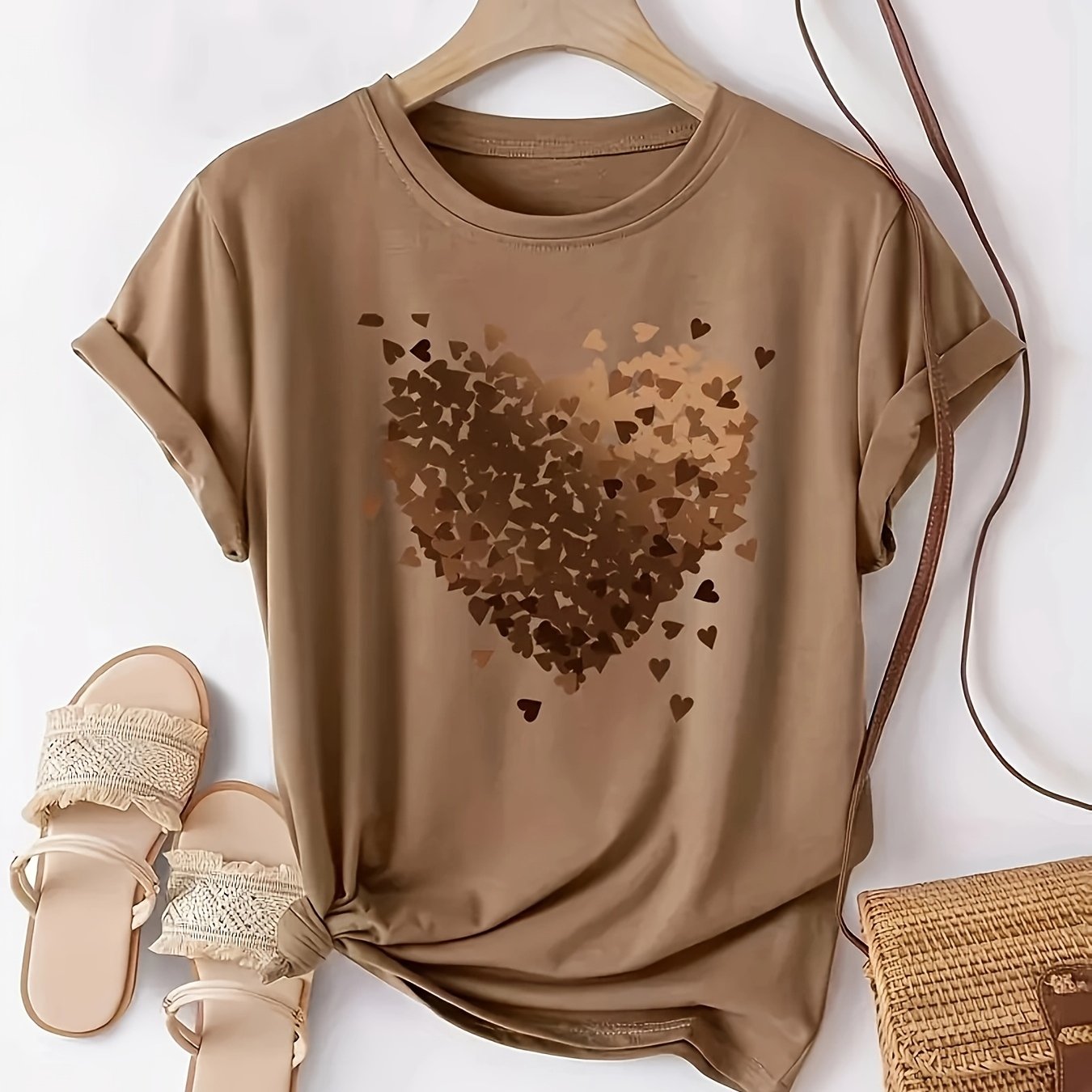 Նորաոճ շագանակագույն գրադիենտ սրտային պրինտ շապիկ - 100% պոլիեսթեր, կլոր պարանոց, կարճ թեւ, սպորտային թիկնոց կանանց համար - լվացվող մեքենայում, կատարյալ գարուն/ամառ նորաձևության համար