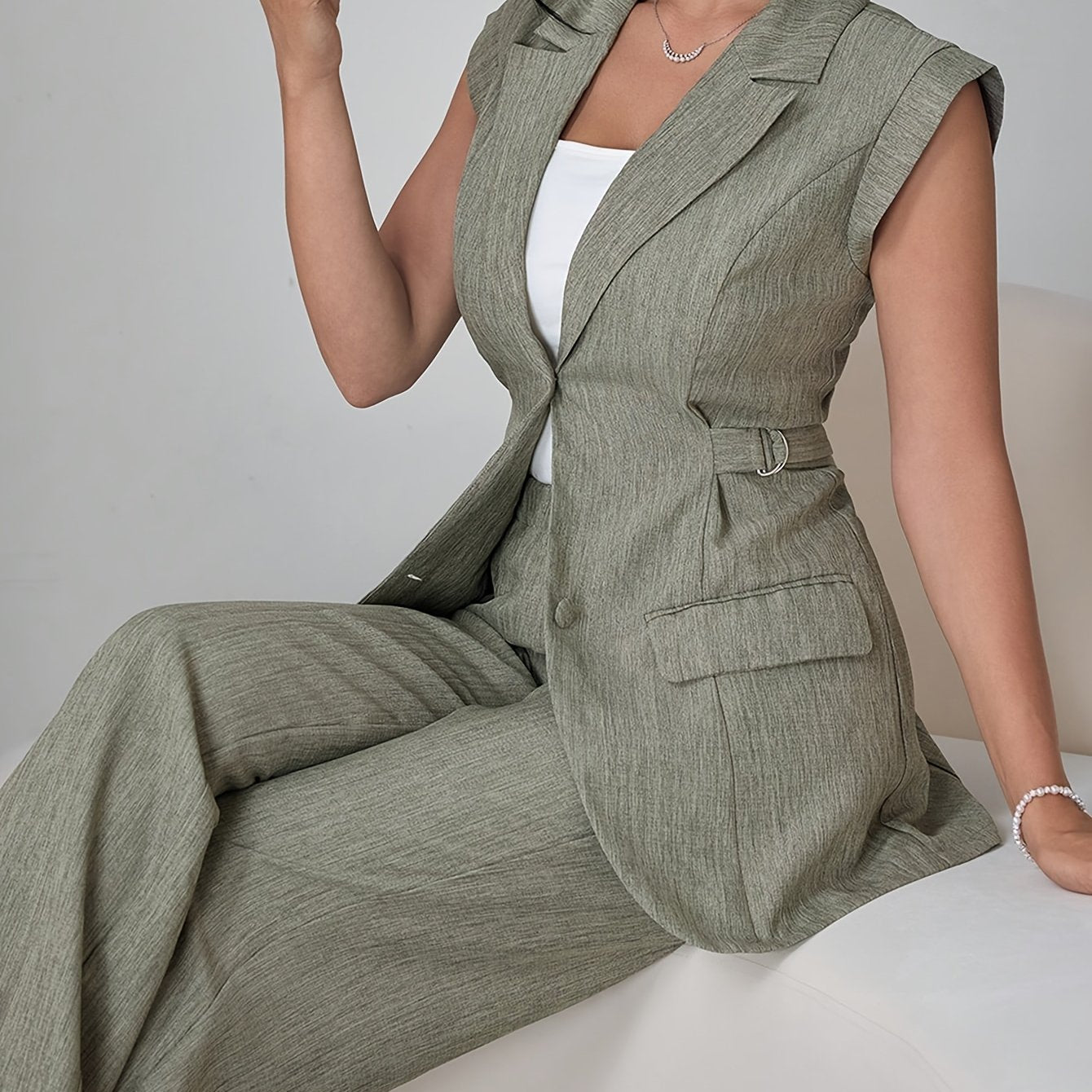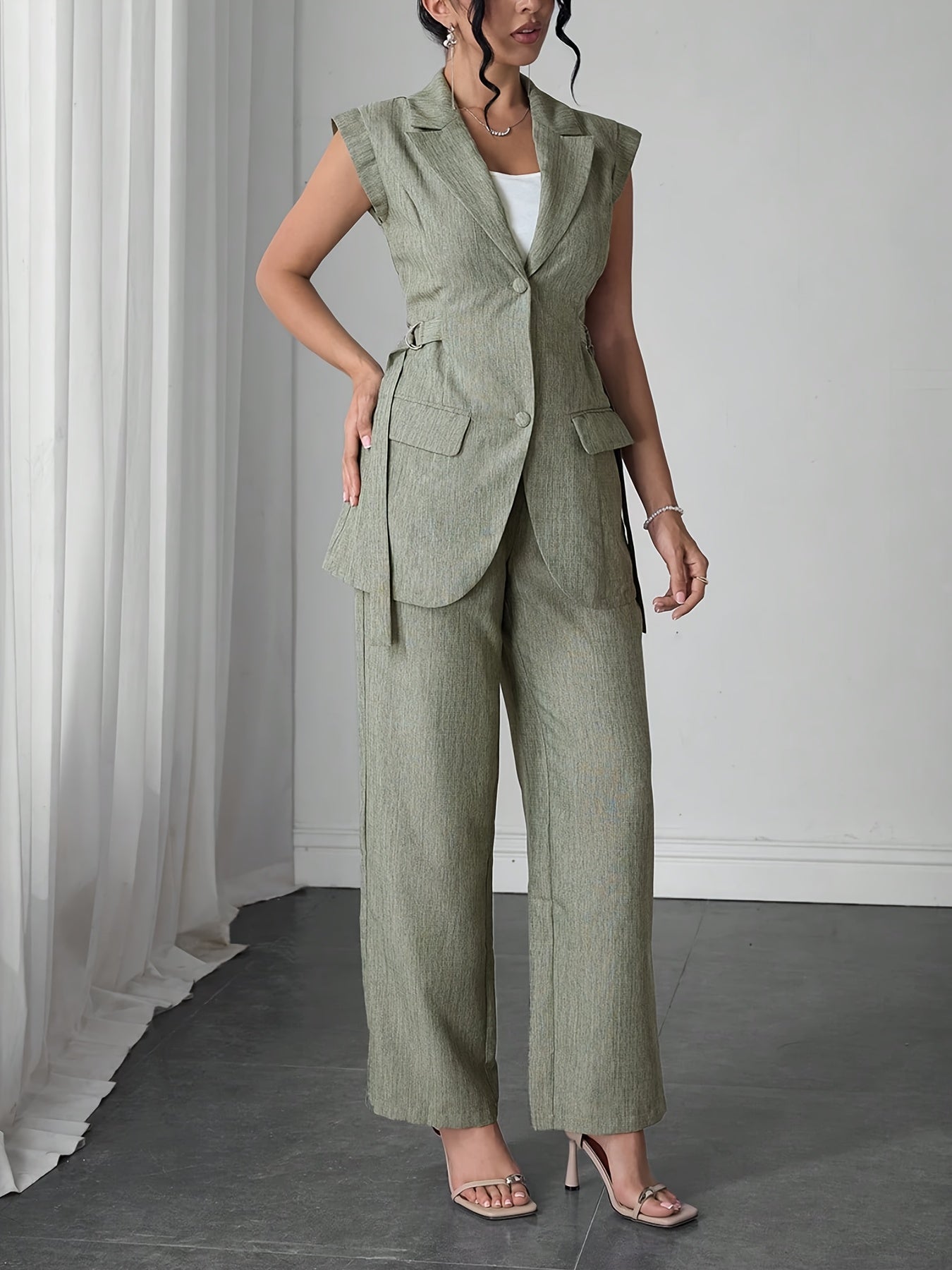 Կանացի նորաձև, էլեգանտ, ժամանակակից, կողային փողկապով դիզայնով, երկու կտորից բաղկացած, գարուն-ամառային միագույն, անթև բաճկոնի և տաբատի հավաքածու