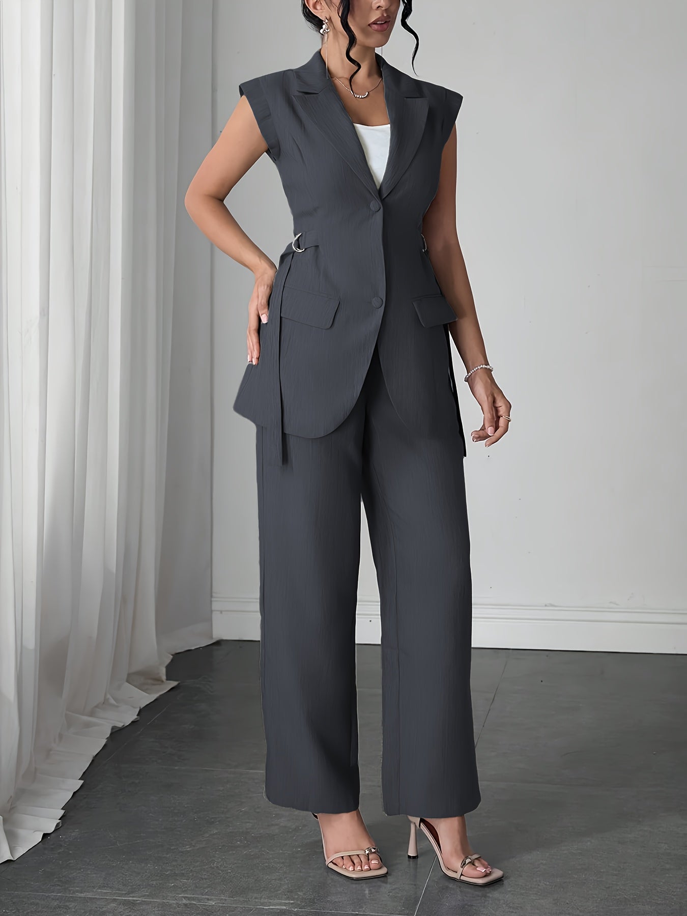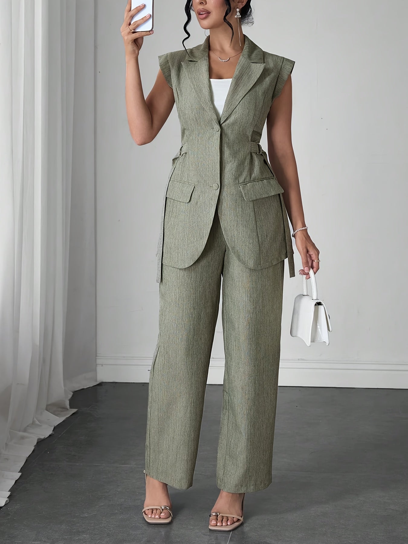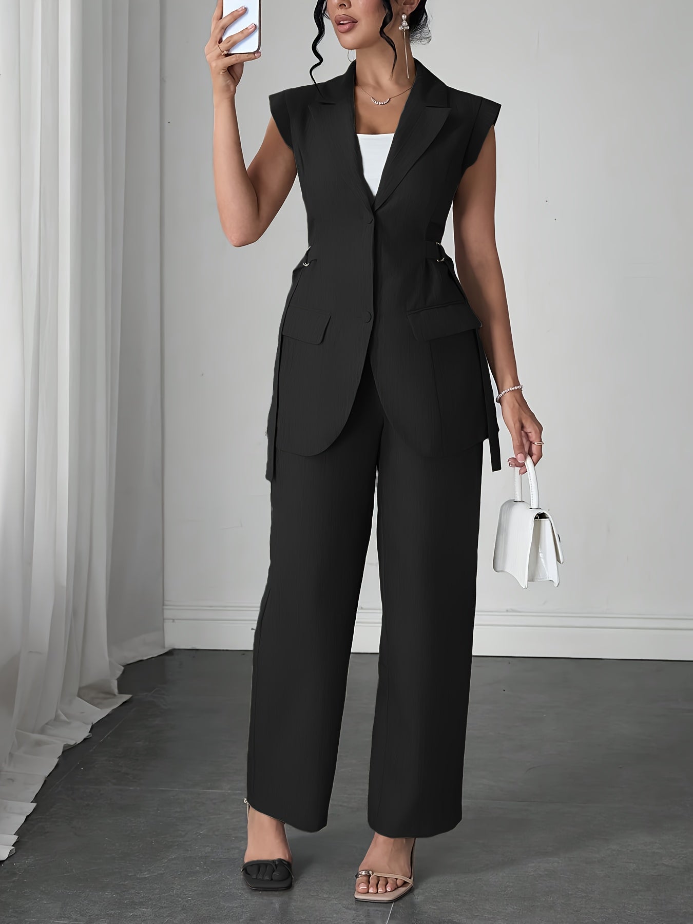 Գարուն/ամառվա նորաձև կանացի, էլեգանտ, ժամանակակից, երկկտոր հավաքածու՝ կողային գոտկատեղի դիզայնով, միագույն անթև բաճկոն և տաբատ